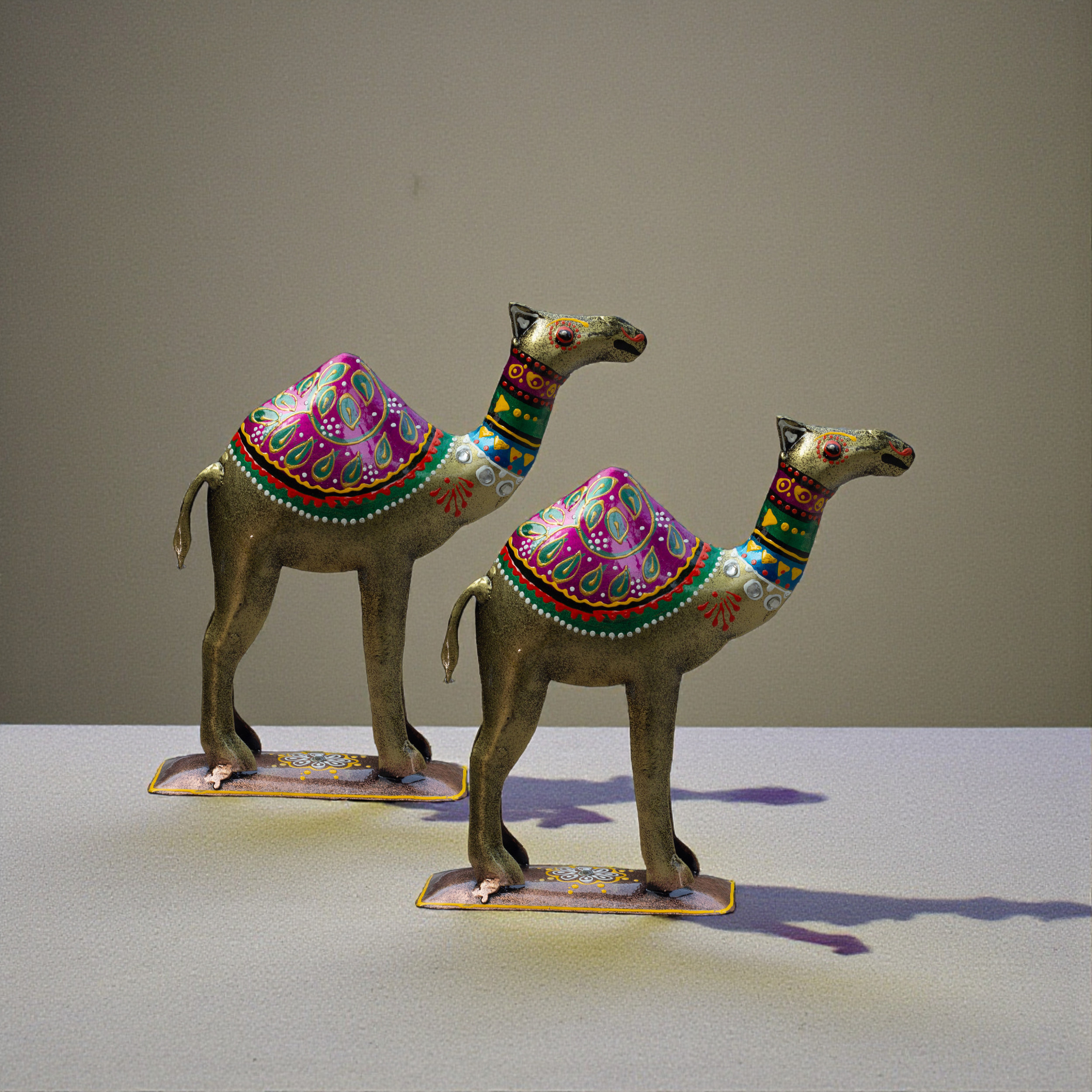 Each camel stands 7 inches tall and 7 inches long, mounted on a painted metal base measuring 4.5 x 2 inches — sturdy, stable and display-ready right out of the box. The intricate hand-painted Rajasthani artwork featuring peacock motifs, geometric patterns, and dot work in magenta, teal, yellow and gold makes every piece one of a kind.
