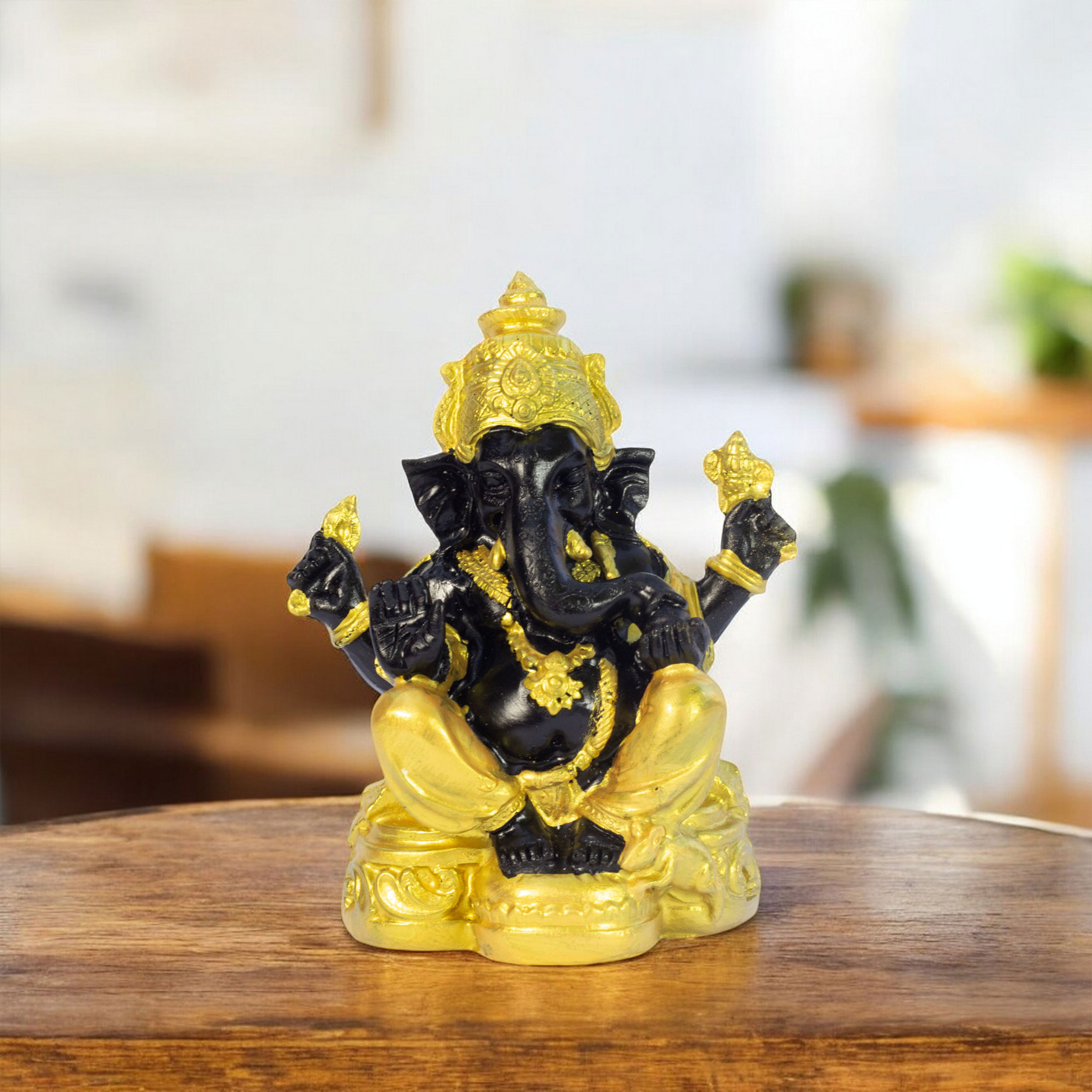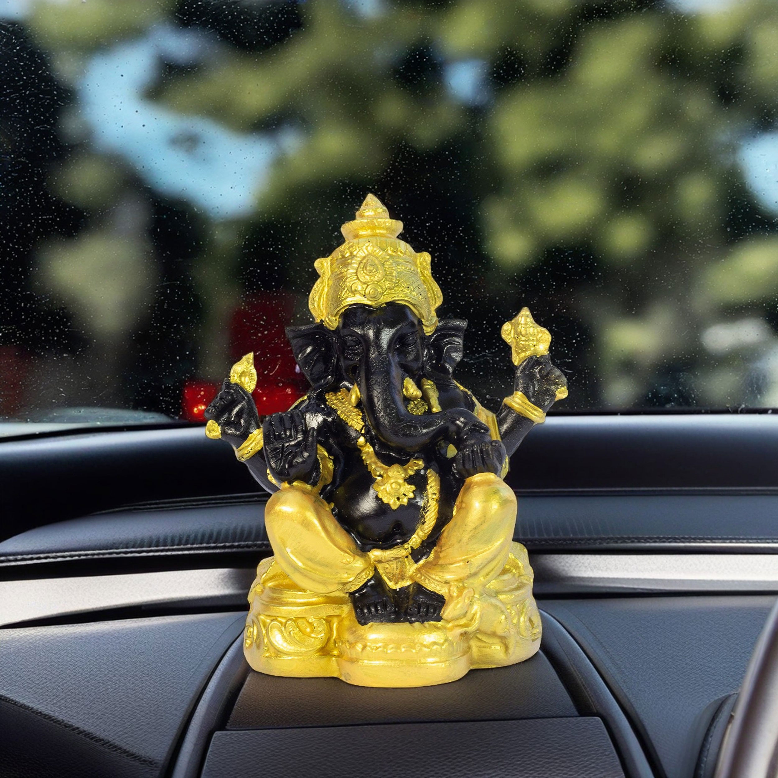 Add a touch of divine energy to your car, home, or workspace with this beautifully crafted 5-inch Lord Ganesha showpiece. Featuring a striking black and gold finish, this statue symbolizes wisdom, prosperity, and protection.