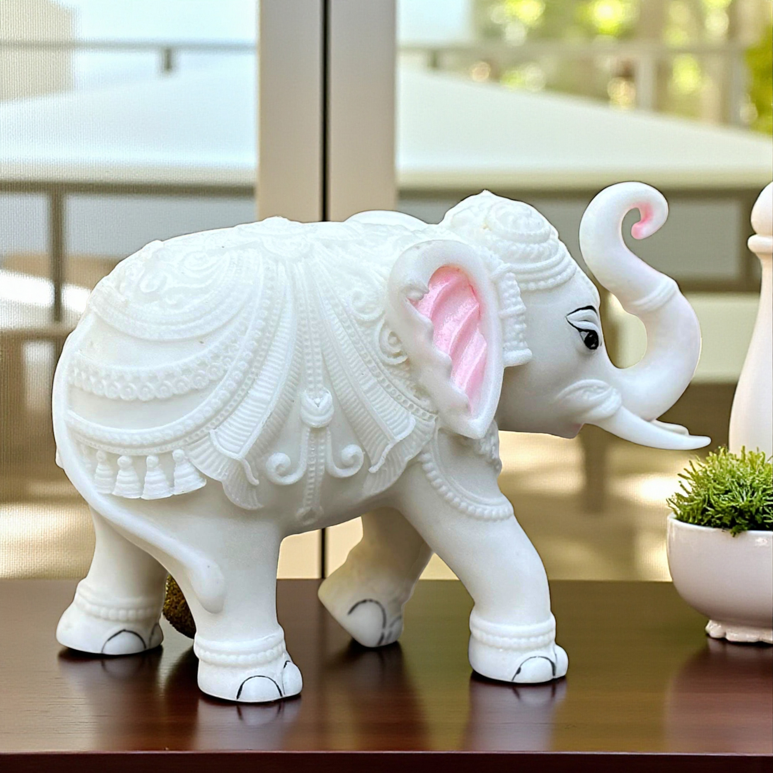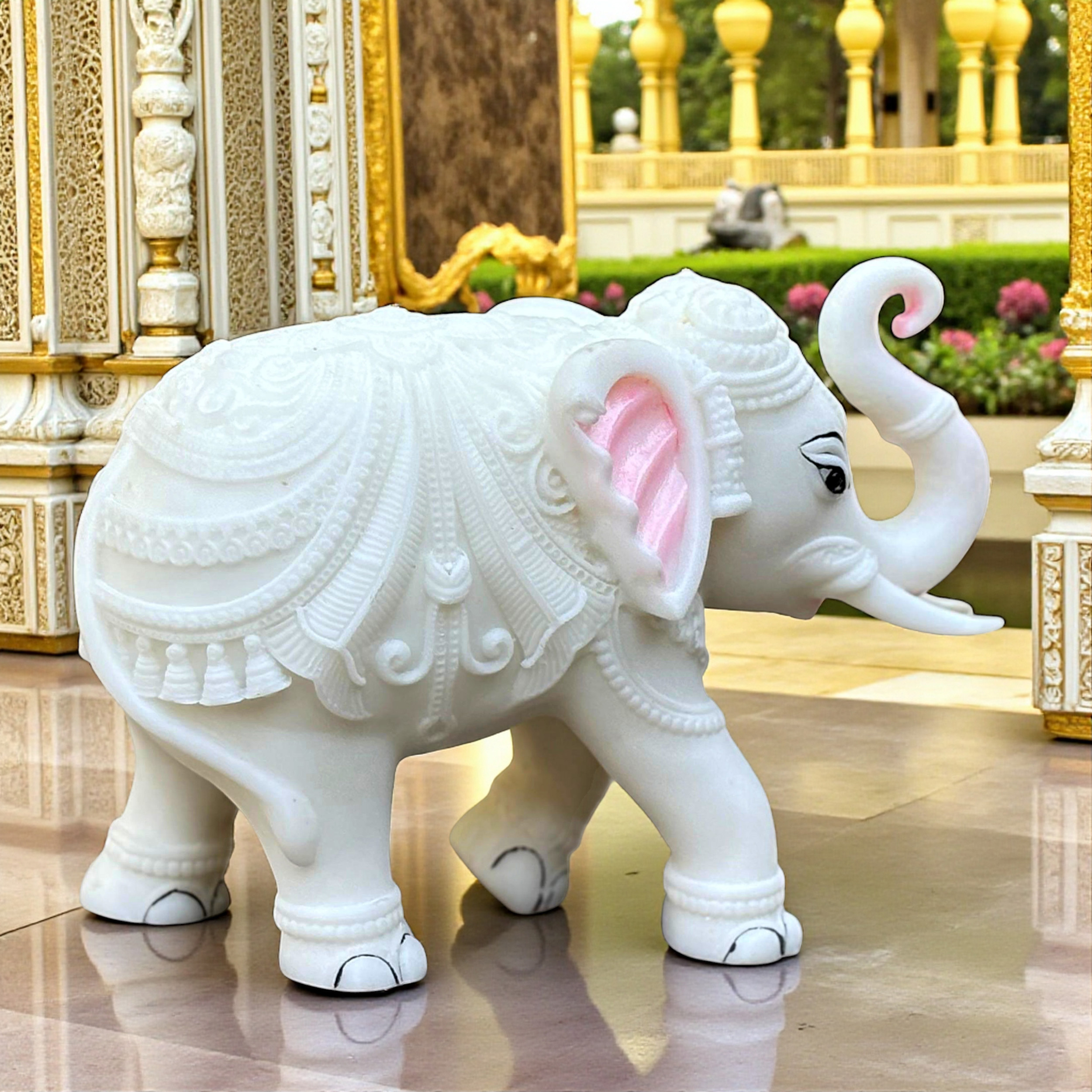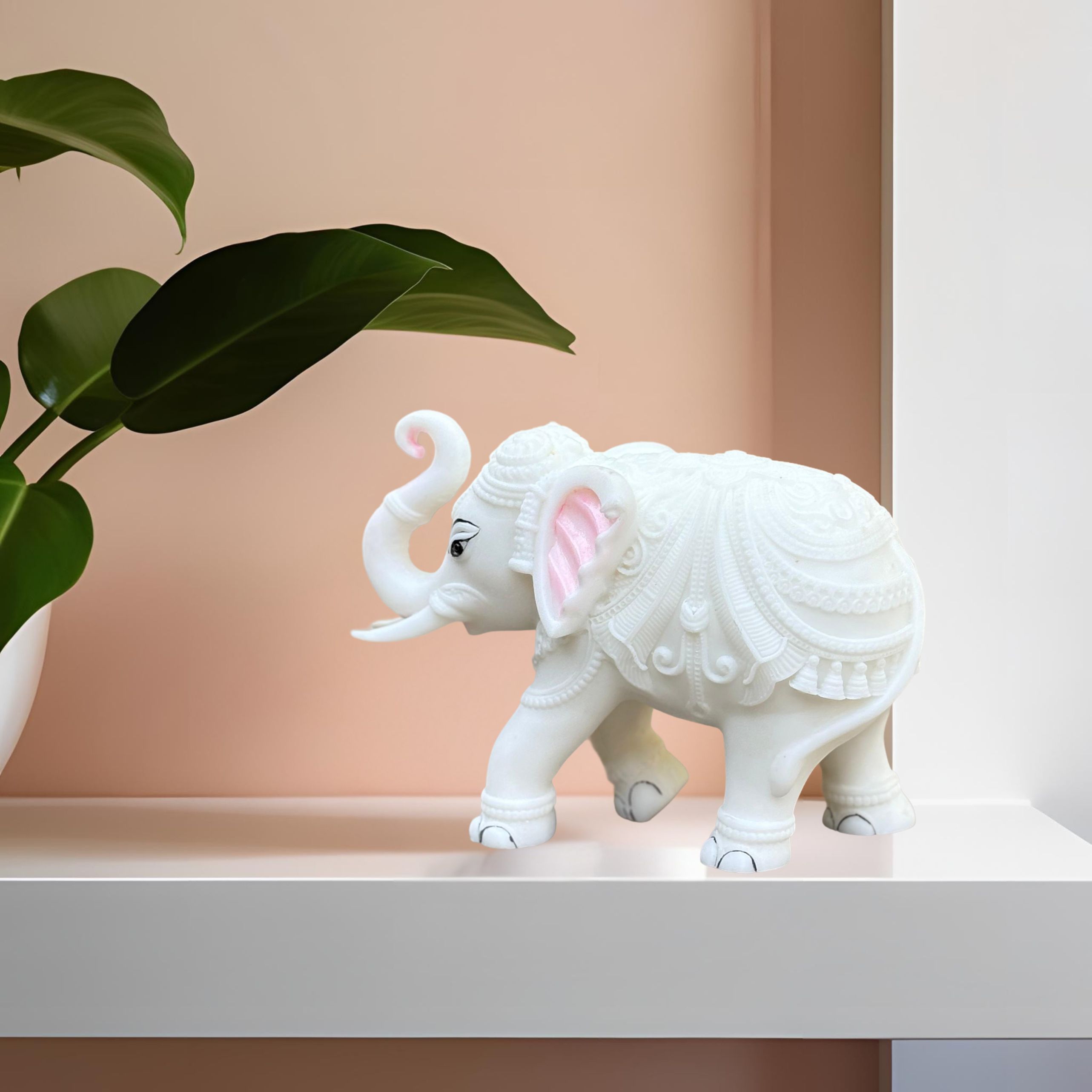 Every inch of this figurine features intricate, hand-carved detailing, a testament to the skilled artisans who bring this beautiful piece to life. The majestic Trunk Up Design is not just decorative; it is a powerful symbol in Vastu Shastra and Feng Shui. The raised trunk is believed to invite good fortune, positive energy, victory, and divine blessings (Shubh Labh) into the home or office, making it a powerful talisman for prosperity and protection. The white colour symbolizes purity, royalty, and new beginnings.