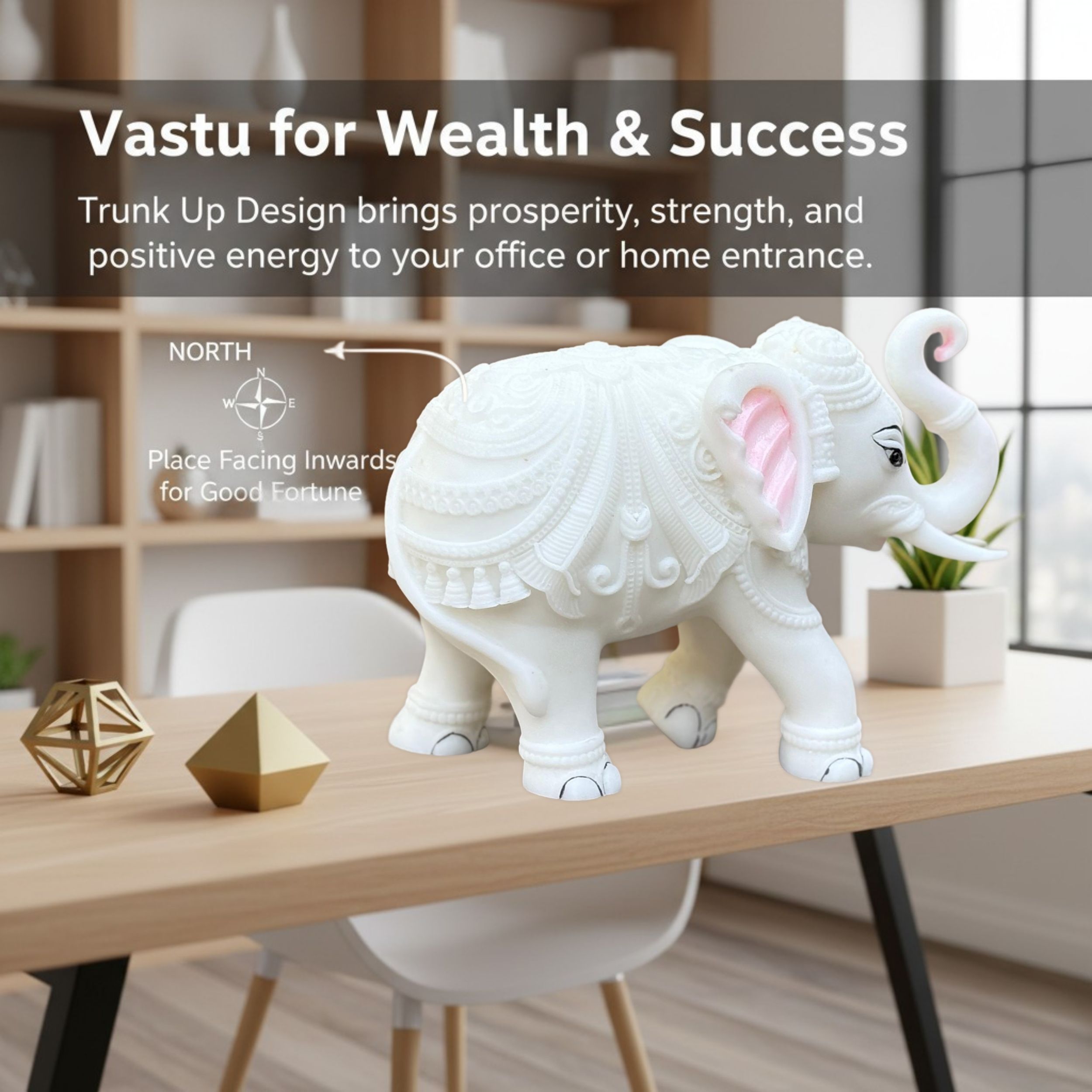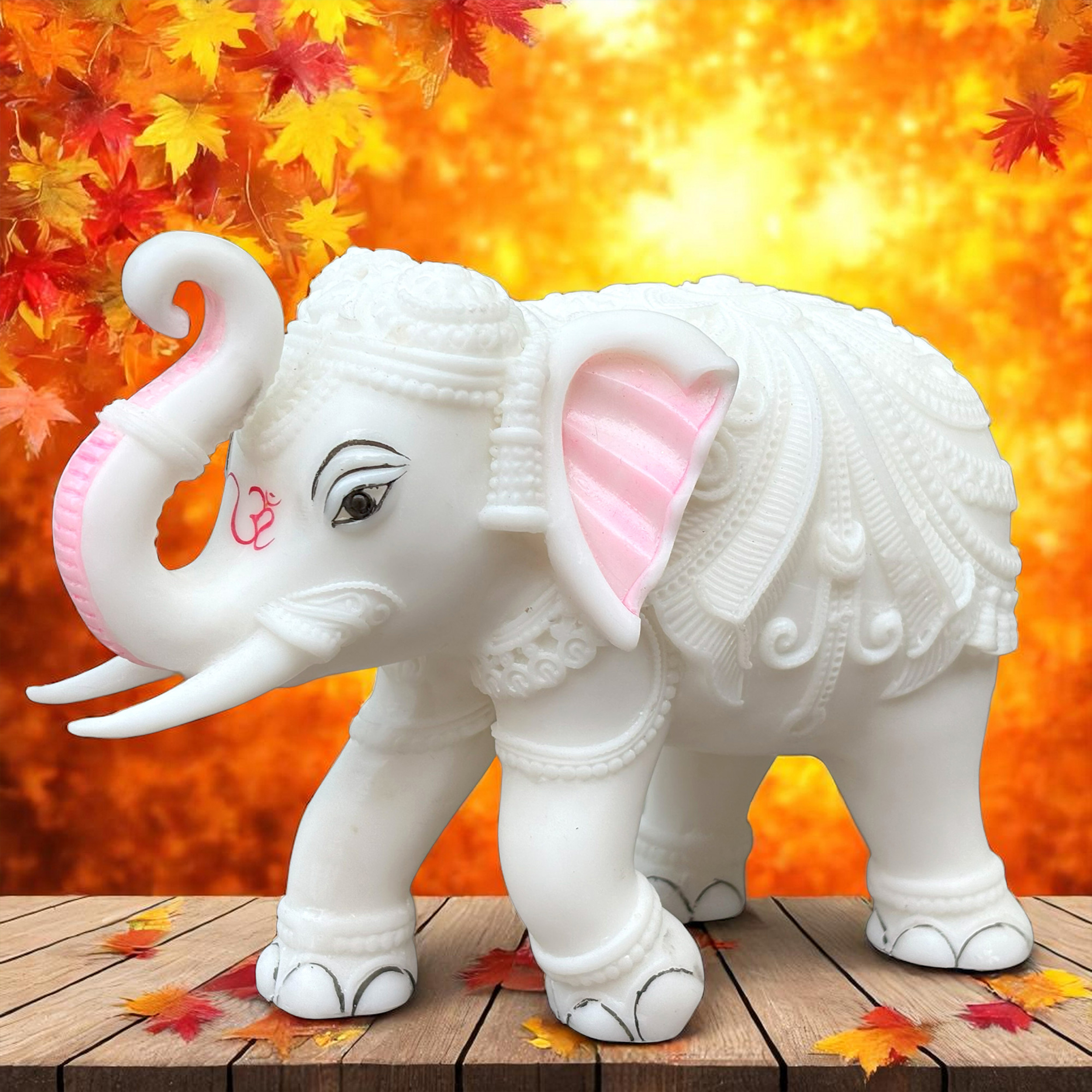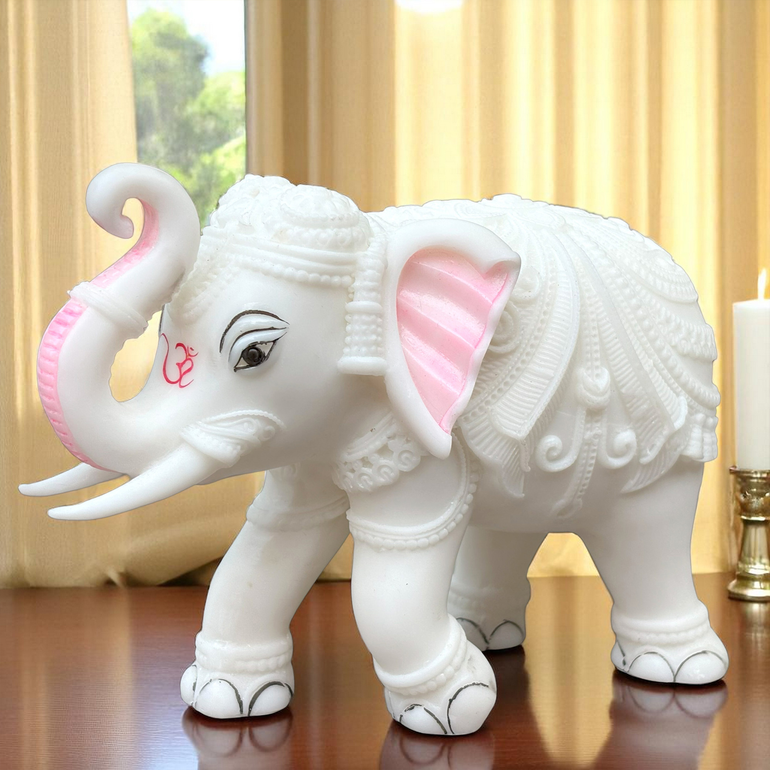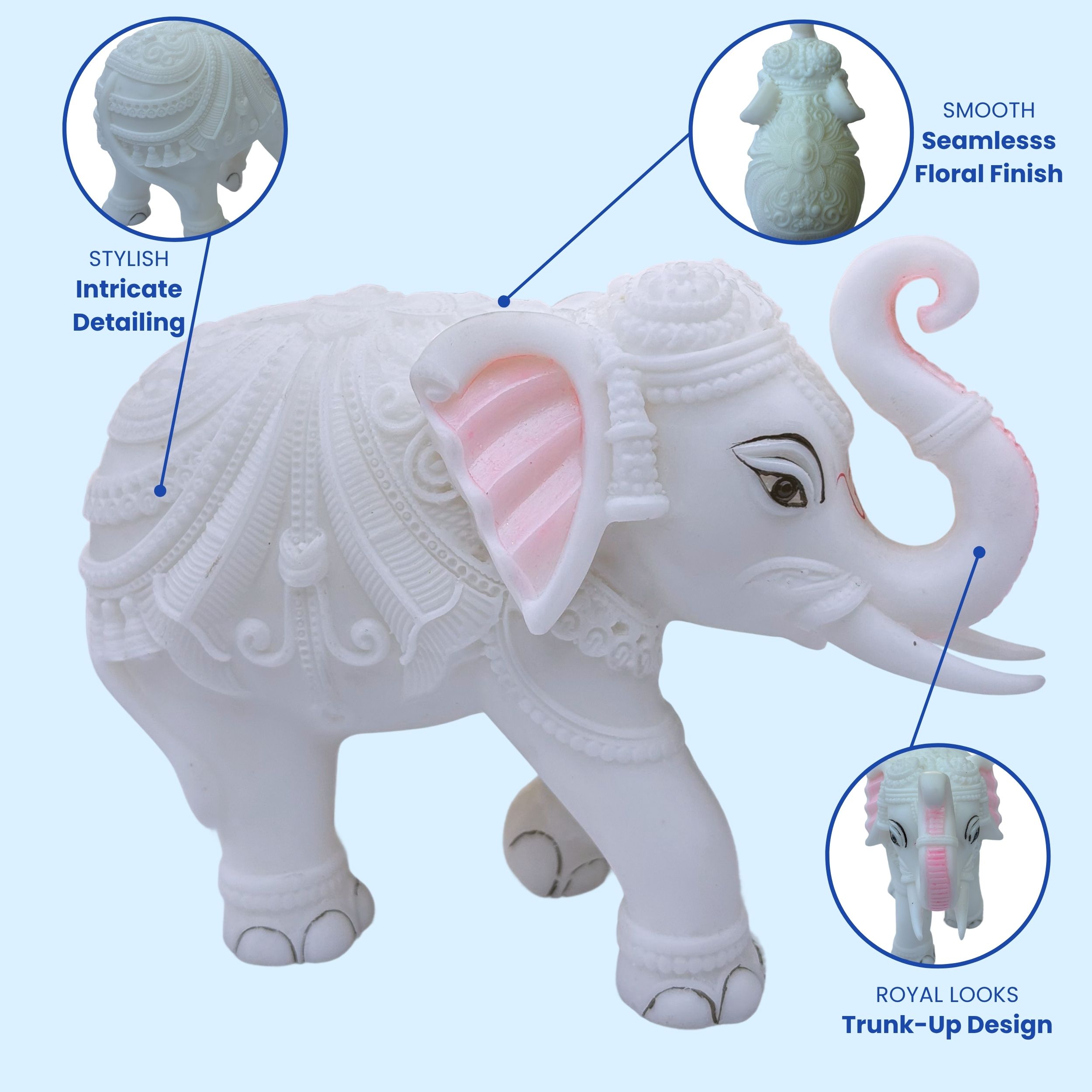 Every inch of this figurine features intricate, hand-carved detailing, a testament to the skilled artisans who bring this beautiful piece to life. The majestic Trunk Up Design is not just decorative; it is a powerful symbol in Vastu Shastra and Feng Shui. The raised trunk is believed to invite good fortune, positive energy, victory, and divine blessings (Shubh Labh) into the home or office, making it a powerful talisman for prosperity and protection. The white colour symbolizes purity, royalty, and new beginnings.