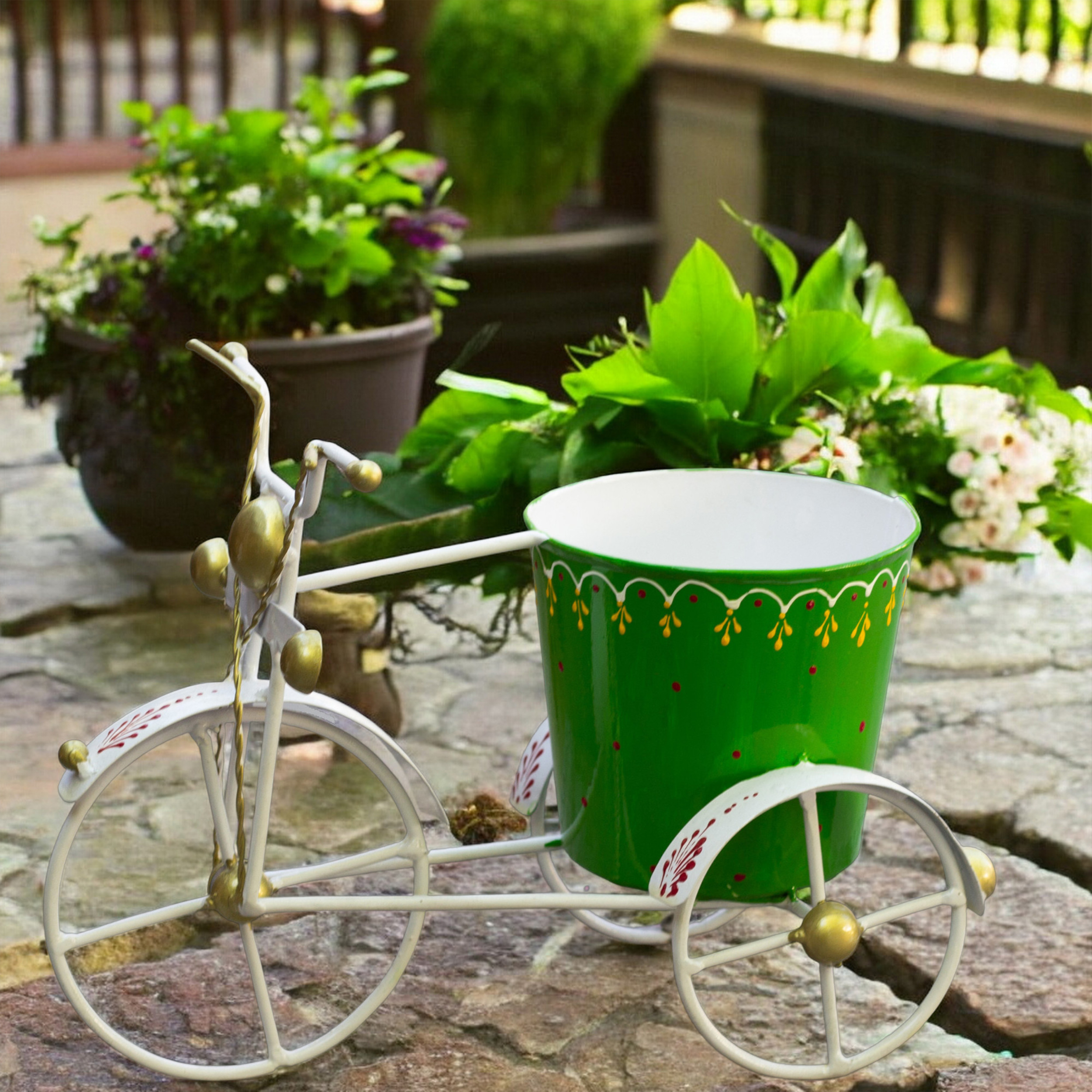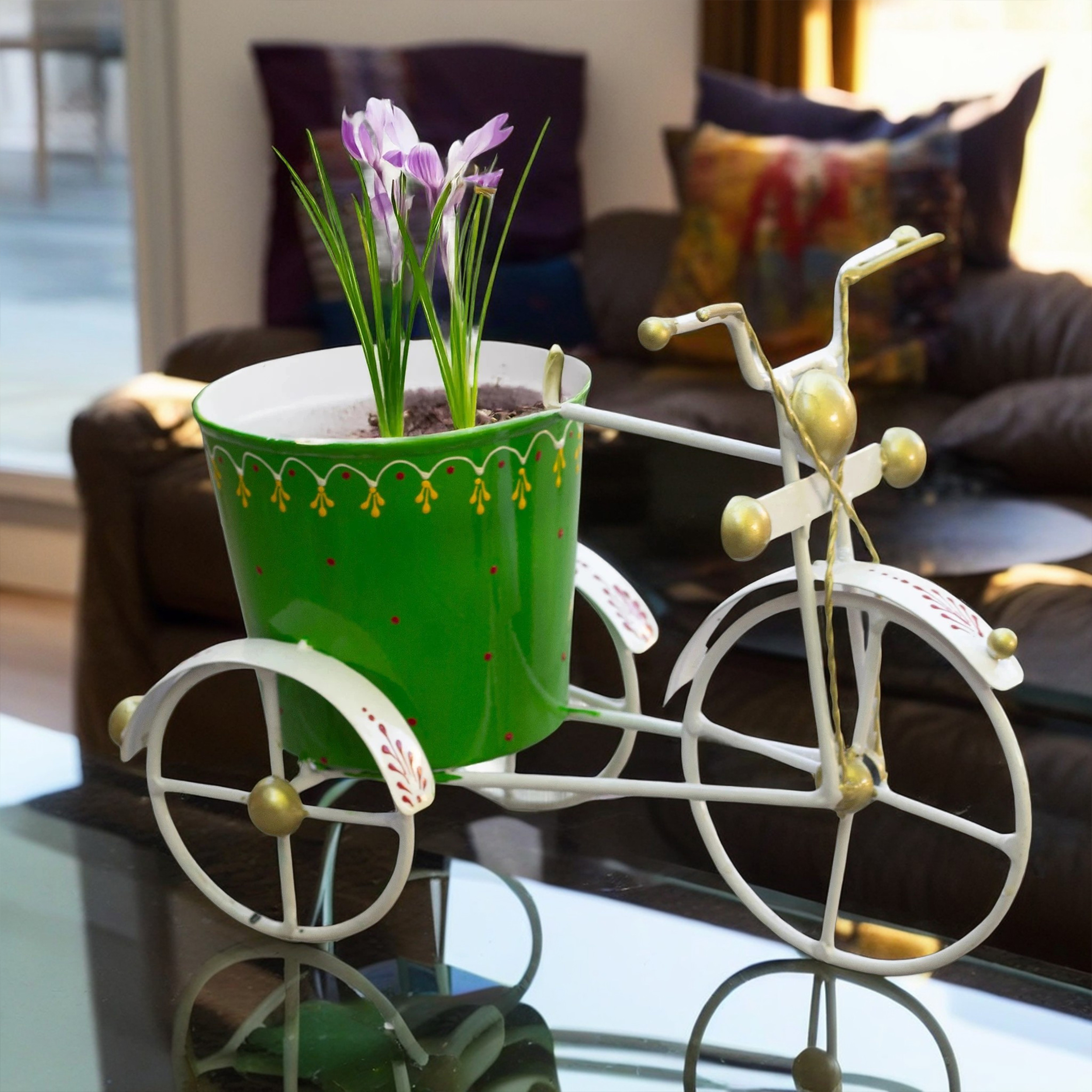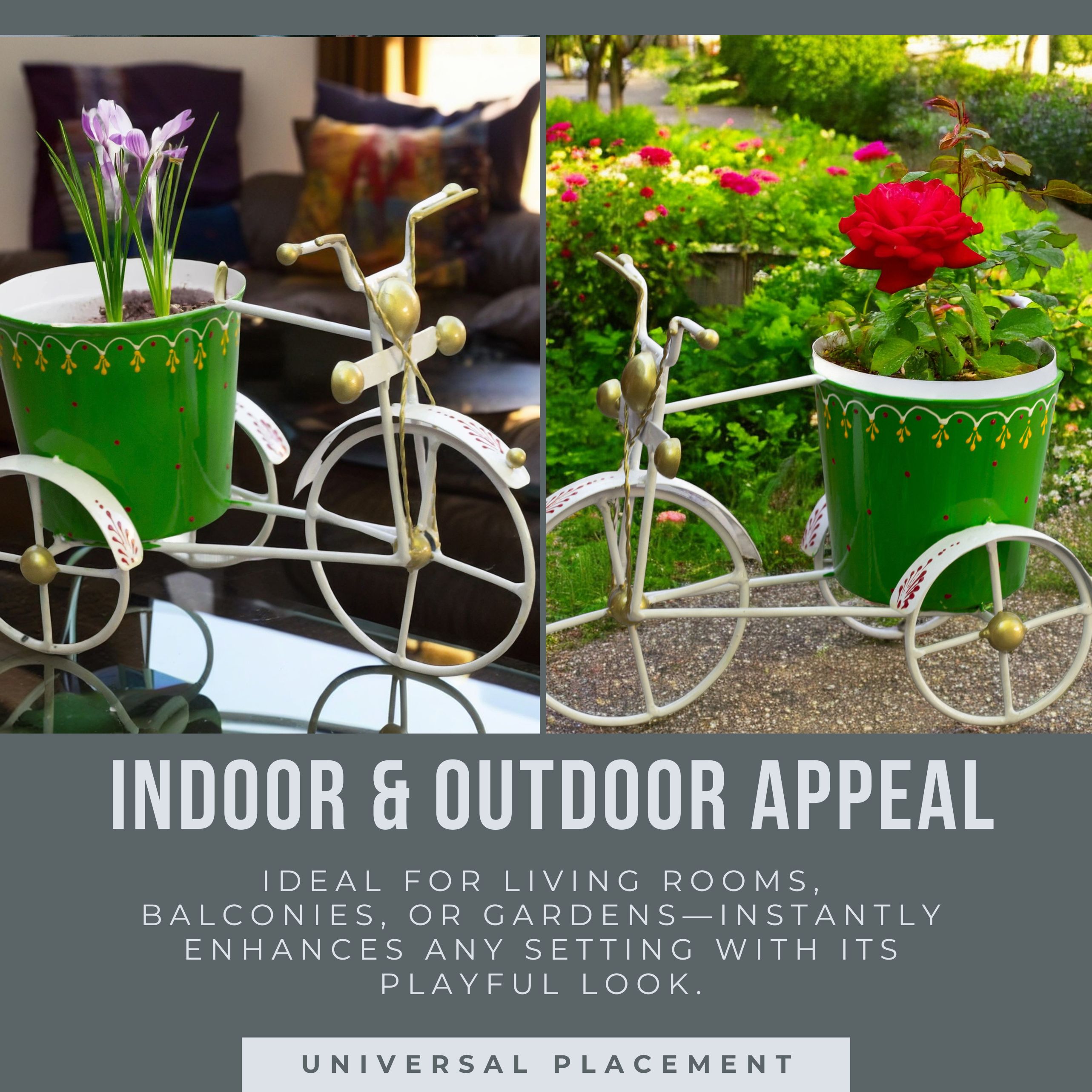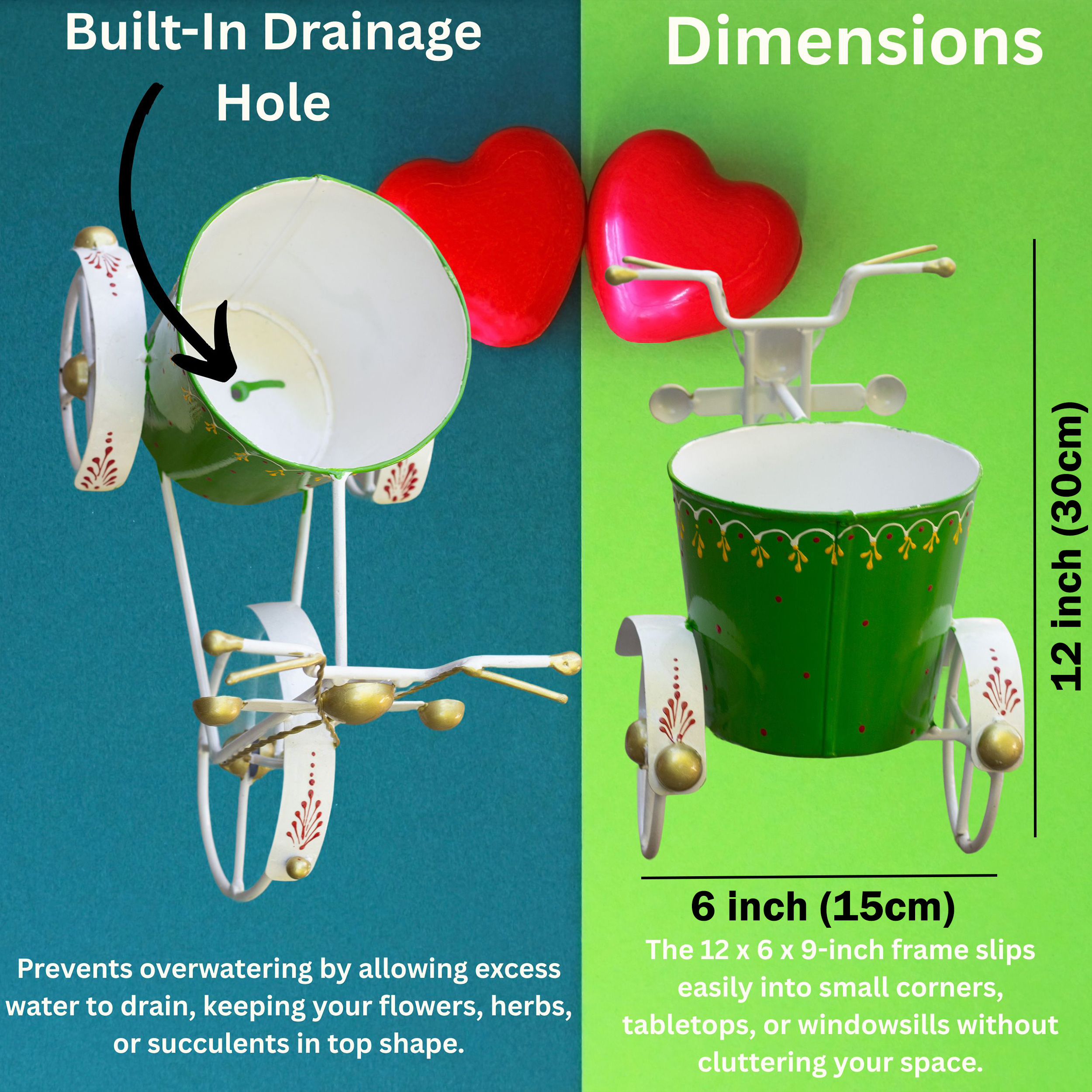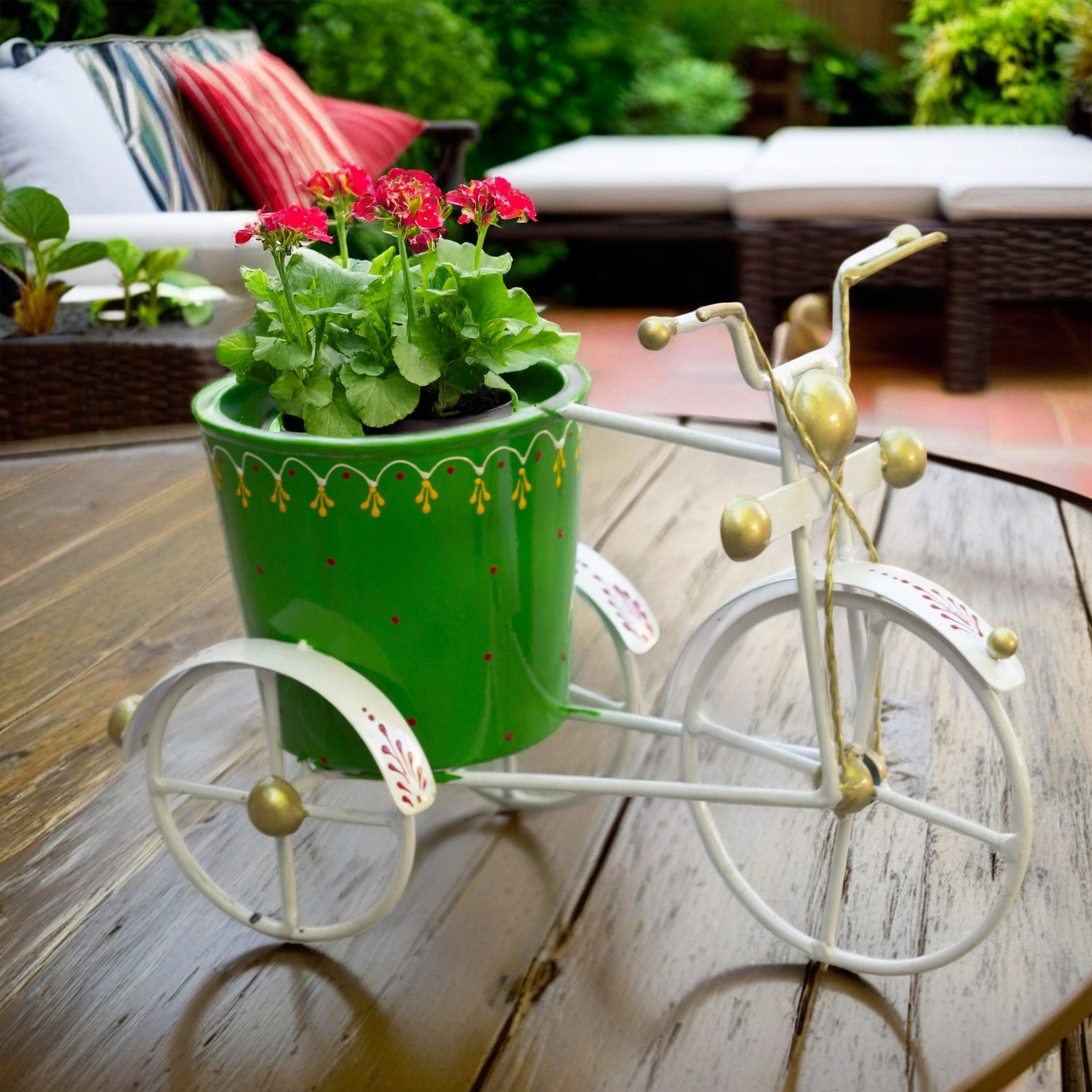 Add a delightful touch to your home, balcony, or garden with this unique metal tricycle planter. It is perfect for artificial as well as live plants and succulents. Its vibrant green planter bucket (5-inch diameter) and classic white frame create a charming display that enhances any setting—whether it’s your living room, kitchen counter, patio, or yard.