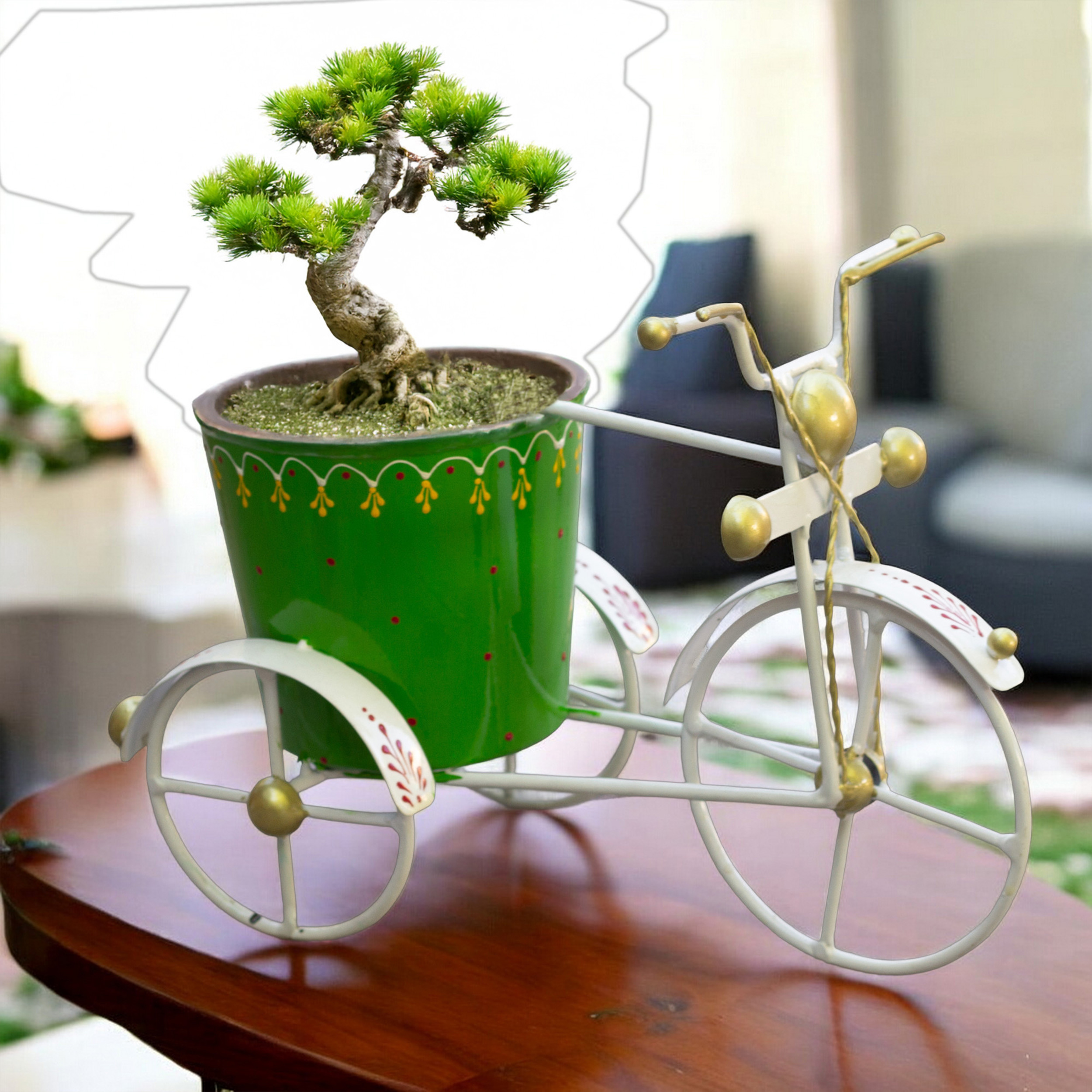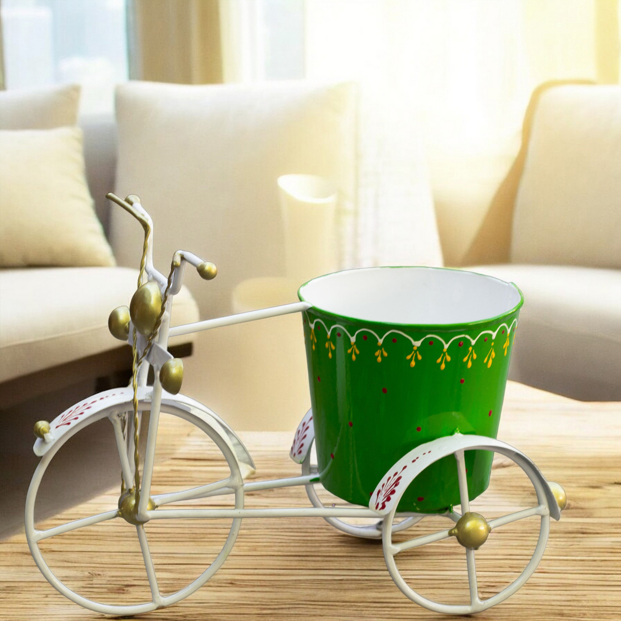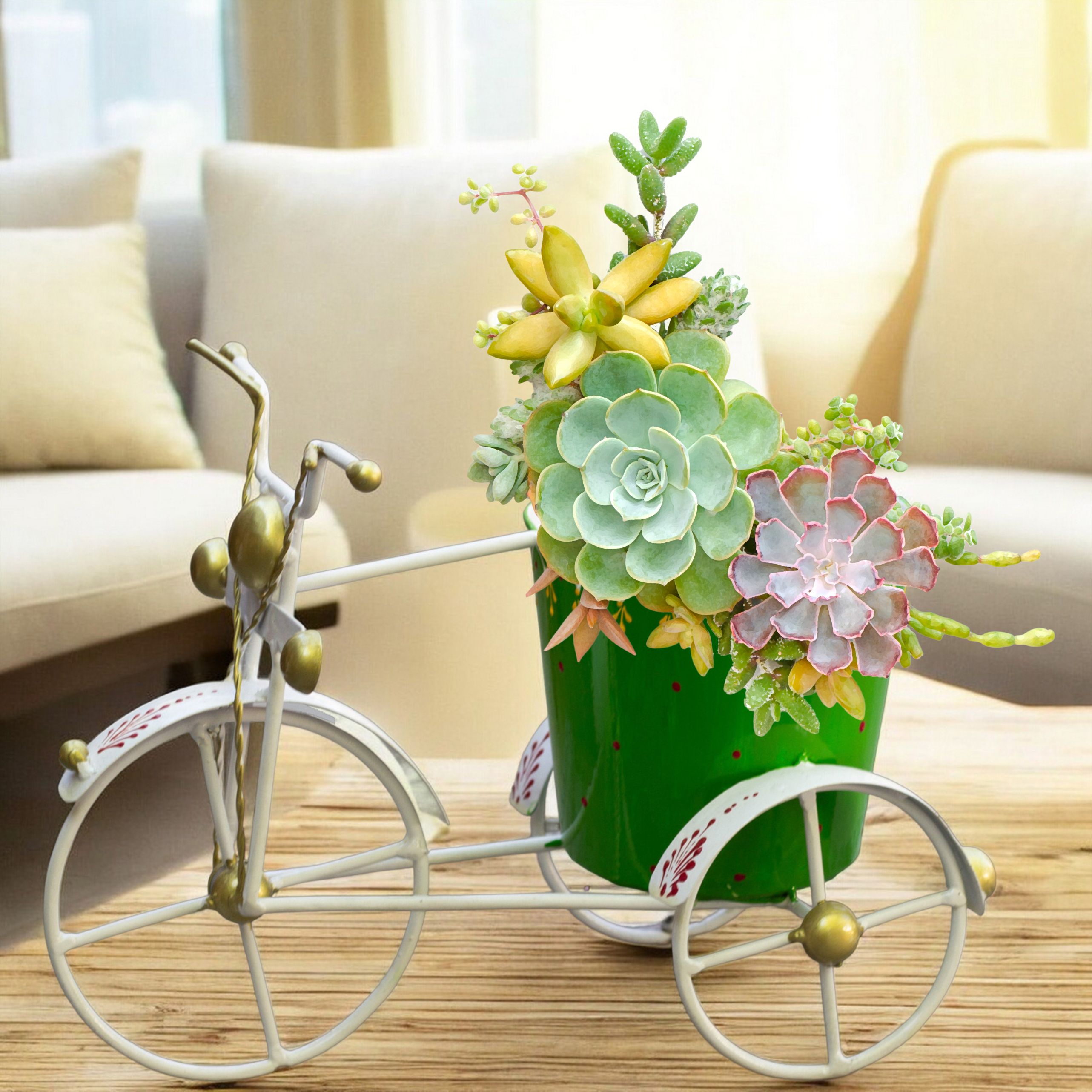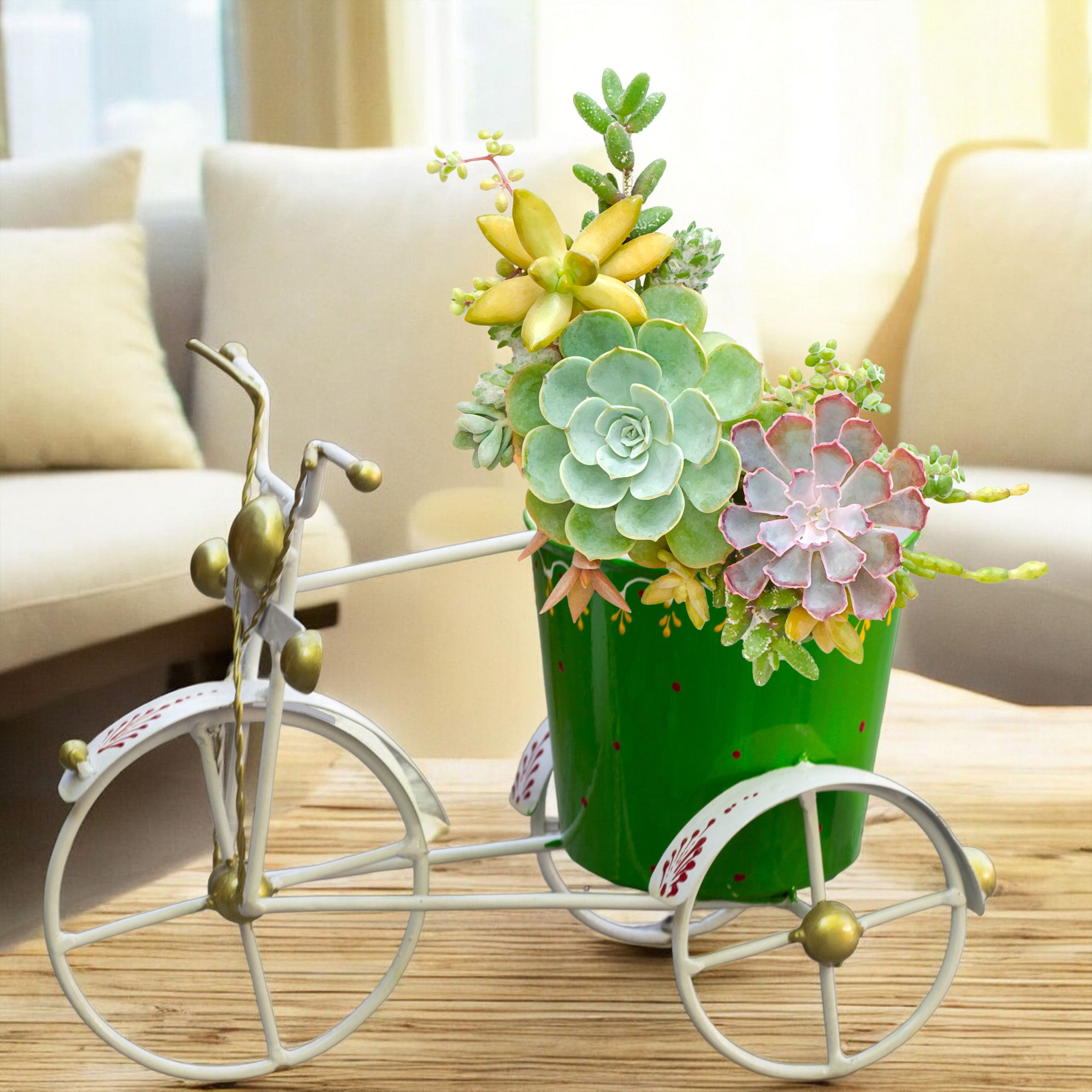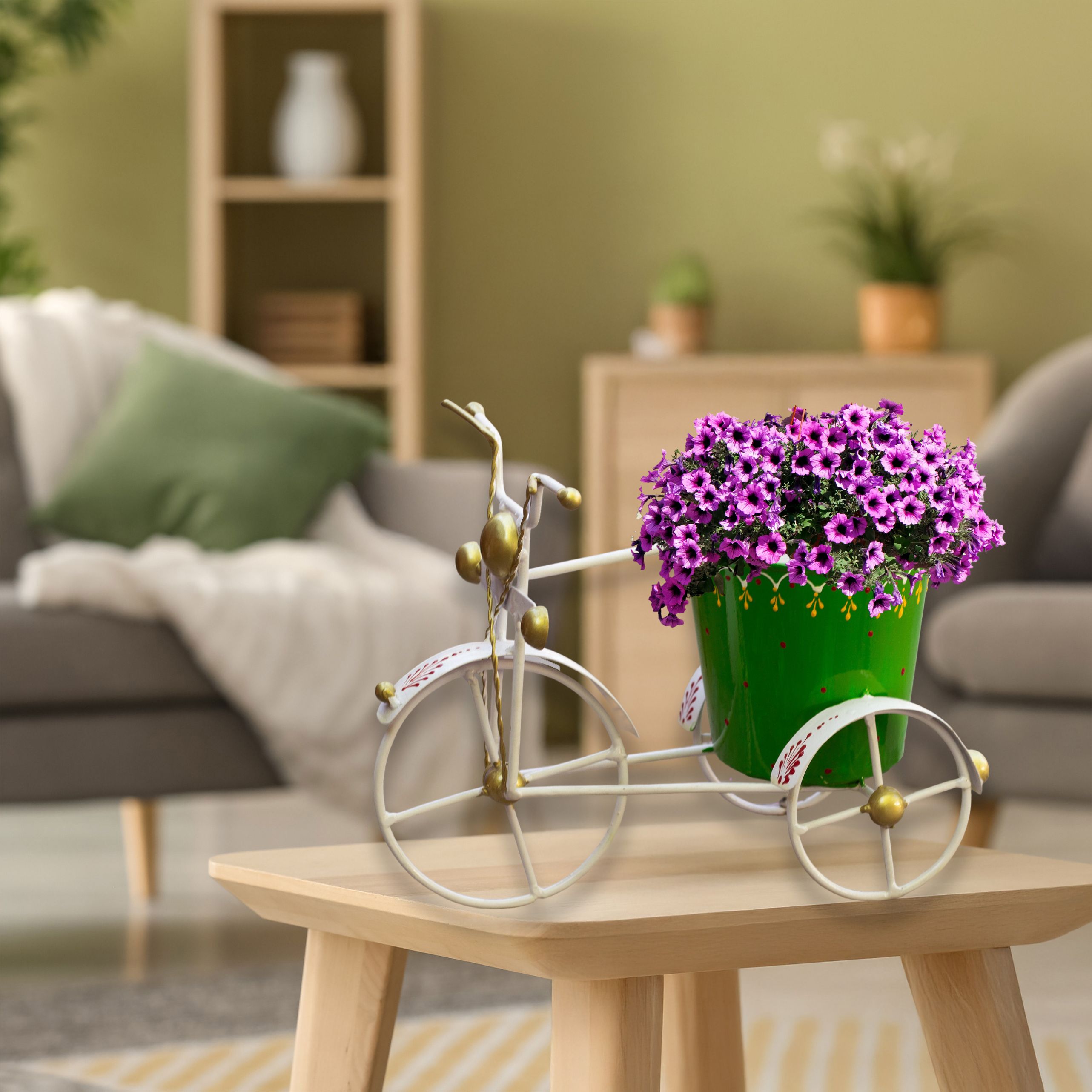 Add a delightful touch to your home, balcony, or garden with this unique metal tricycle planter. It is perfect for artificial as well as live plants and succulents. Its vibrant green planter bucket (5-inch diameter) and classic white frame create a charming display that enhances any setting—whether it’s your living room, kitchen counter, patio, or yard.