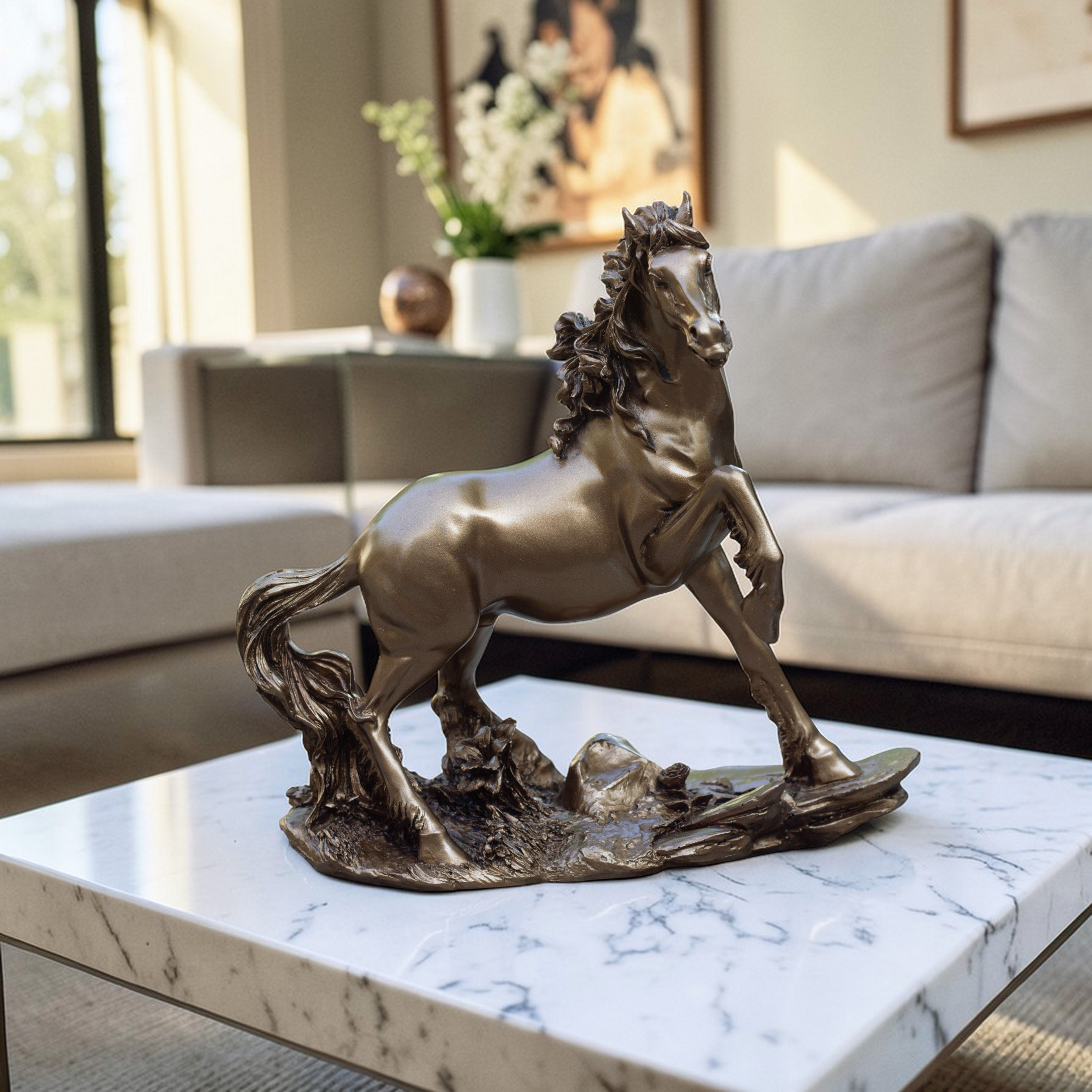 Whether placed in a home interior, office environment, or reception area, this elegant horse statue adds both decorative charm and symbolic value to your surroundings.
