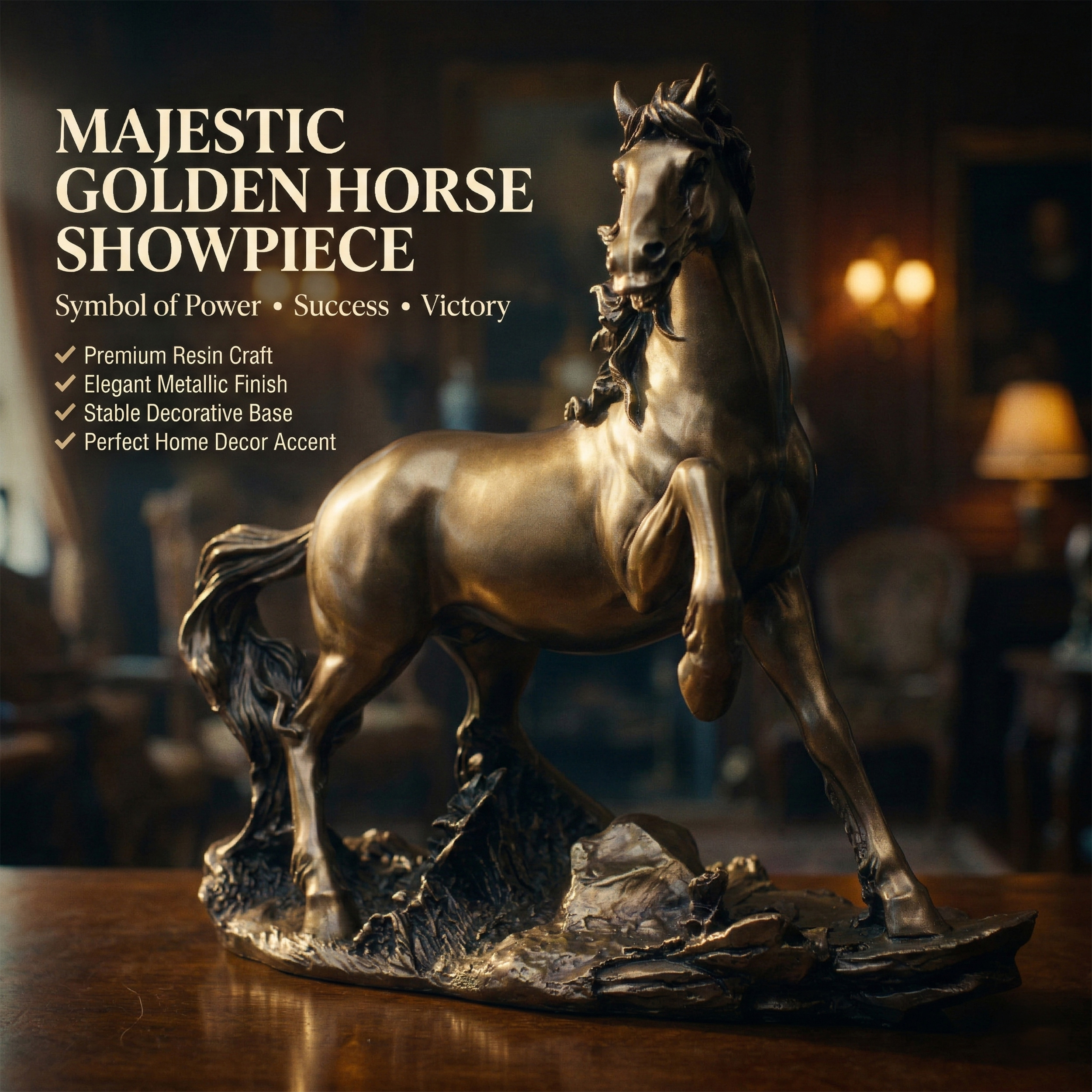 Bring a sense of strength, ambition, and elegance to your interior space with this beautifully crafted golden horse showpiece statue. Designed with fine sculpted details and a striking rearing posture, this decorative horse figurine symbolizes courage, determination, and unstoppable progress. The elegant metallic gold finish adds a luxurious touch, making it a standout accent for modern and traditional interiors alike.