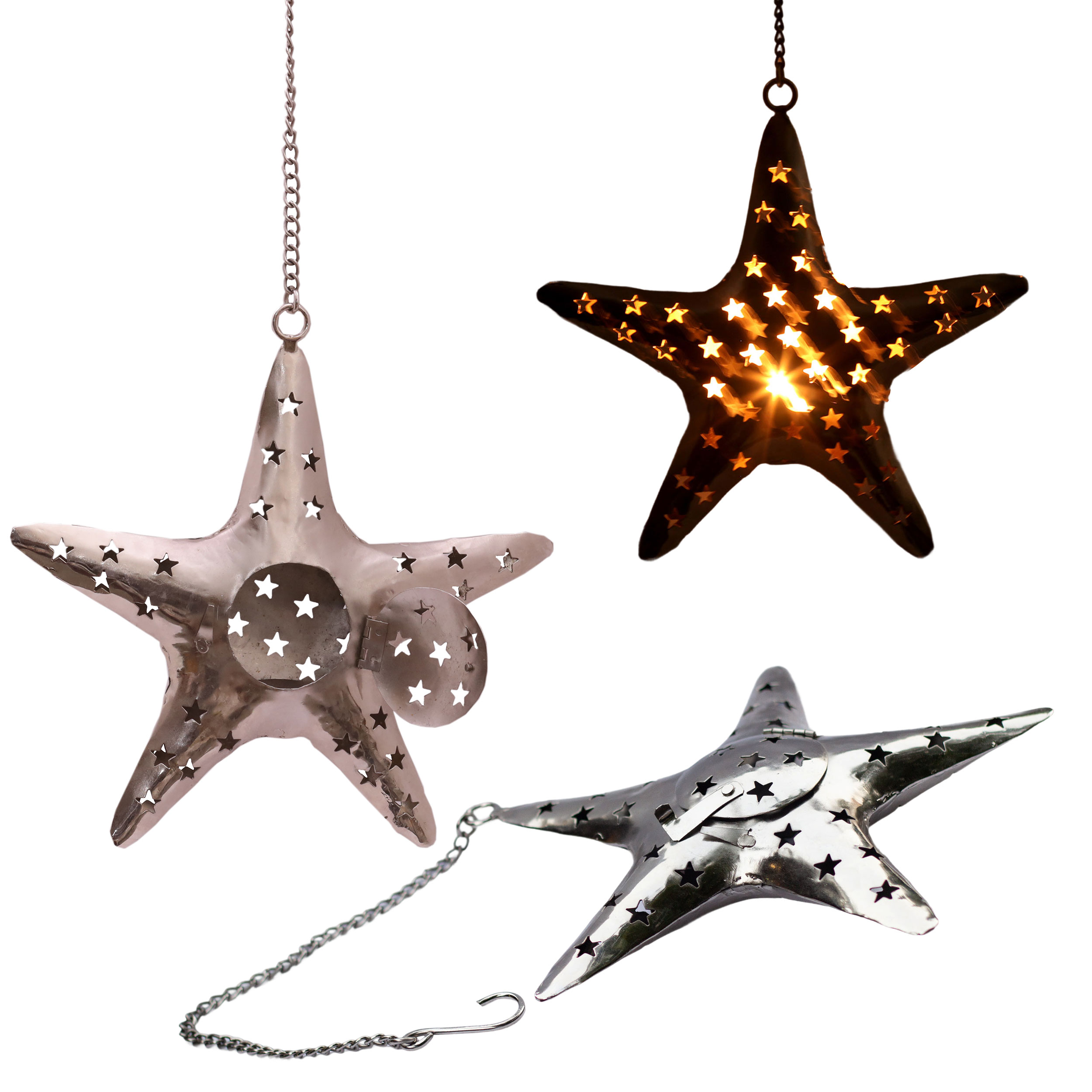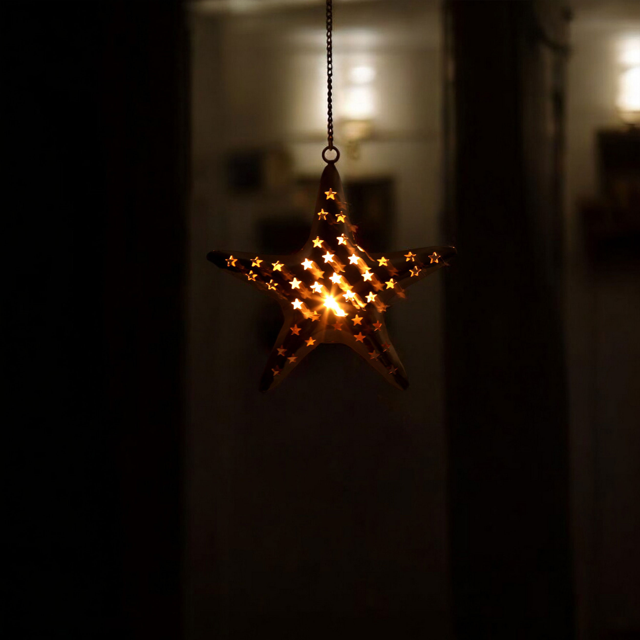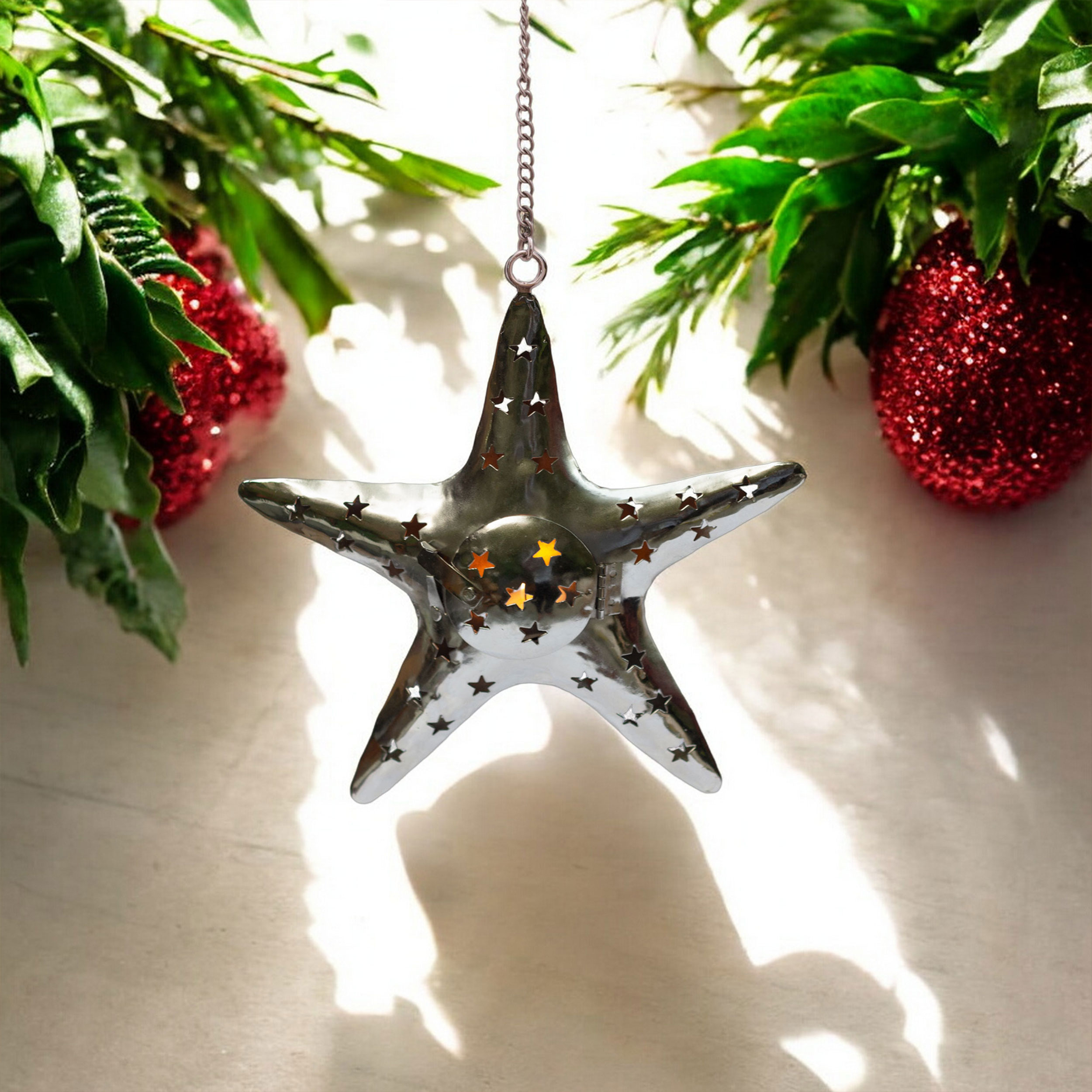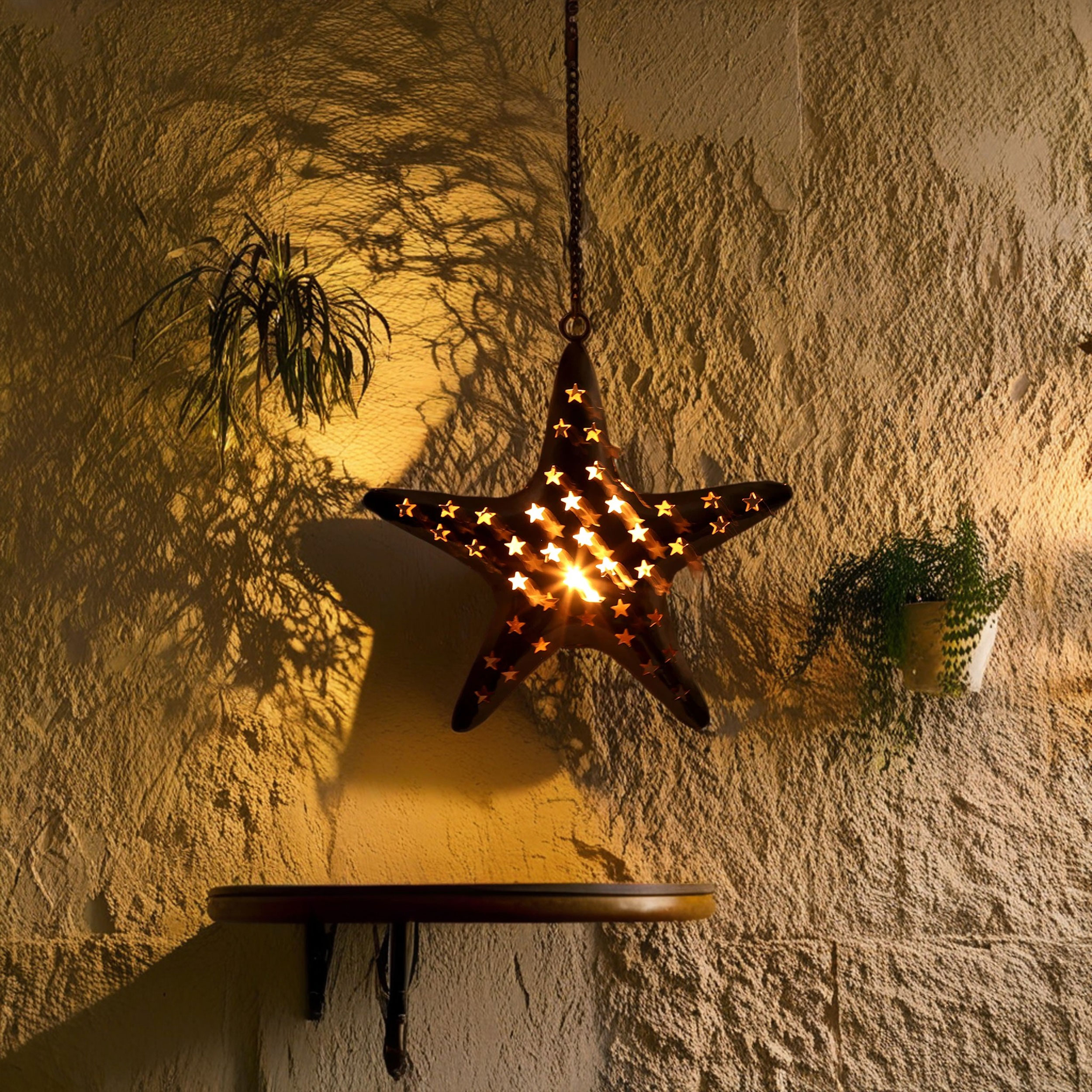 Enhance your home with the warm, inviting glow of this star shaped metal tealight candle holder. Crafted from sturdy metal, this elegant star measures approximately 11 inches by 10 inches, and includes a durable 12-inch hanging chain, making it simple to suspend from the ceiling or mount on a wall. Whether you’re looking to add soothing ambience to your living room décor, highlight a cozy reading nook, or bring a festive charm to your holiday decorations, this unique hanging candle holder is sure to impress.