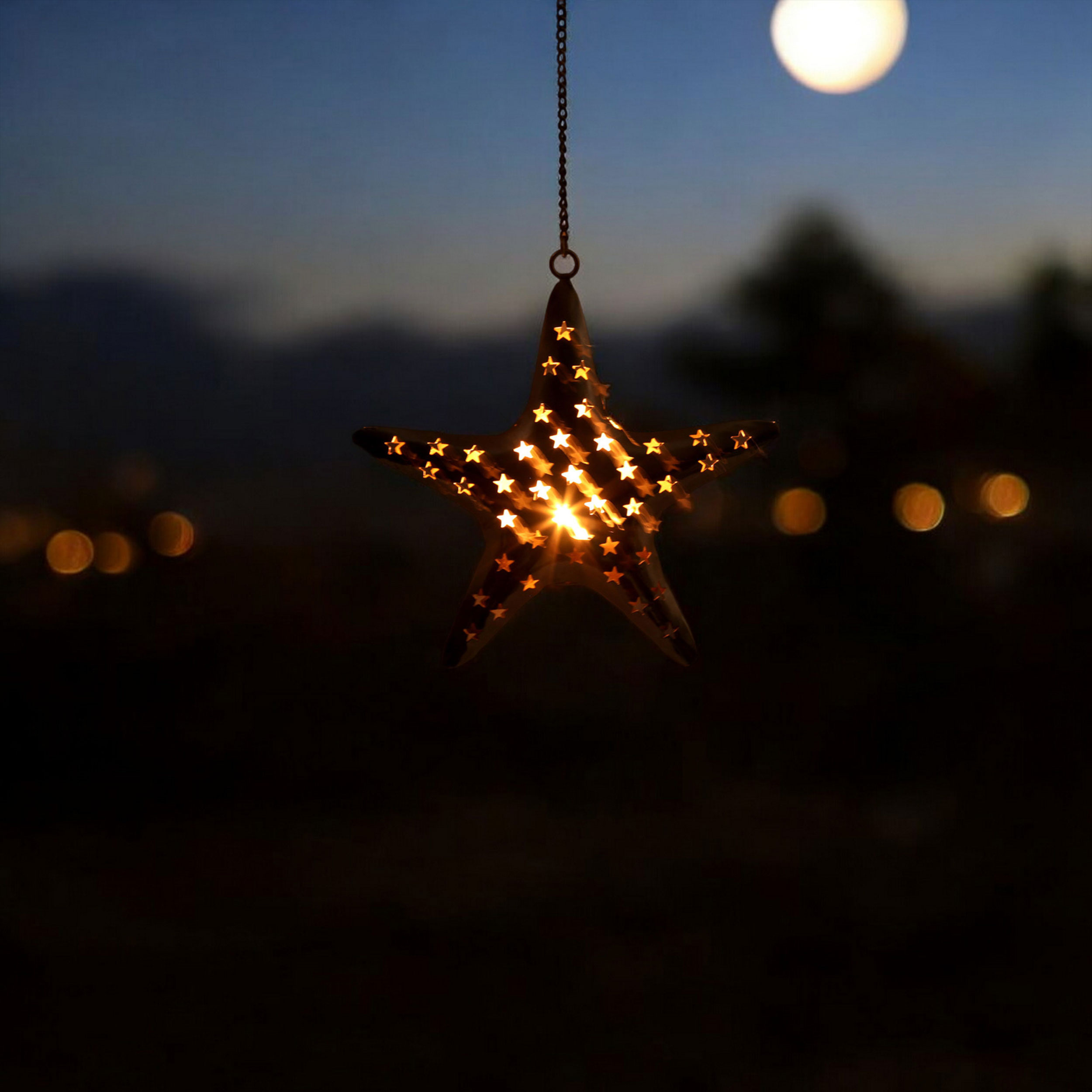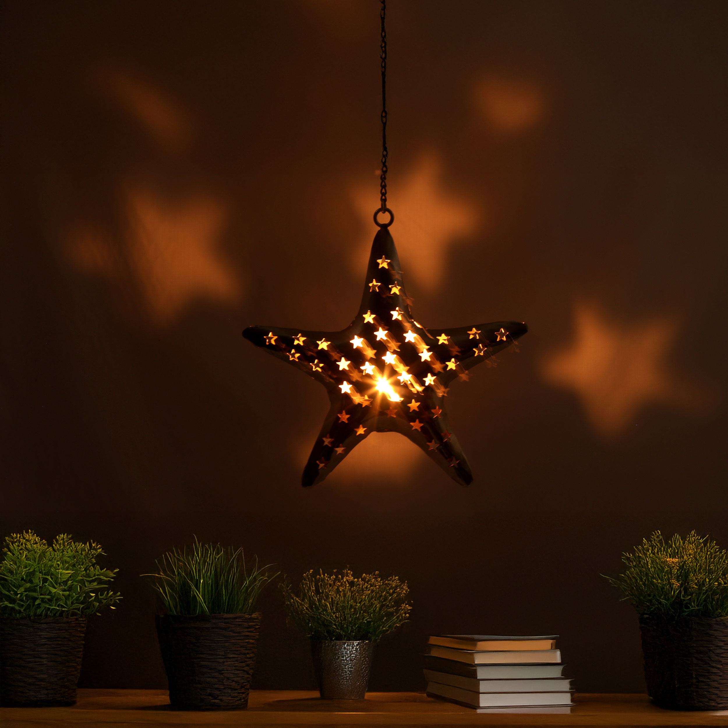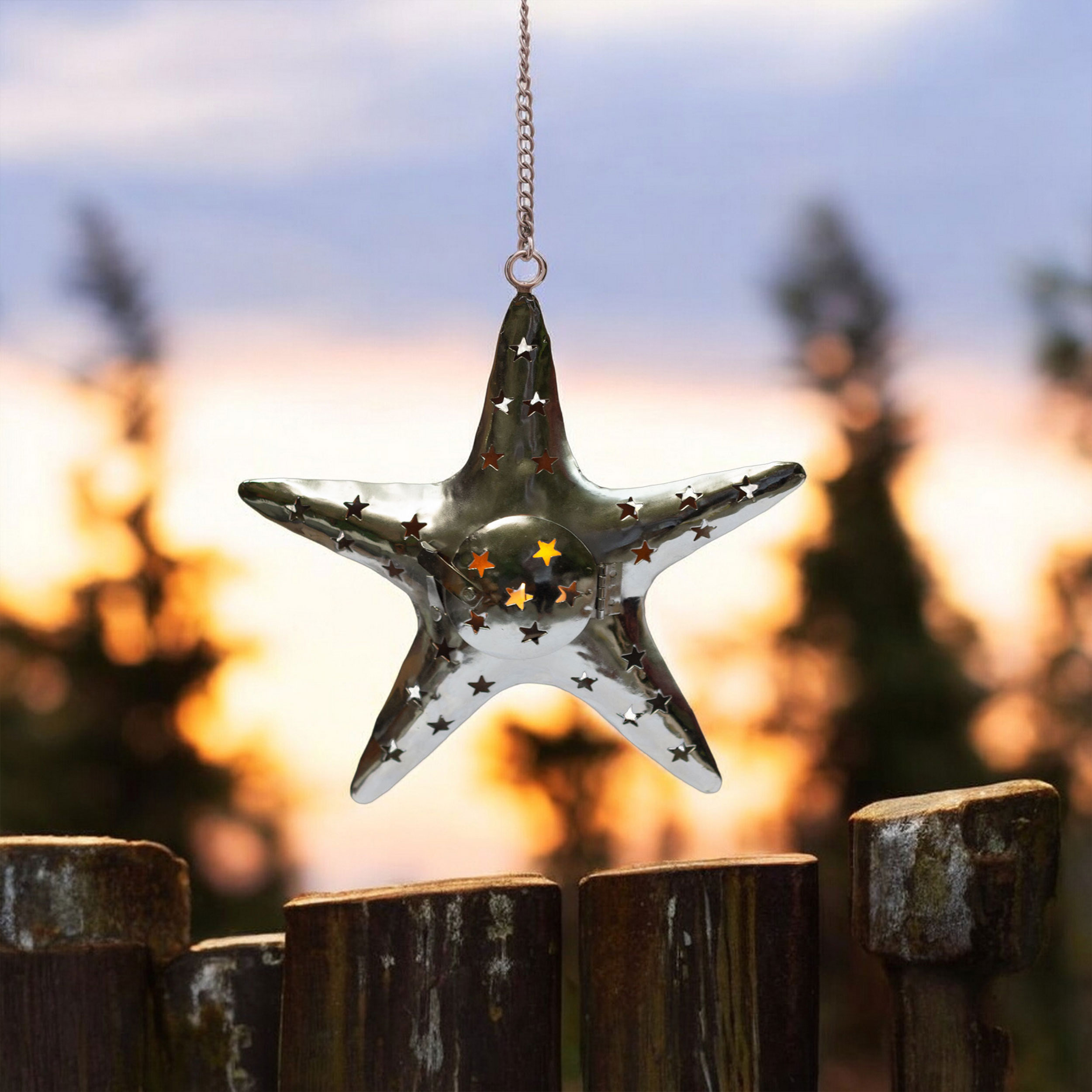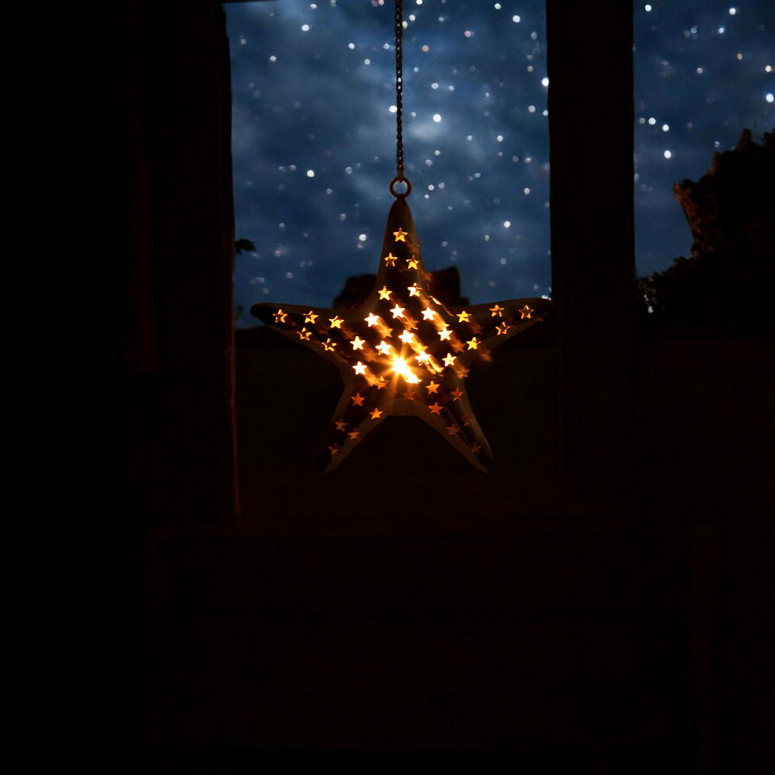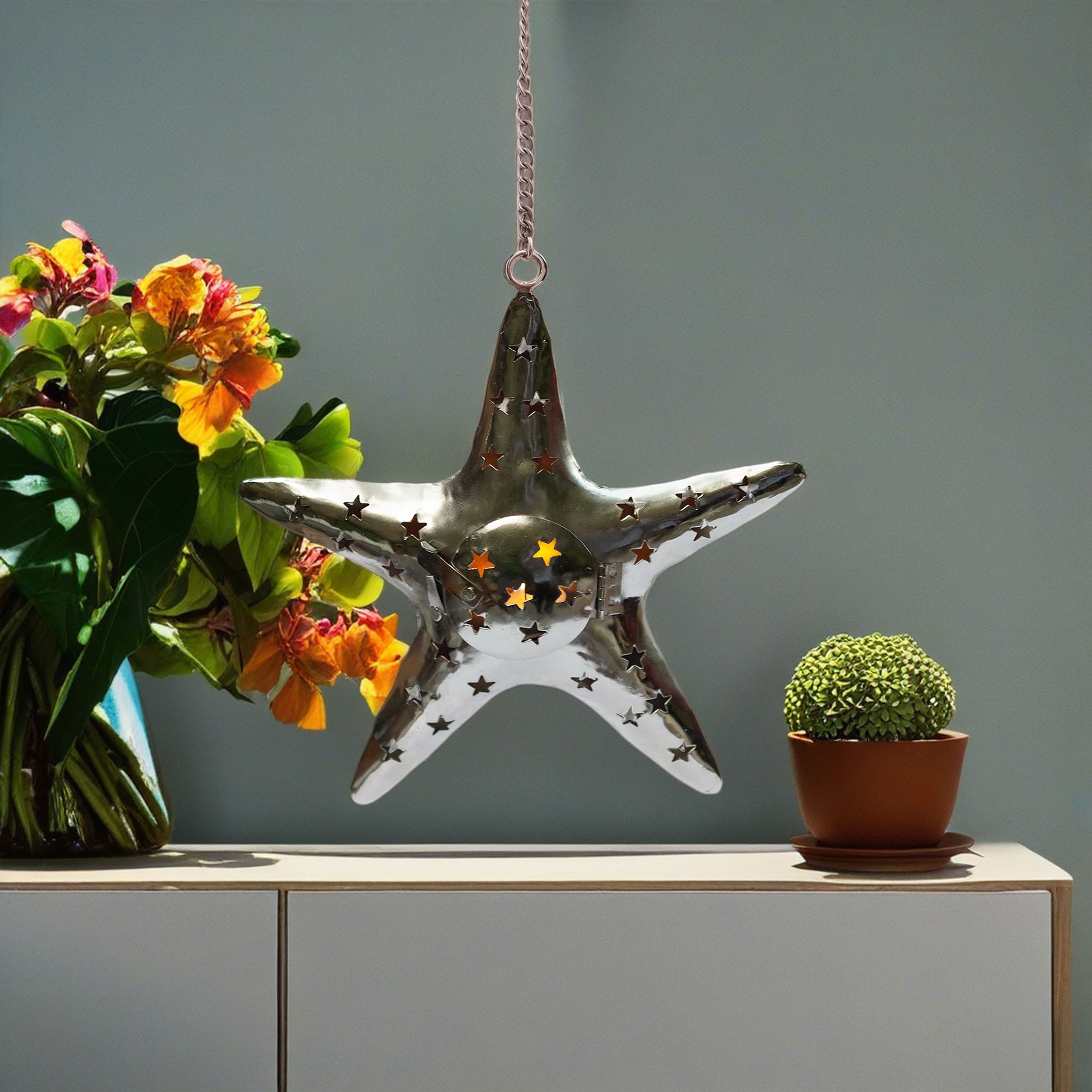 Enhance your home with the warm, inviting glow of this star shaped metal tealight candle holder. Crafted from sturdy metal, this elegant star measures approximately 11 inches by 10 inches, and includes a durable 12-inch hanging chain, making it simple to suspend from the ceiling or mount on a wall. Whether you’re looking to add soothing ambience to your living room décor, highlight a cozy reading nook, or bring a festive charm to your holiday decorations, this unique hanging candle holder is sure to impress.
