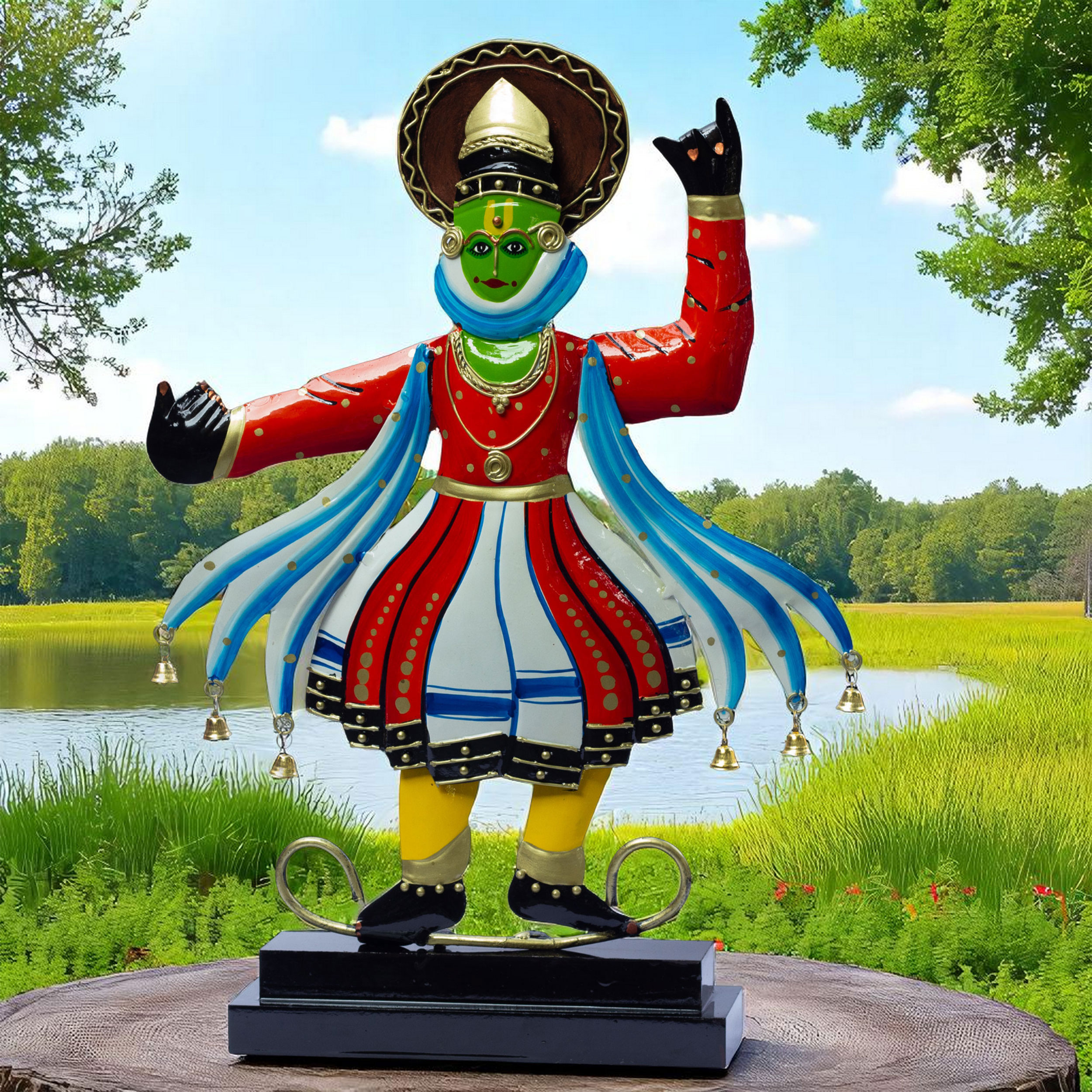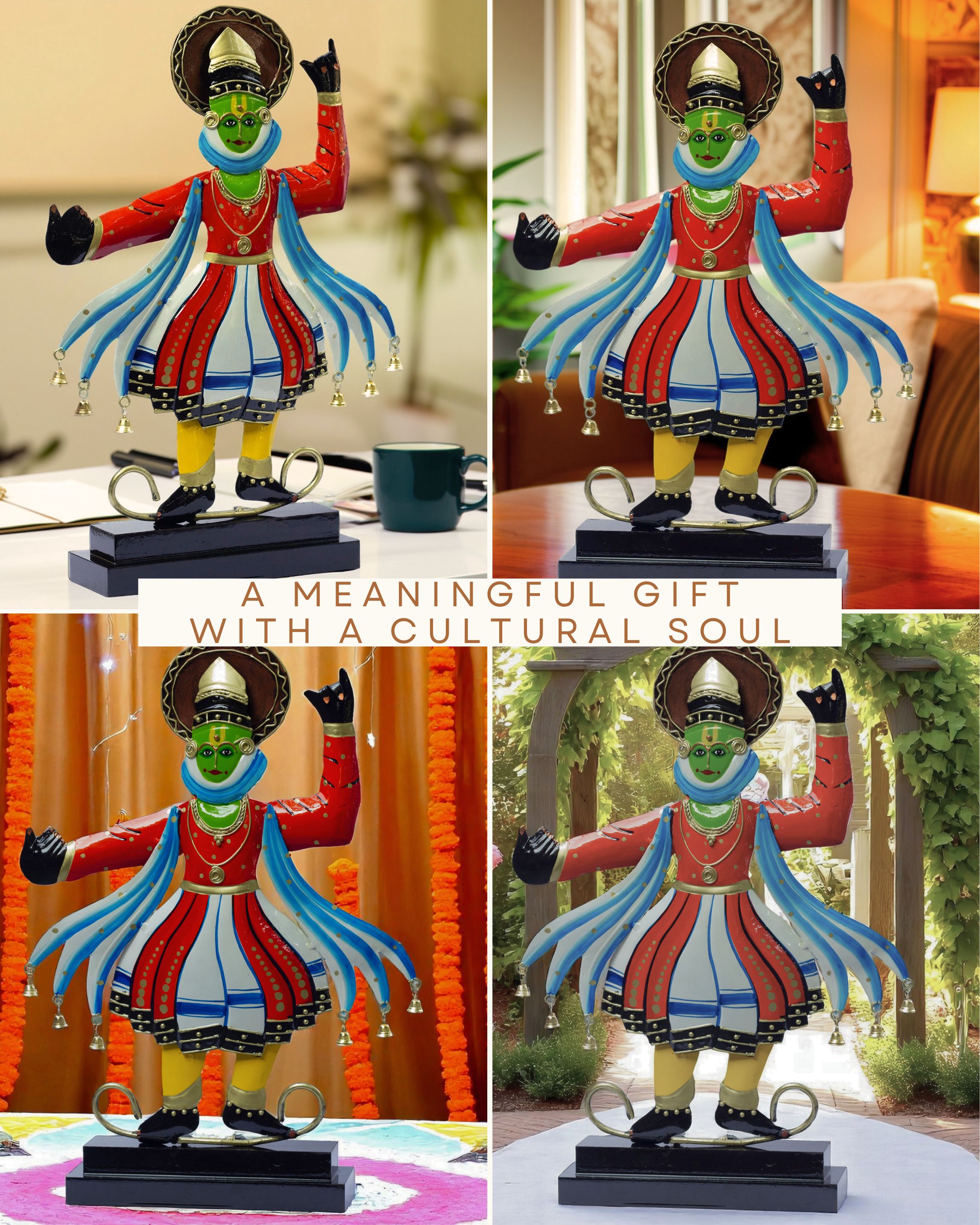 Made using high-quality metal and enamel paint, with attention to details such as mudras, costumes, and facial expressions that honor Kathakali’s theatrical style.