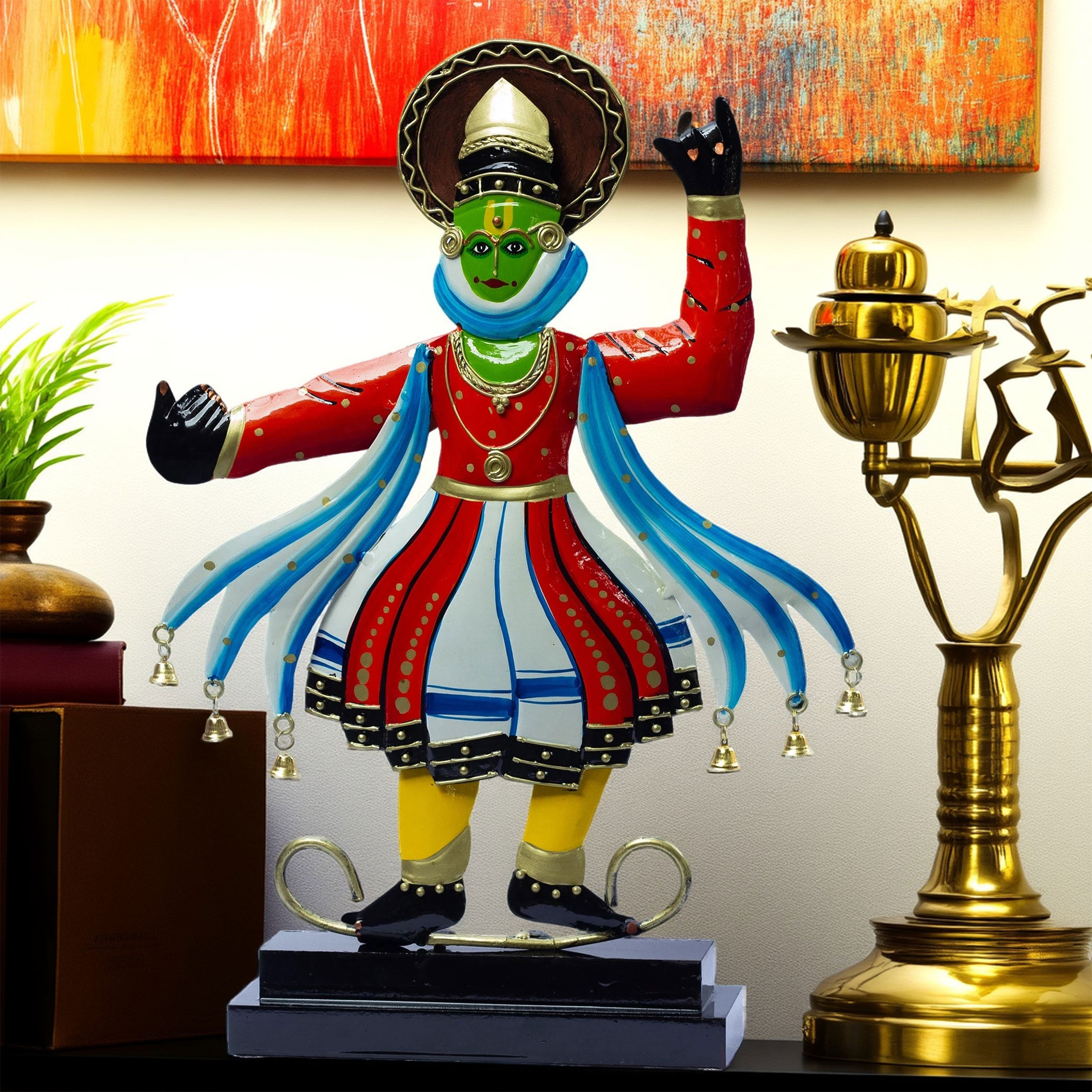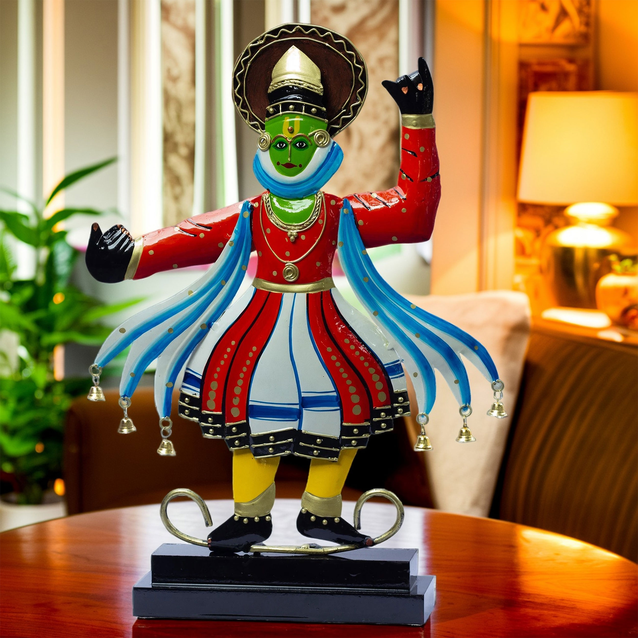 Crafted from durable metal and painted in bright, lasting colors, the showpiece portrays a dynamic pose that reflects the expressive storytelling of Kathakali. From the iconic green face paint symbolizing mythological characters to the intricate headgear, flowing scarves, and bell ornaments, every detail is a tribute to India’s artistic traditions.