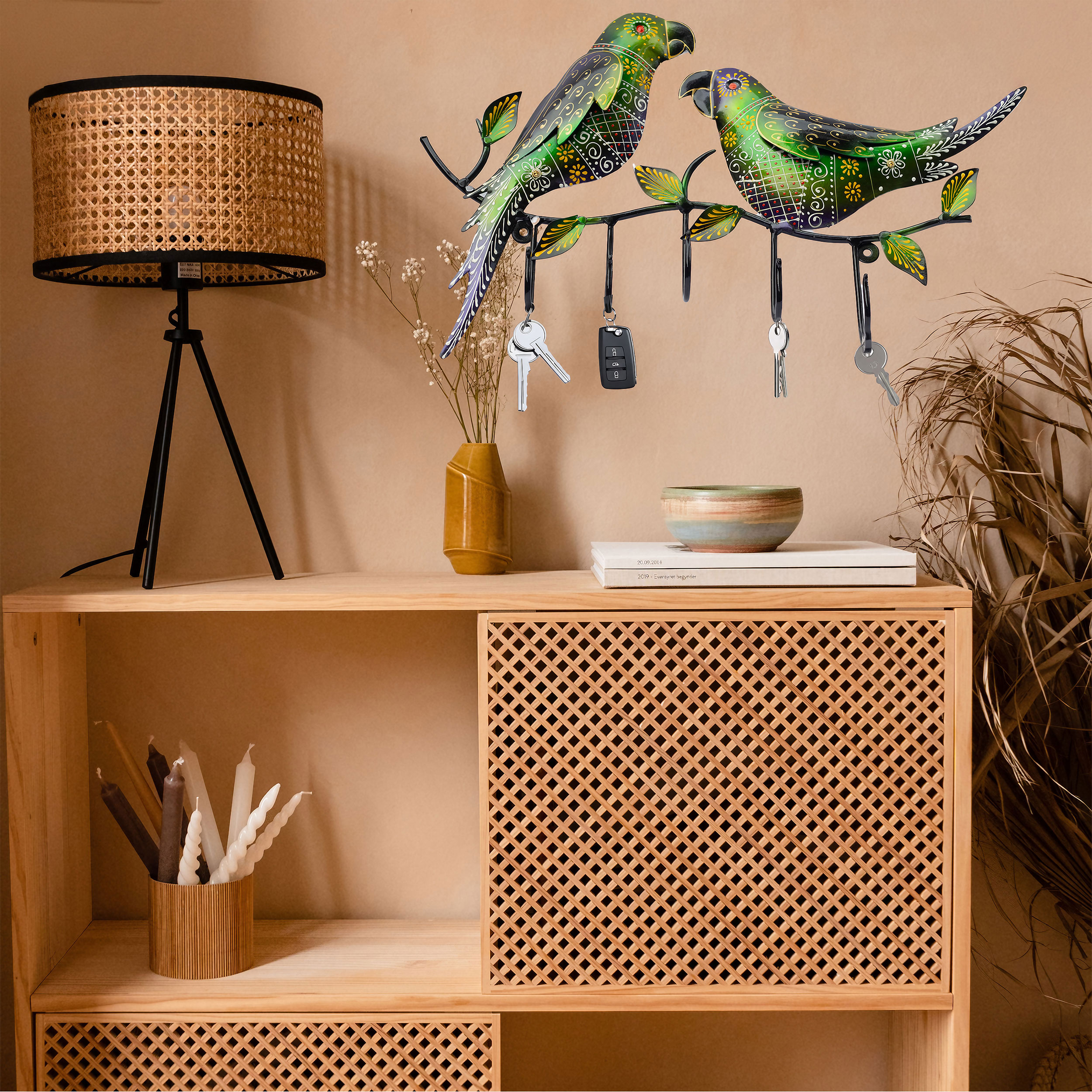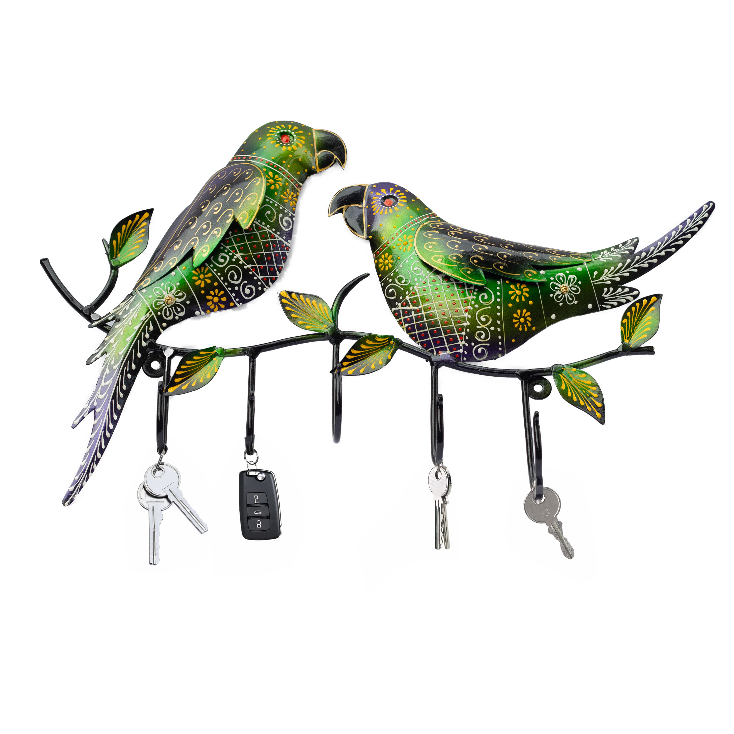 Add a touch of elegance and functionality to your home with our 5 Key Chain Holder. Crafted from heavy-duty iron metal, this key holder not only serves as a practical storage solution but also as a beautiful showpiece that enhances your home décor. The intricately designed 3 parrots add a whimsical charm to any setting.