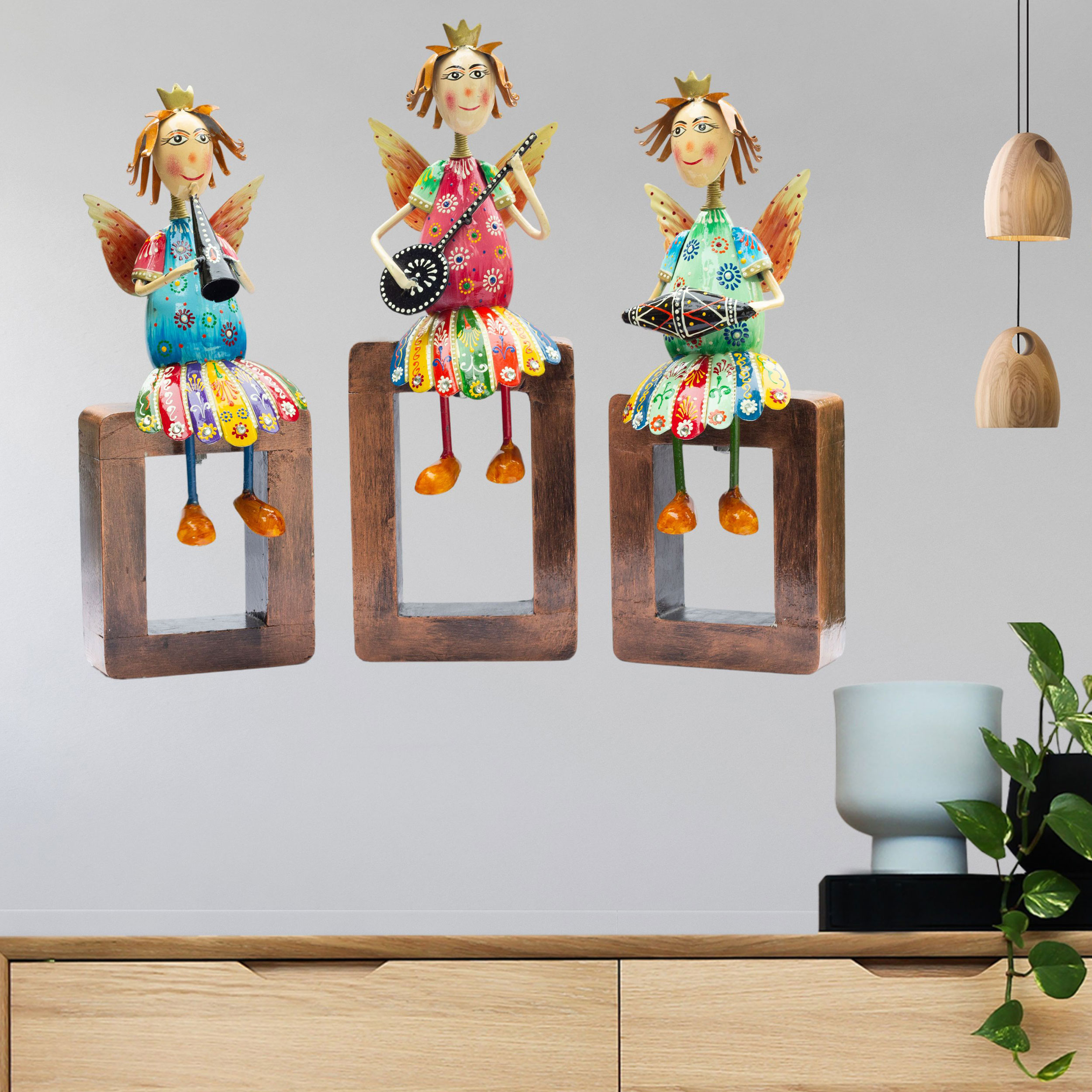 Enhance the beauty of your living space with our exquisite set of 3 Angel Musician Statues. Meticulously crafted with fine metal and vibrant colors, these statues are perfect for adding a touch of elegance and charm to any room. Whether you choose to hang them on the wall or place them on a tabletop or shelf, their versatile design makes them a delightful addition to your home decor.