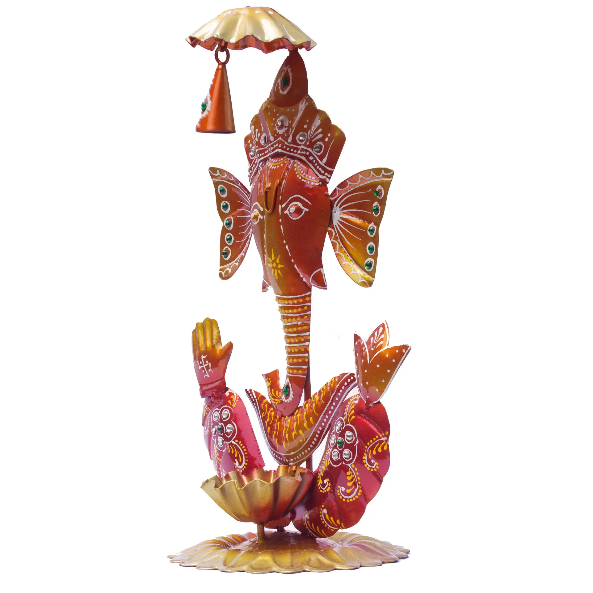 Introducing our handicraft iron metal Ganesha showpiece with a tea light diya holder and a ringing chiming bell. It is a great decorative item for your home and if perfect for gifting too. This meticulously designed iron figurine statue showcases the rich heritage of Indian craftsmanship, making it a perfect choice for home decor, office decor, and special occasions like Diwali gifting, birthdays and weddings. This tealight candle holder adds joy and vibrancy to any surroundings they are kept in.
