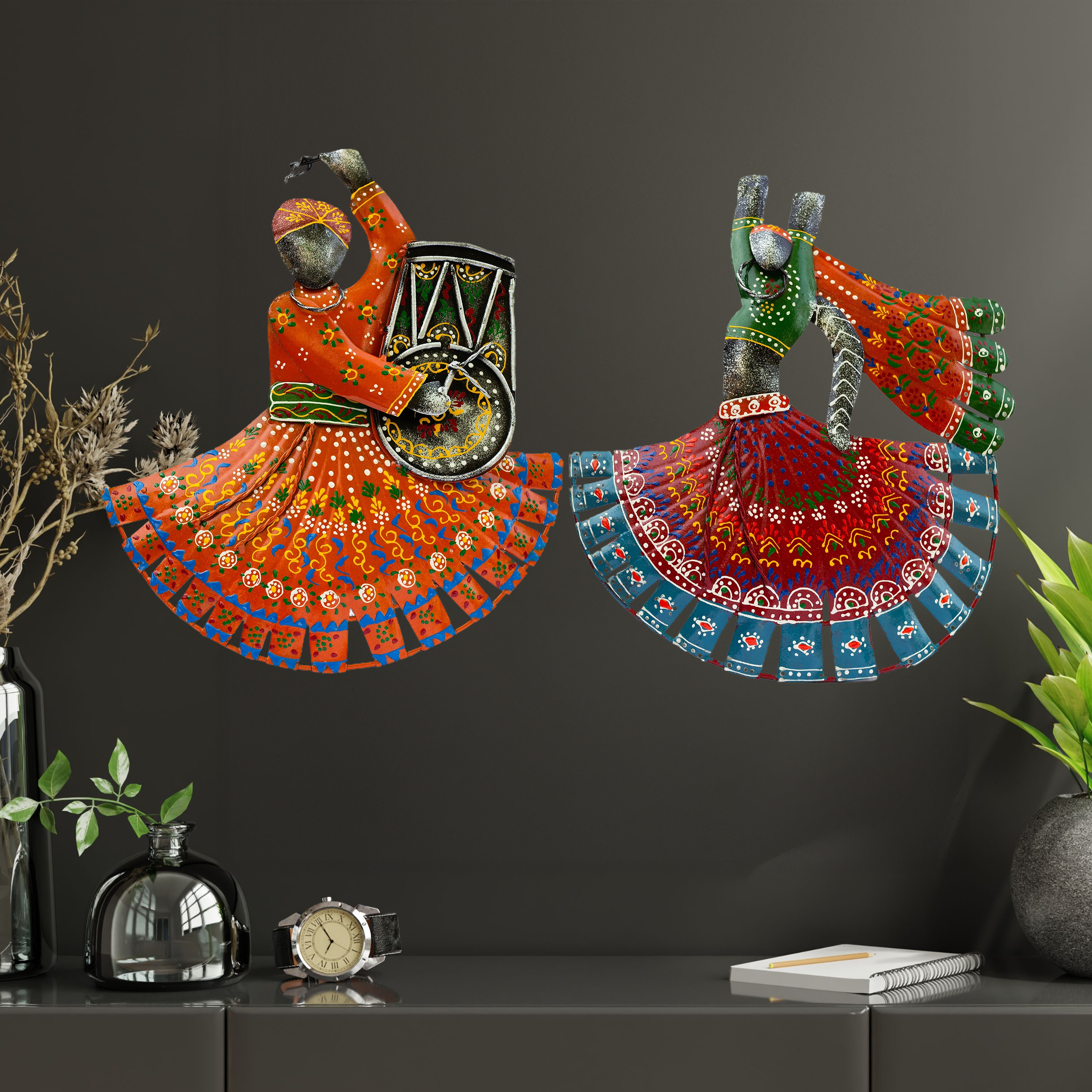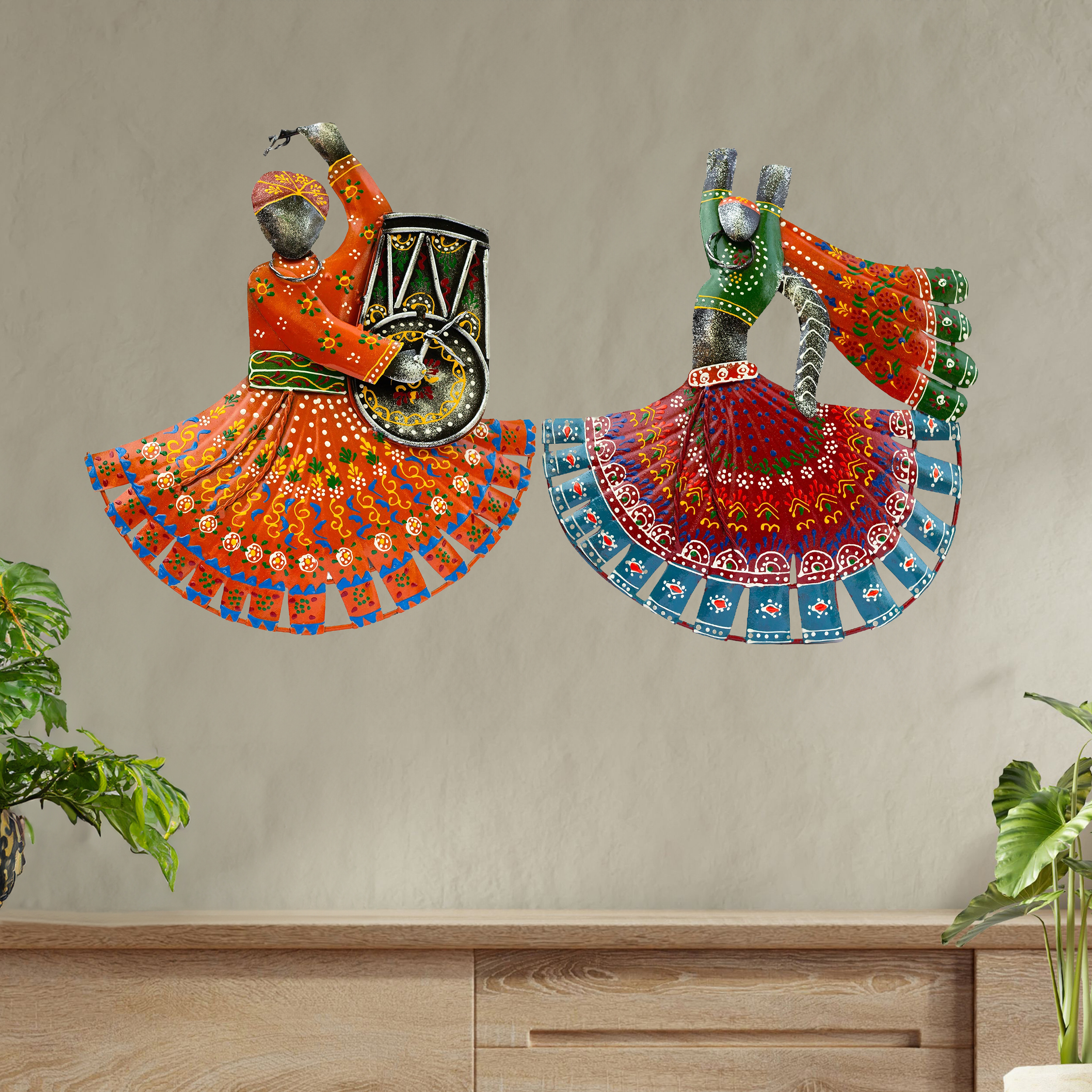 Elevate your living space with our stunning set of handcrafted Ghoomar Lehariya Dancer wall decor. These vibrant and colorful showpieces capture the essence of Rajasthan’s traditional dance, bringing a splash of culture and color to your home. Each dancer statue is meticulously hand-painted, showcasing intricate details that highlight the elegance and beauty of the Ghoomar dance.