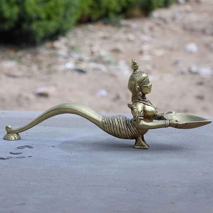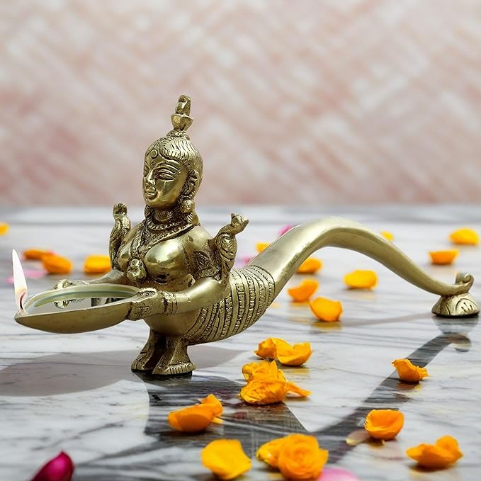Exquisite Craftsmanship: This vintage brass oil lamp features a beautifully carved lady holding a diya. It is easy to hand hold the spoon shaped diya and it goes well with your living room decor.