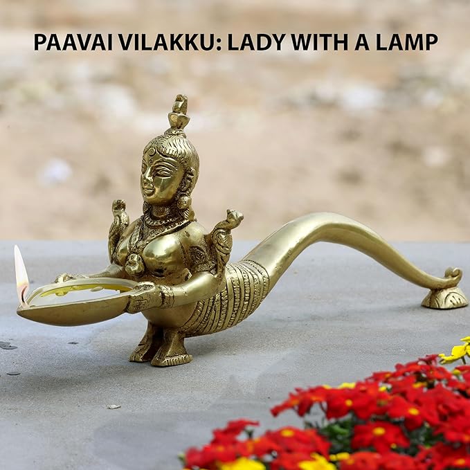 Immerse yourself in the warm glow of tradition Paavai Vilakku: the Lady with a lamp exquisitely carved brass showpiece. This vintage brass oil diya has a lady with diya in her hands and two parrots on her shoulders. Measuring 10 inches, its beauty transcends ordinary diyas, transforming into a versatile treasure for your home decor as well puja.