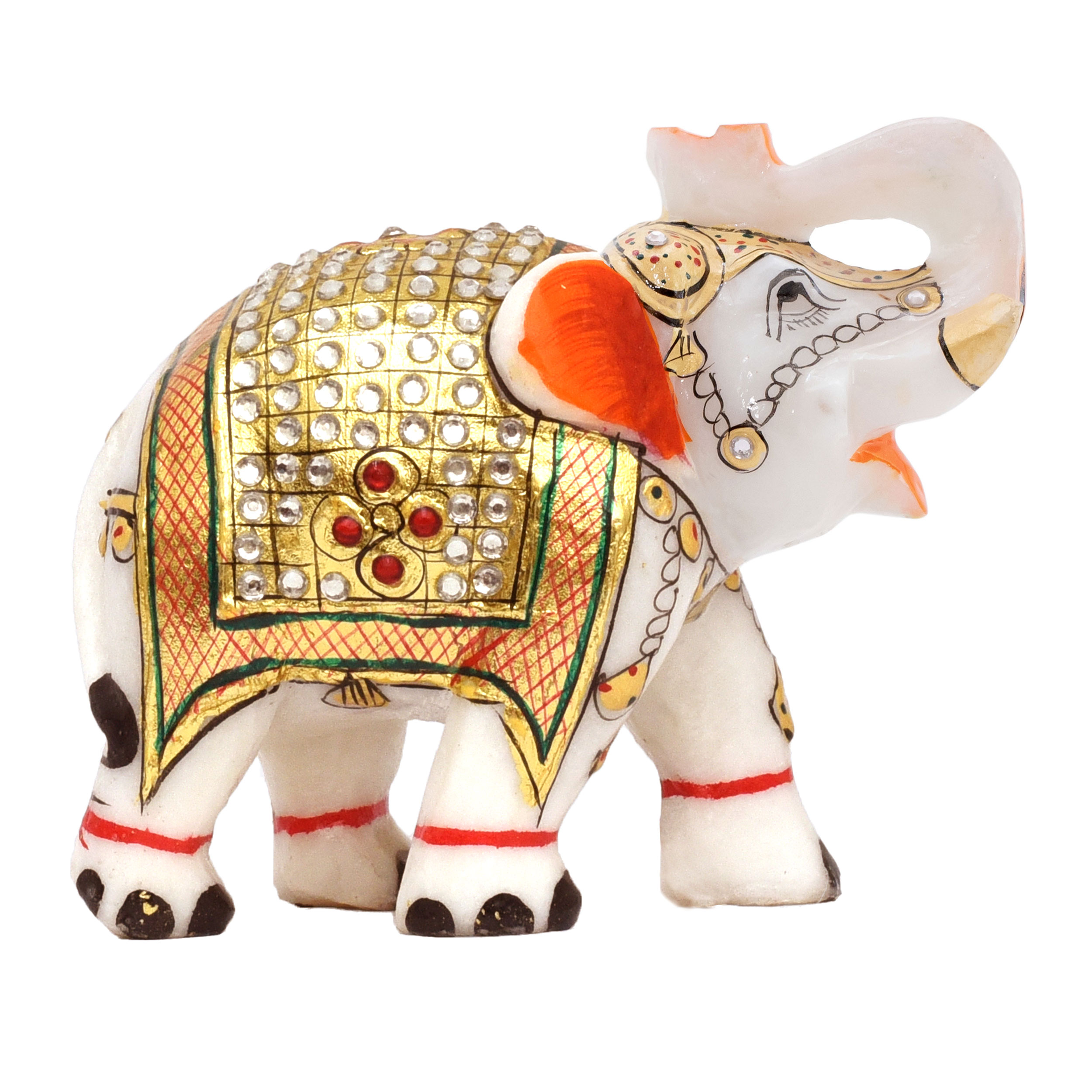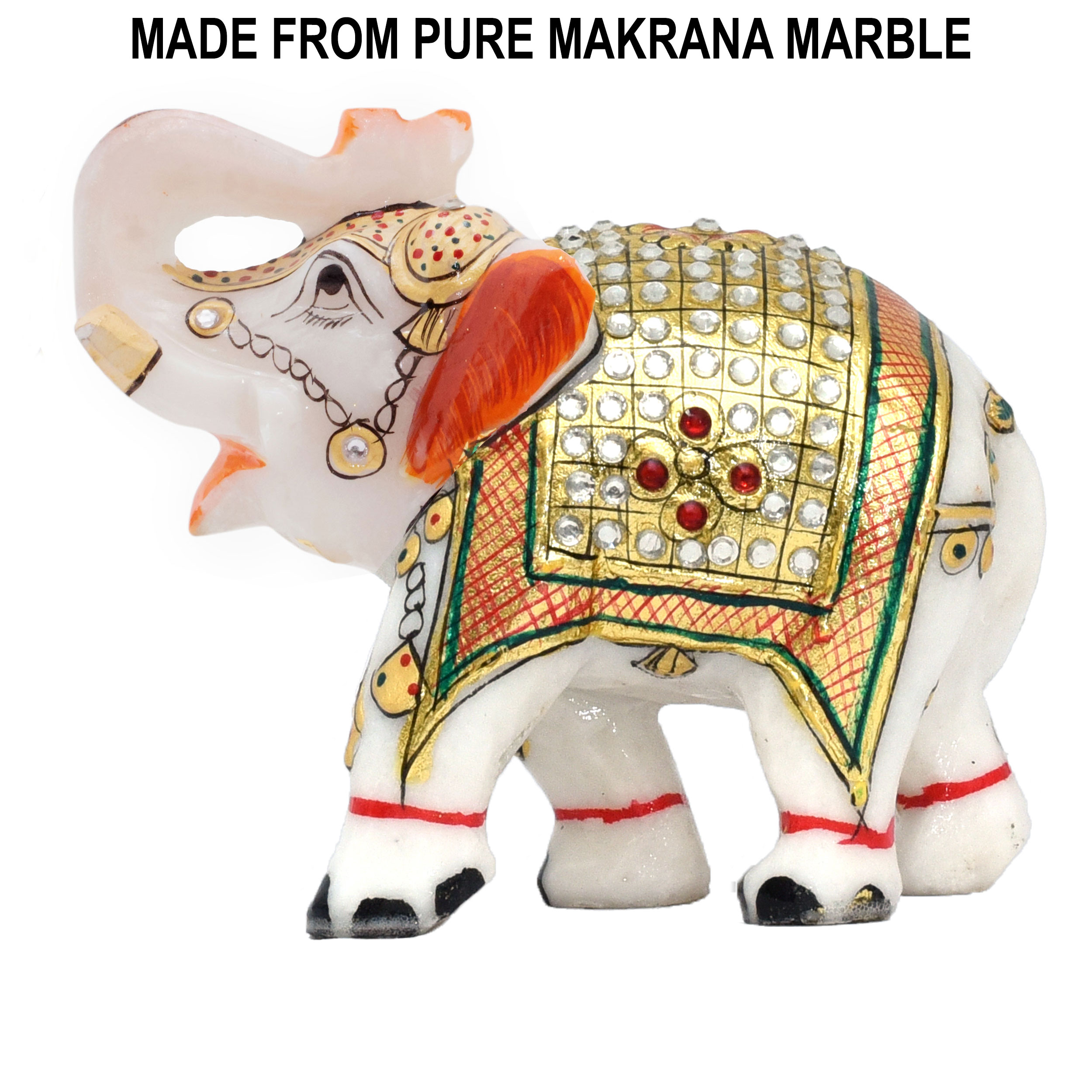 This is a set of 2 Rajasthani Jaipuri elephant showpieces. It measures 4 inch (10x8x13cms) and is crafted of pure white Makrana marble. It has intricate designs and golden accent colors. The jewels and painting add a touch of elegance and sophistication to these marble elephant statues.