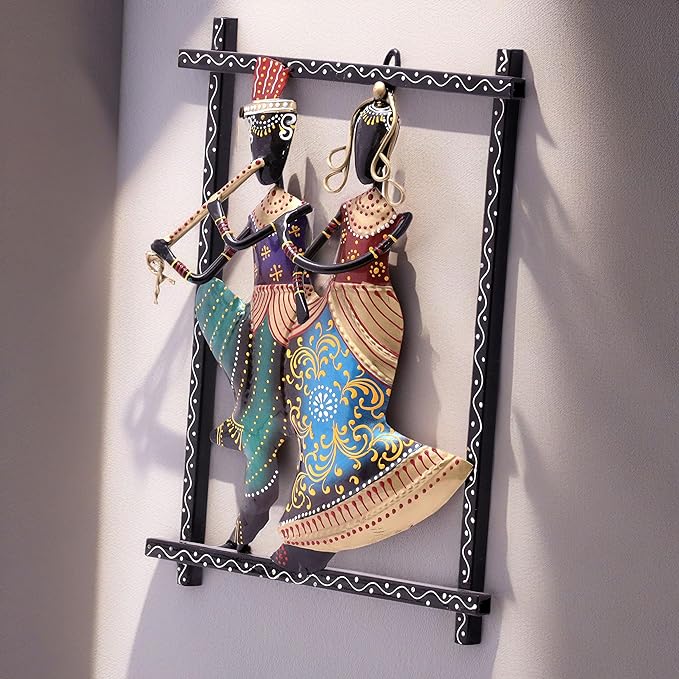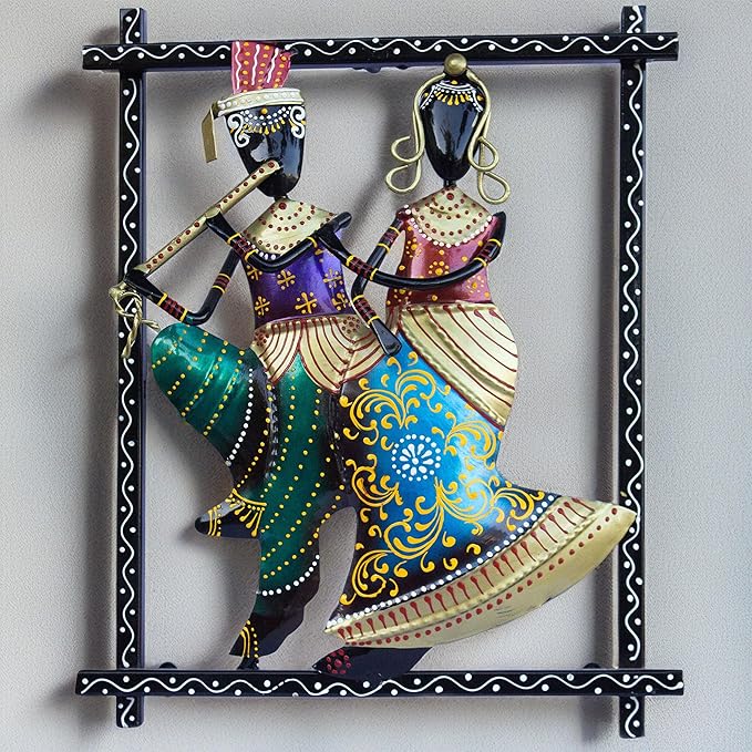 Introducing our exquisite Rajasthani handicraft wrought iron Radha Kishan showpiece, traditional hand painted home decor statue. This meticulously designed Lord Krishna and Radha showcases a vibrantly coloured statue with Krishna playing his flute. This stunning piece of art is a perfect choice for home decor and it can easily be hooked up as a wall hanging. This iron figurine set will add joy and vibrancy to any surroundings they are kept in.