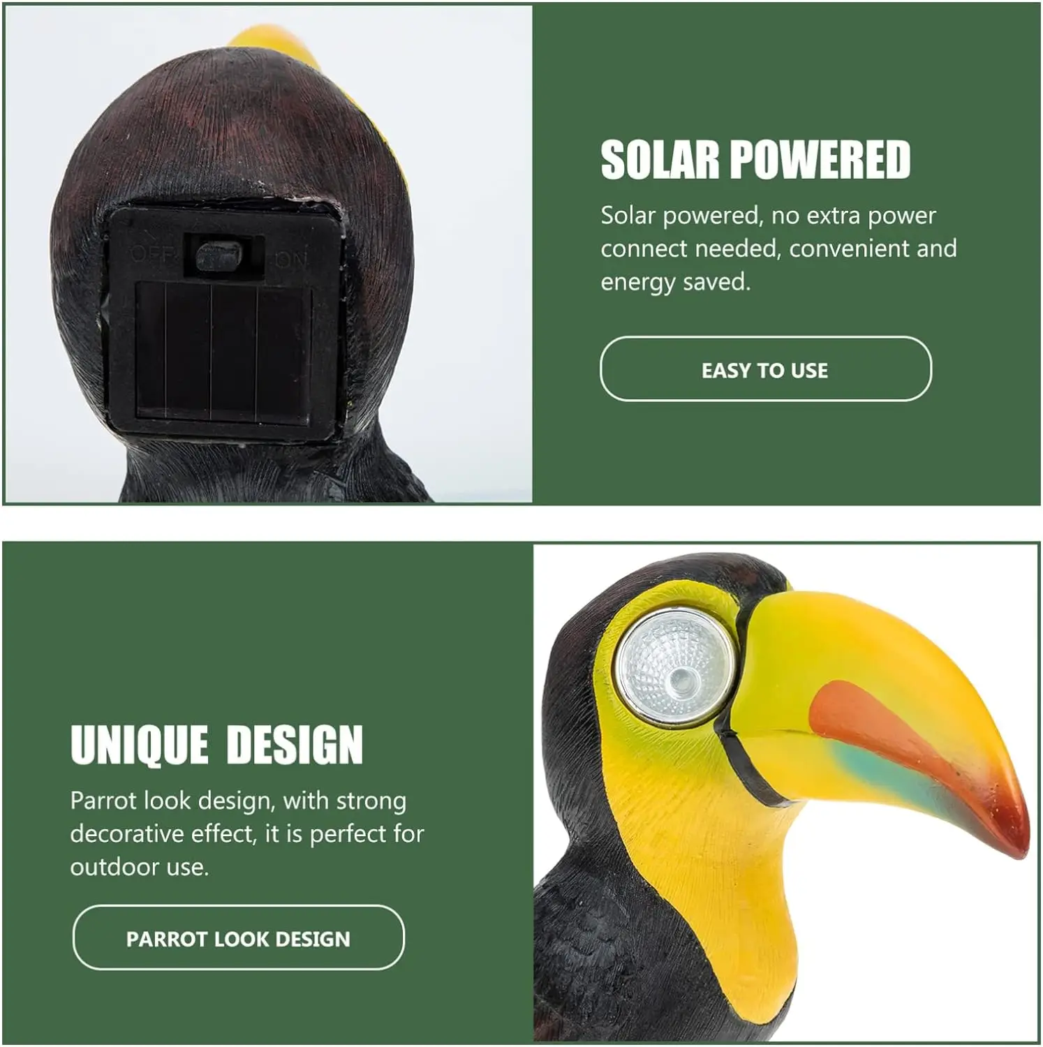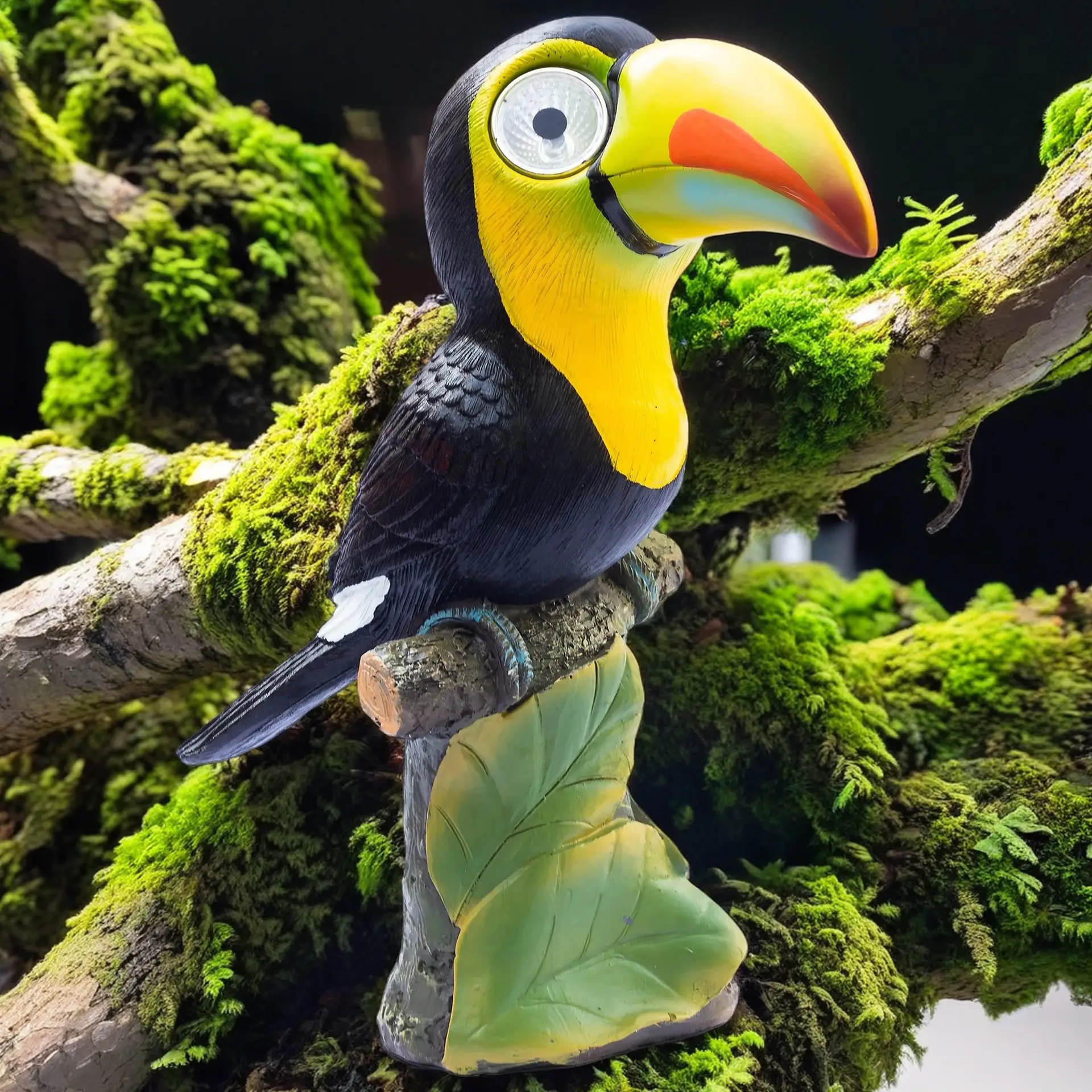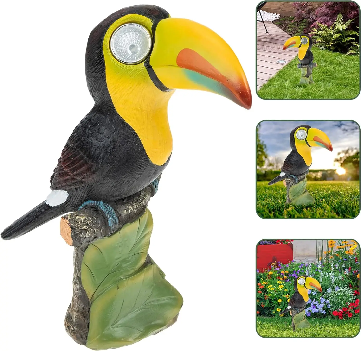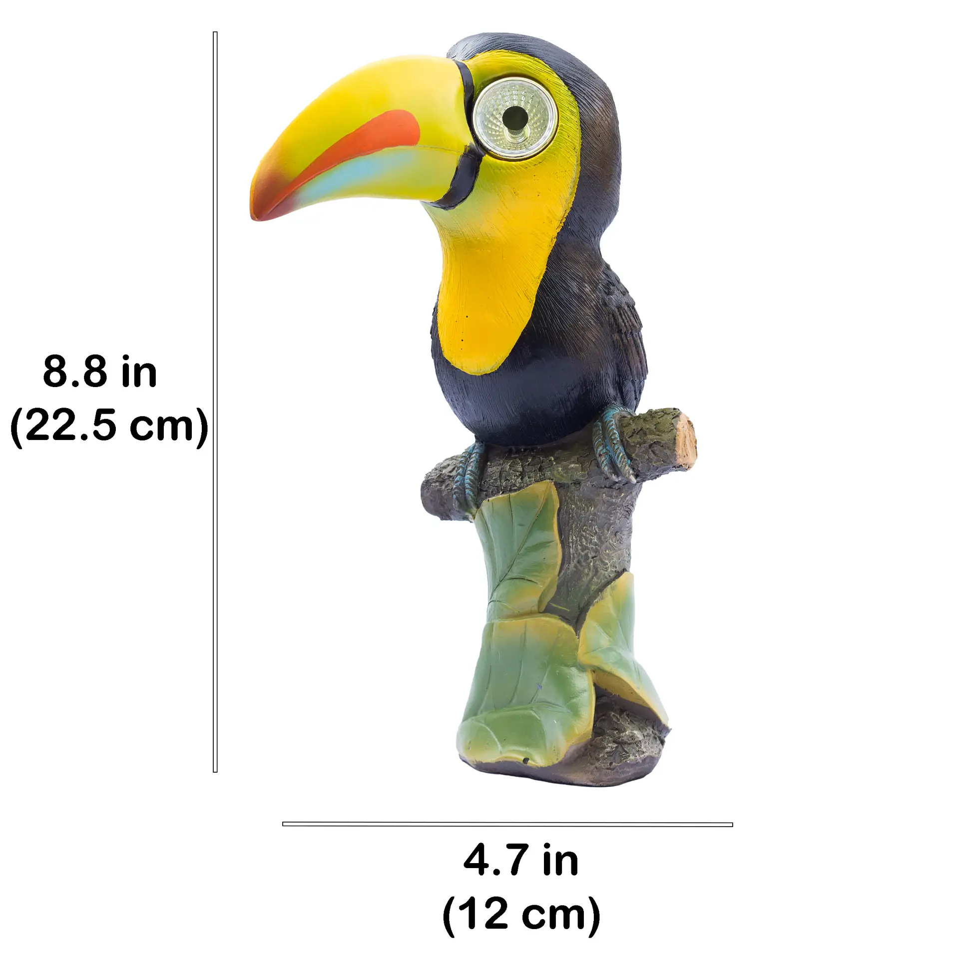 Solar-Powered LED Lights: The toucan’s eyes light up automatically at dusk, thanks to the built-in solar panel. No need for batteries or electrical wiring, making it a cool addition to your garden or patio.