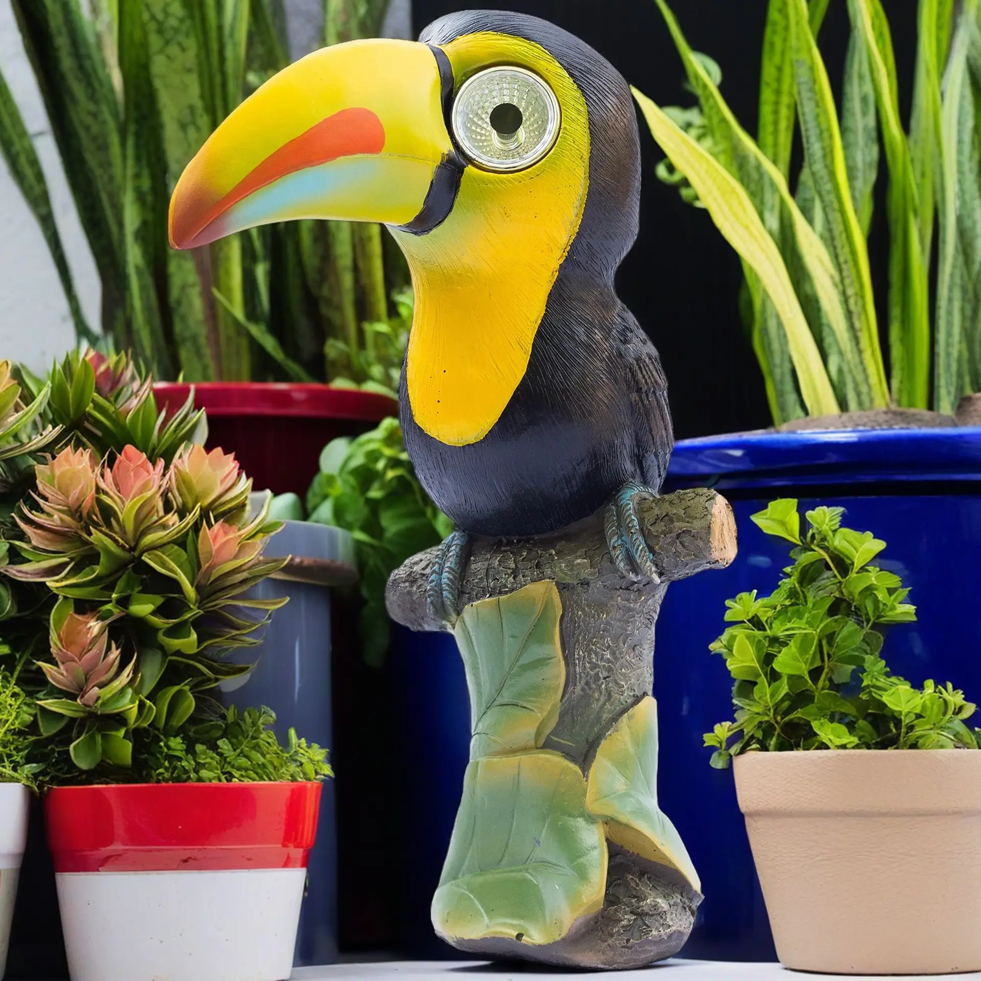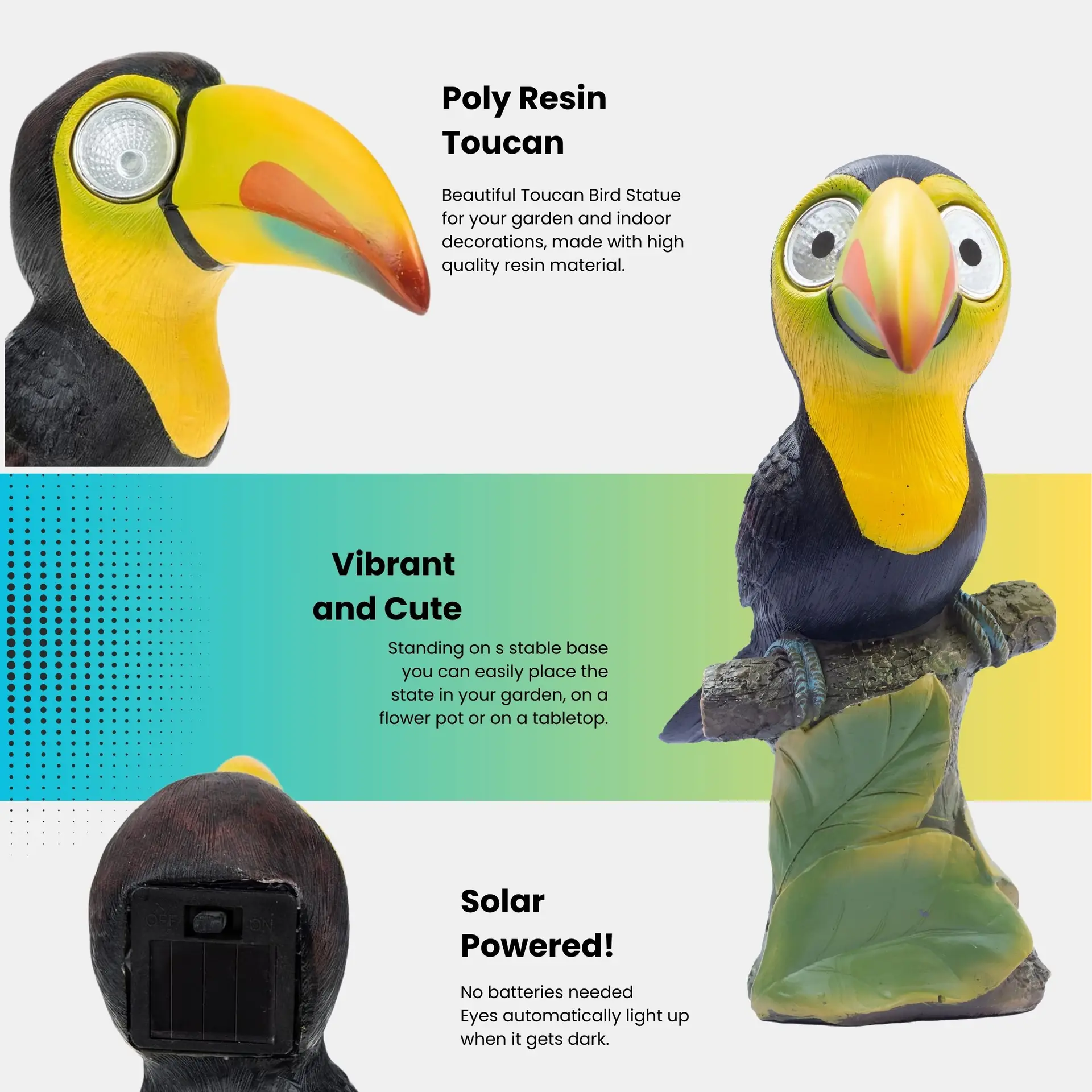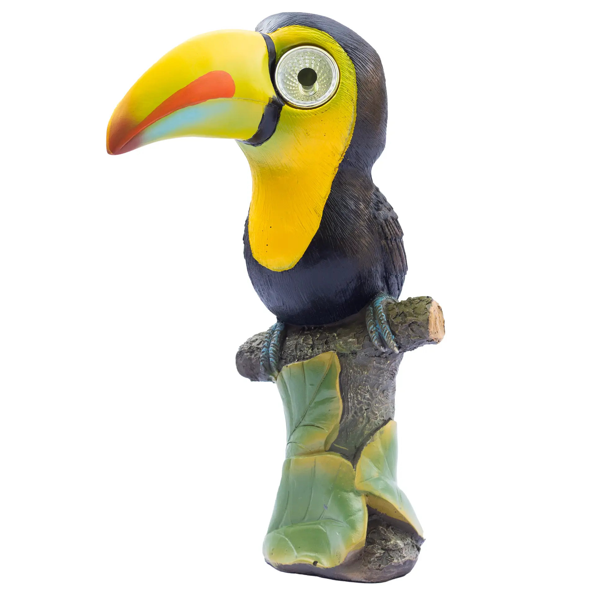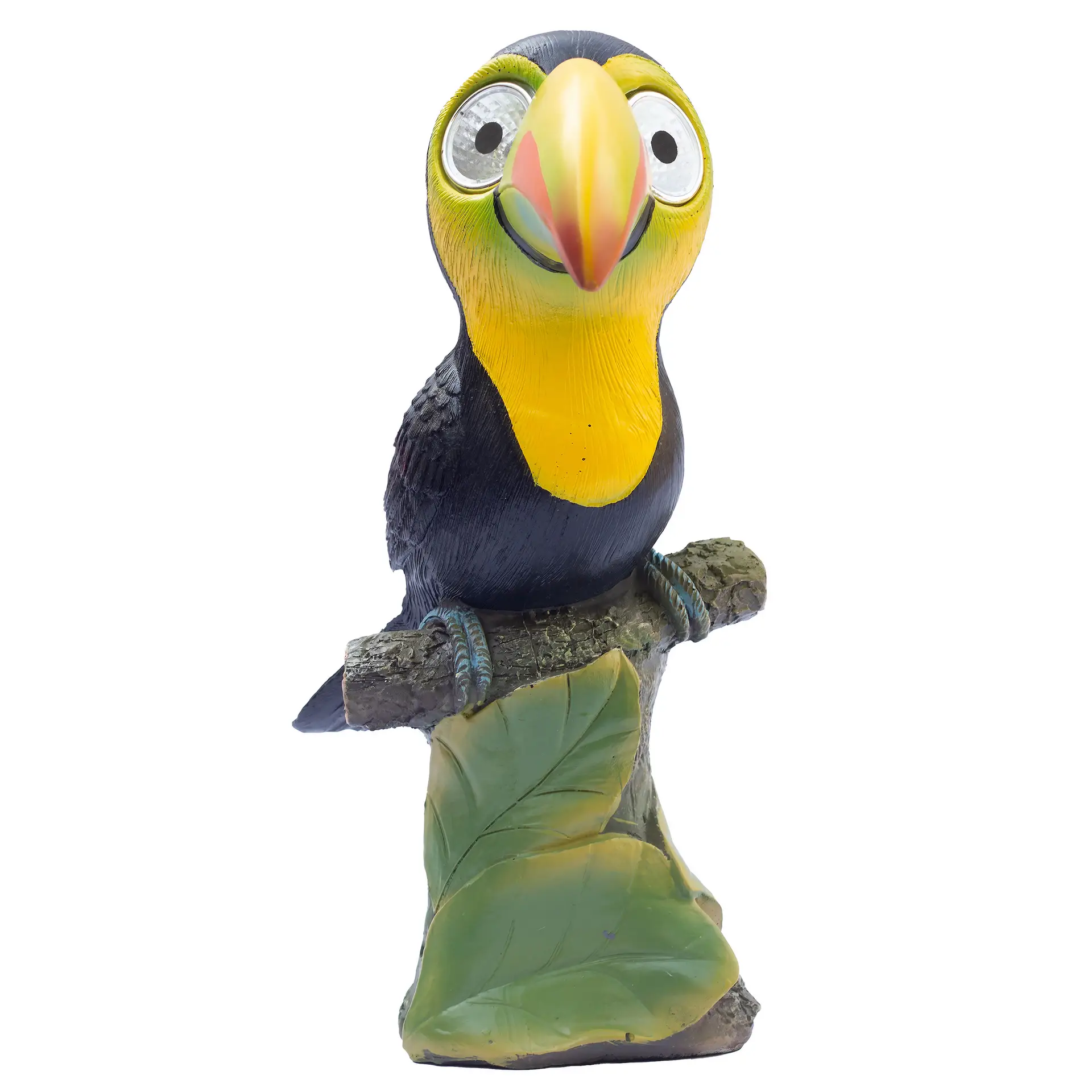 Solar-Powered LED Lights: The toucan’s eyes light up automatically at dusk, thanks to the built-in solar panel. No need for batteries or electrical wiring, making it a cool addition to your garden or patio.