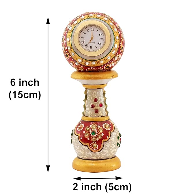 Introducing our beautiful meenakari work marble table clock, a truly captivating and elegant decorative showpiece designed to add a touch of timeless beauty to your home or office. Handcrafted from the finest quality Makrana marble, renowned for its purity and pristine white appearance, this exceptional piece of art is a testament to skilled craftsmanship and Indian heritage.