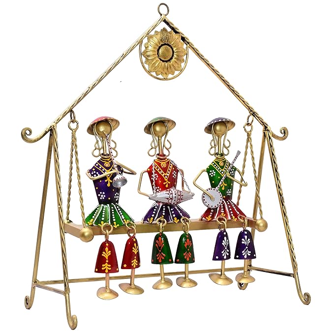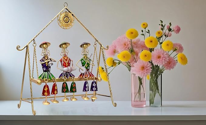 This handcrafted Rajasthani musician jhula showpiece brings the vibrant spirit of traditional folk art into modern home decor. Designed with three intricately detailed musician dolls seated on a decorative swing, this metal tabletop showpiece reflects the rich cultural heritage of Rajasthan and the skill of Indian artisans.