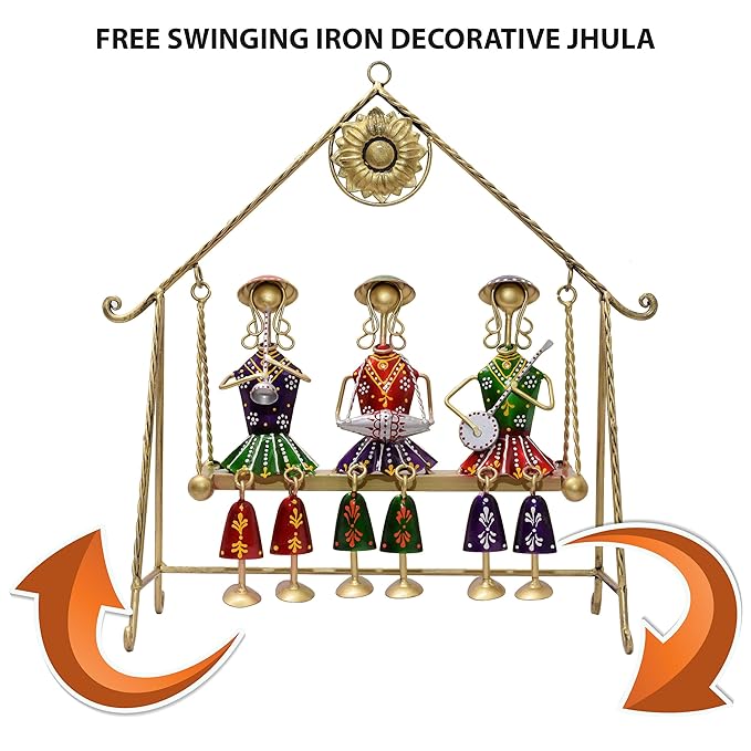Introducing our exquisite Rajasthani handicraft wrought iron 16×16 inch large swing set decorative showpiece: a stunning piece of art that adds elegance and charm to any space. This meticulously designed showpiece showcases three traditional dolls sitting on a swing, they hold a sitar, drum and a shehnai. The jhula can freely swing, when manually touched or even when kept on a table under the ceiling fan, mesmerizing the onlookers.