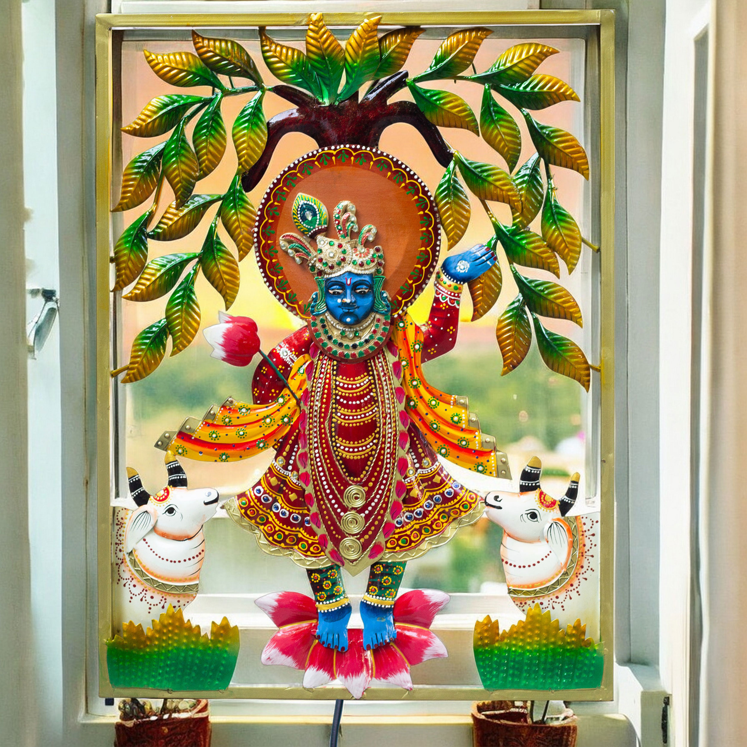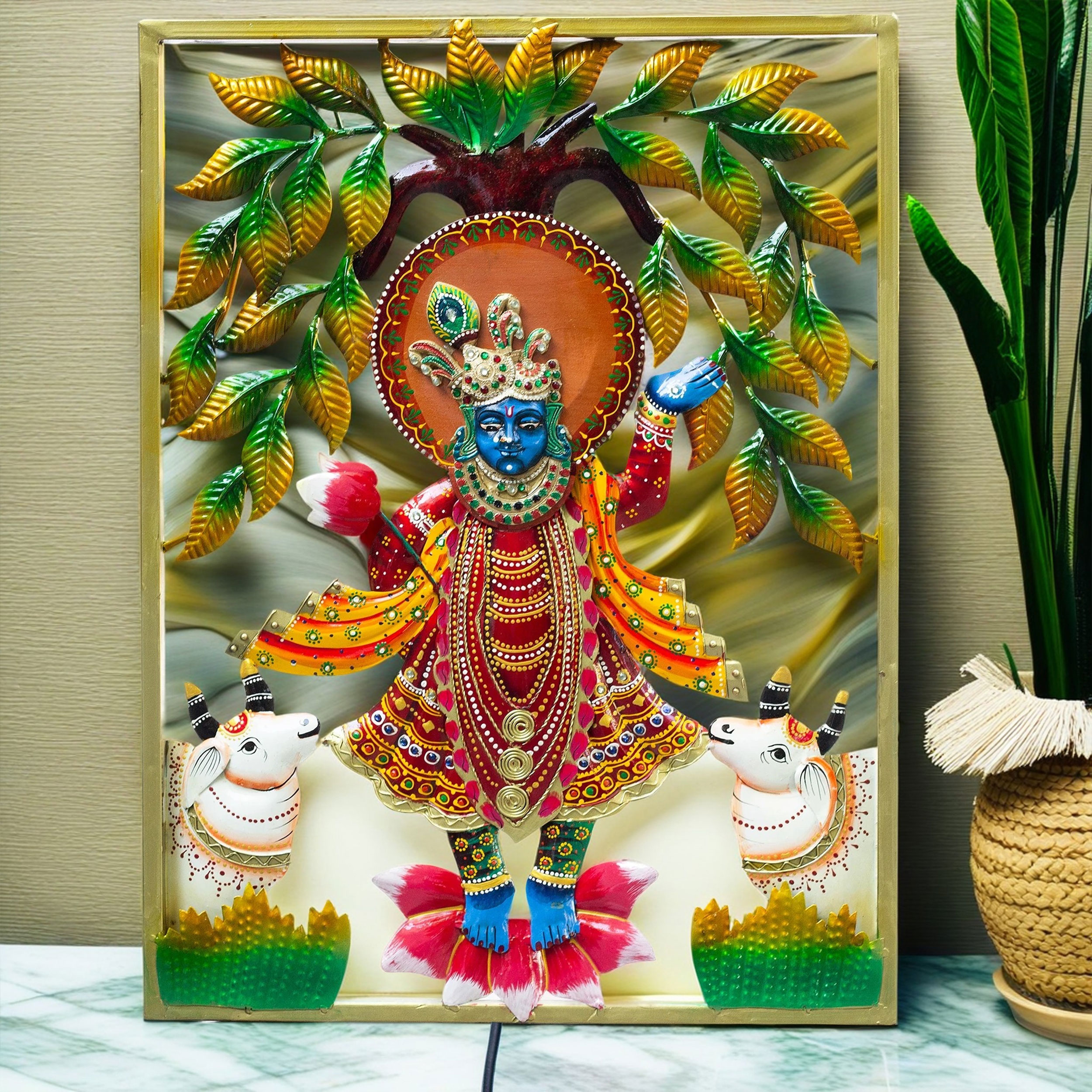 Bring home the divine grace of Lord Shrinathji, a cherished form of Lord Krishna, with this exquisitely handcrafted iron metal wall décor. Measuring 24 inches in height, 18 inches in length, and 2 inches in width, this enchanting artwork is adorned with vibrantly colored details and jeweled accents that capture every intricate feature of Shrinathji’s majestic presence. Surrounded by graceful cows symbolizing devoted followers, this wall hanging beautifully conveys the ideals of divine love, grace, and equanimity.