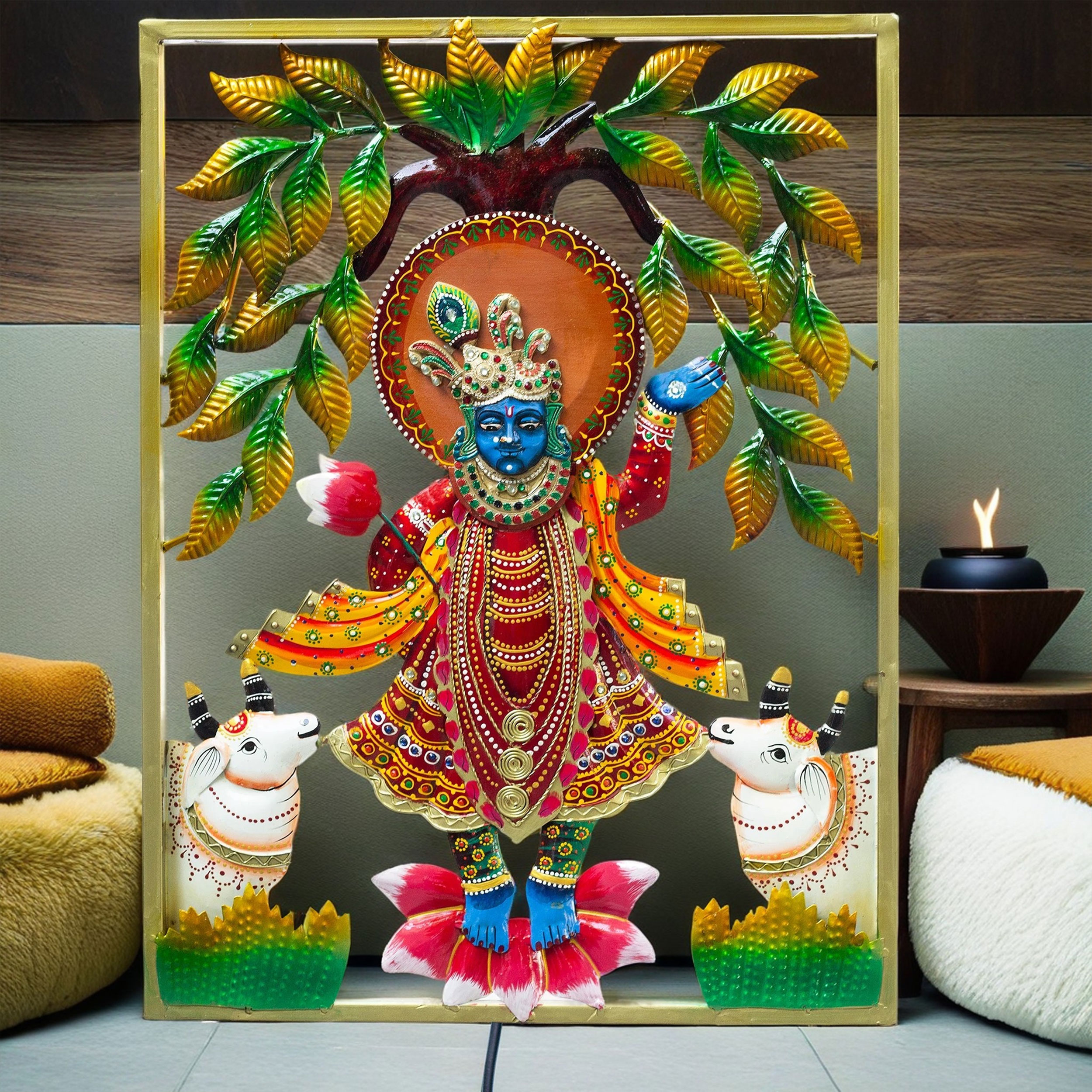 Symbolic & Spiritual: Depicts the divine blessings of Lord Krishna, promoting positivity, harmony, and devotion.