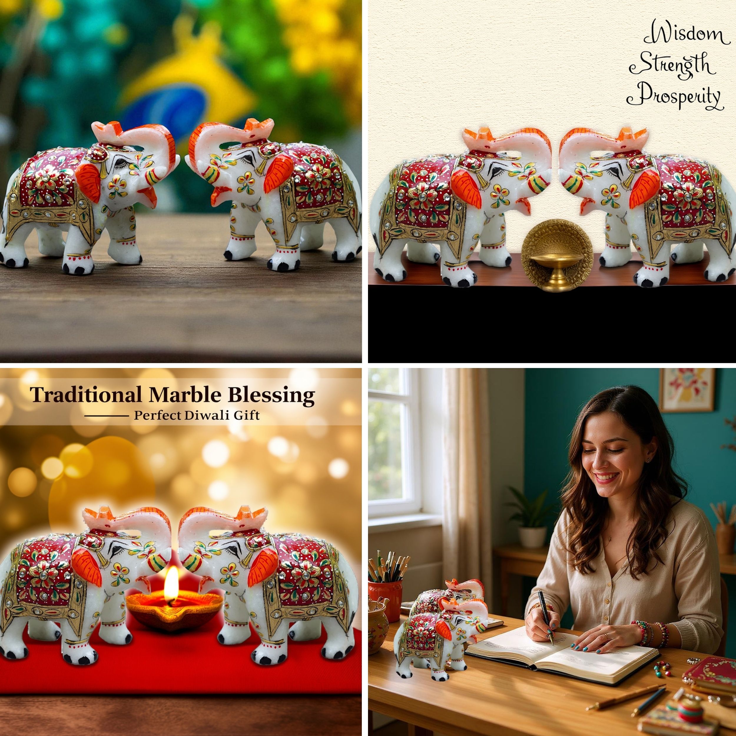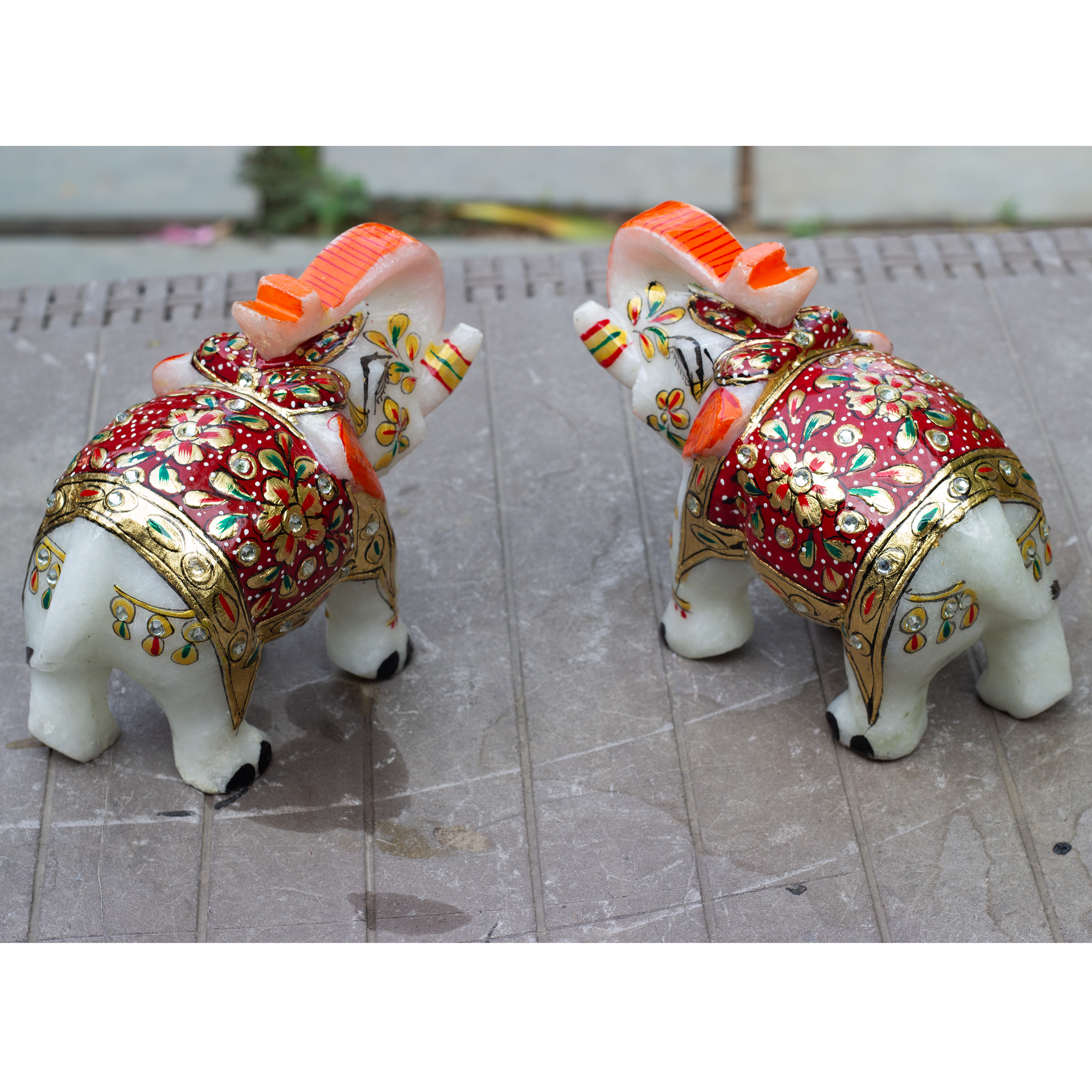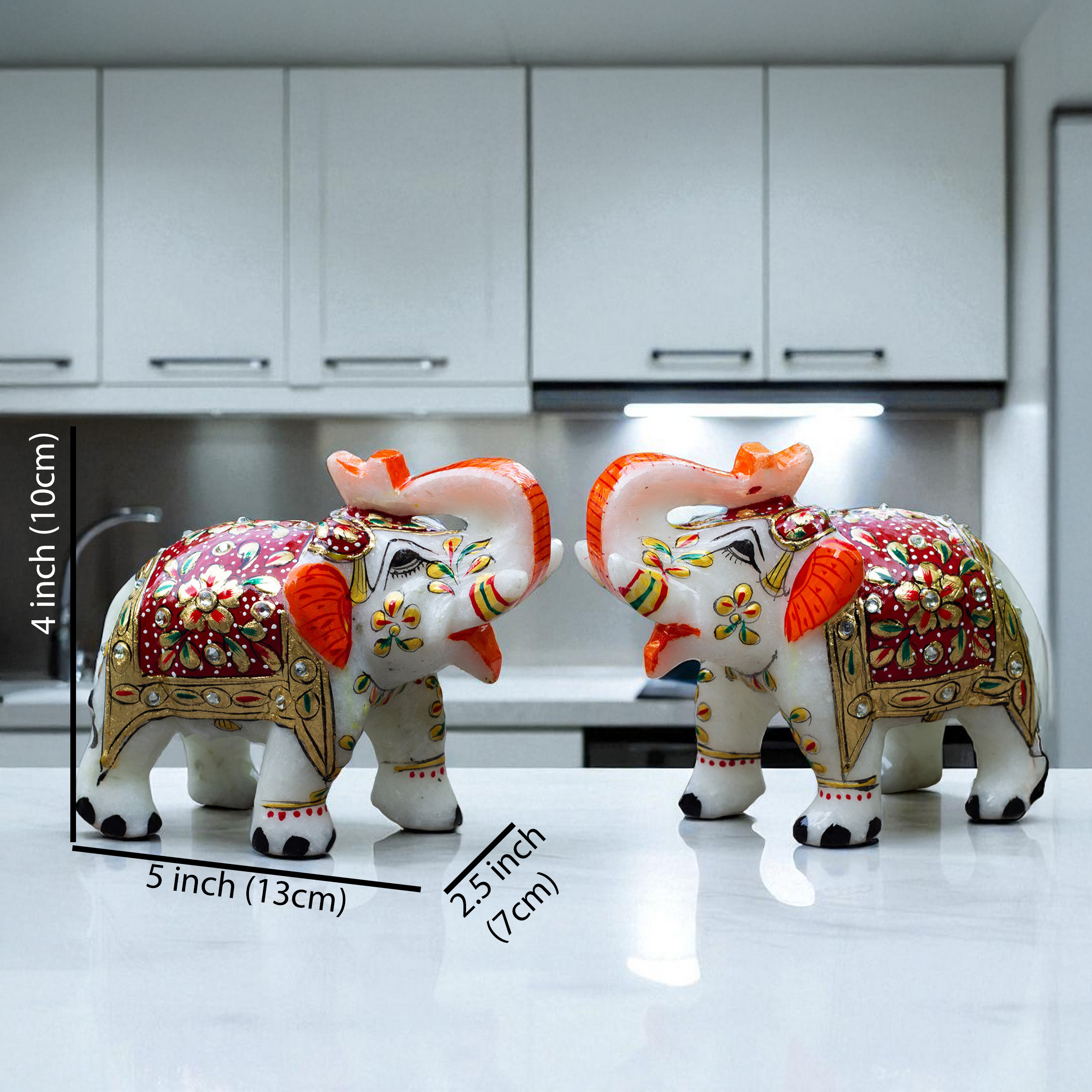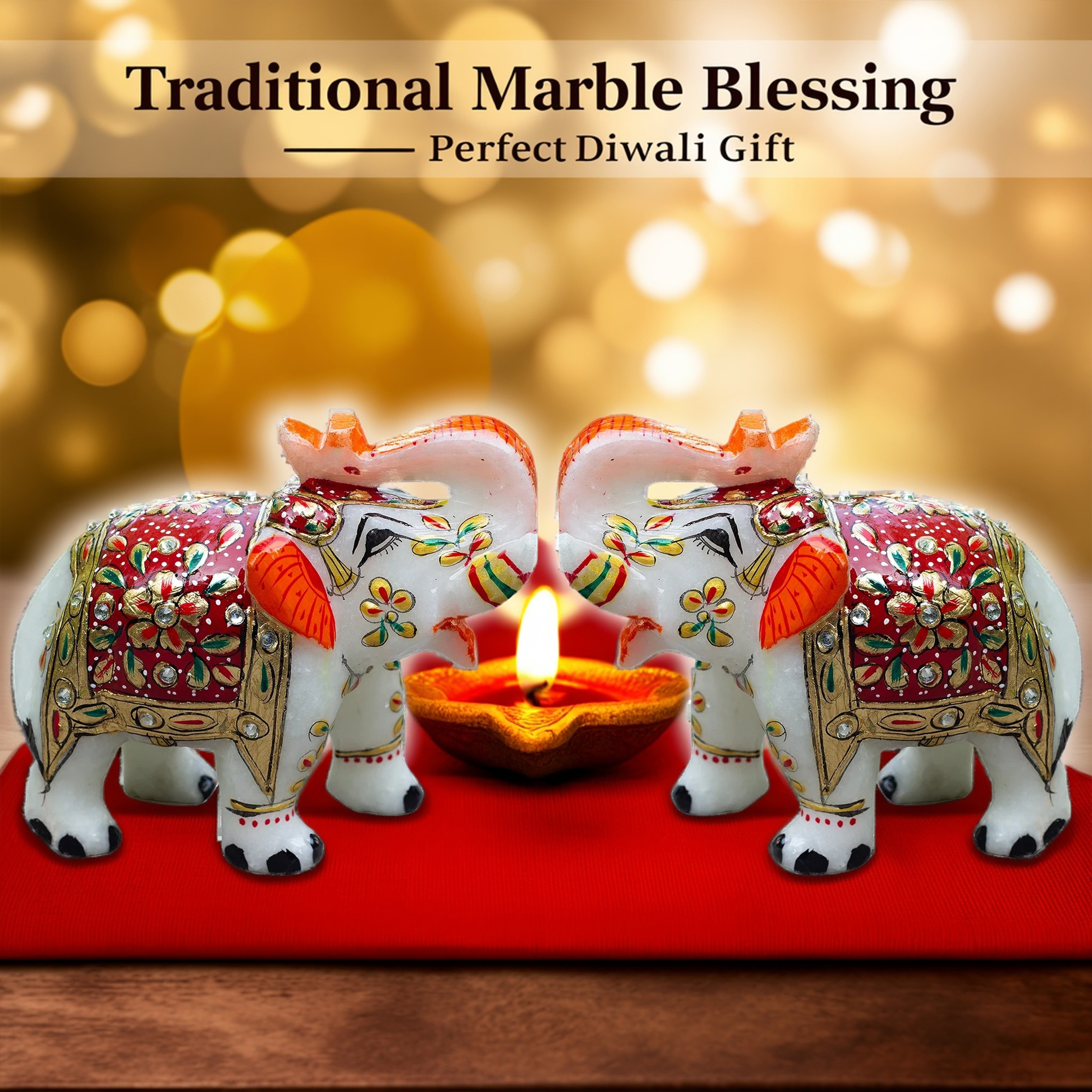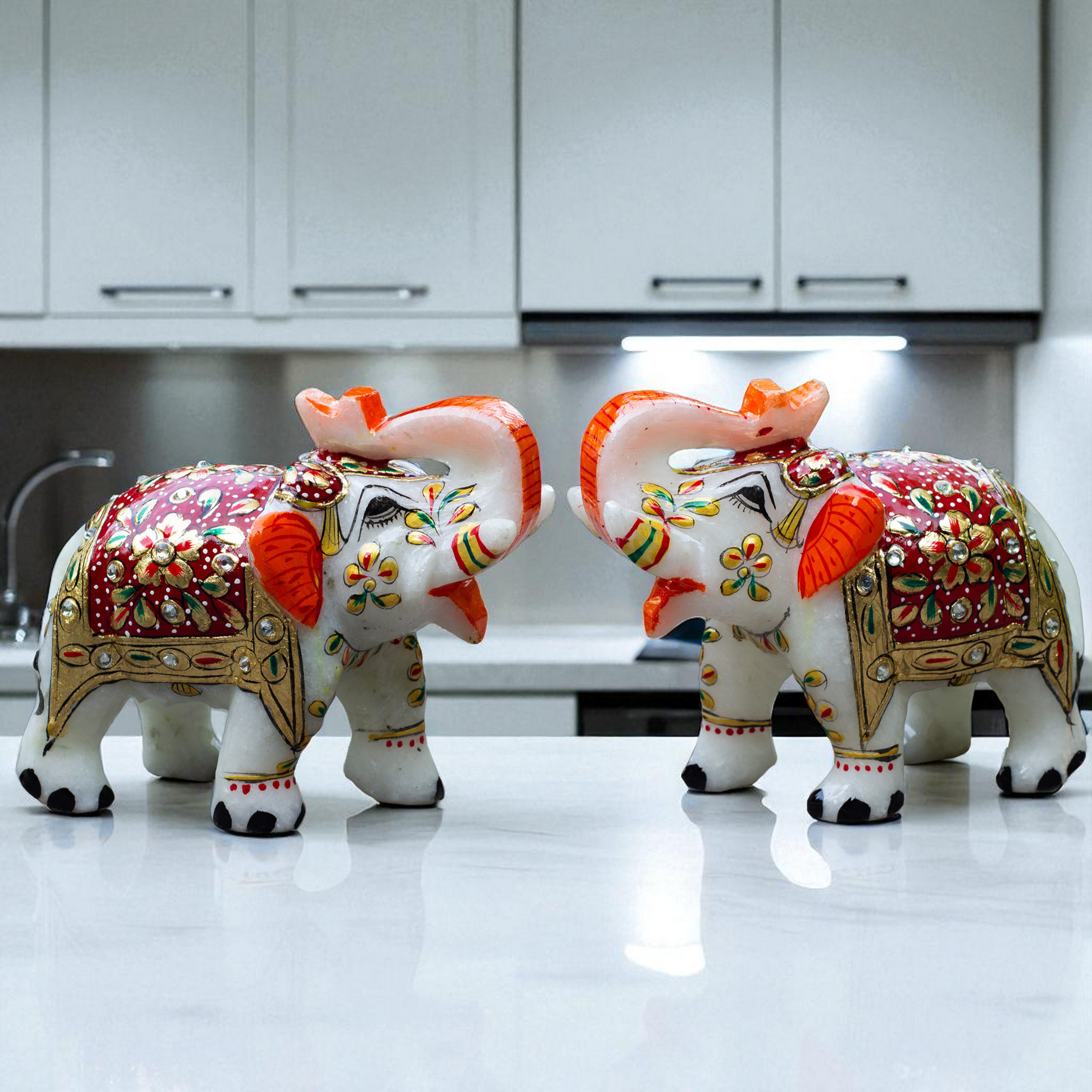 Each elephant is hand-painted by skilled artisans, using vibrant festive colors like red, gold, green, and yellow, and is adorned with decorative crystals for a royal and eye-catching look. Weighing 1 kg, the statue has a solid, durable feel and its natural white shine reflects the purity of marble and traditional craftsmanship.