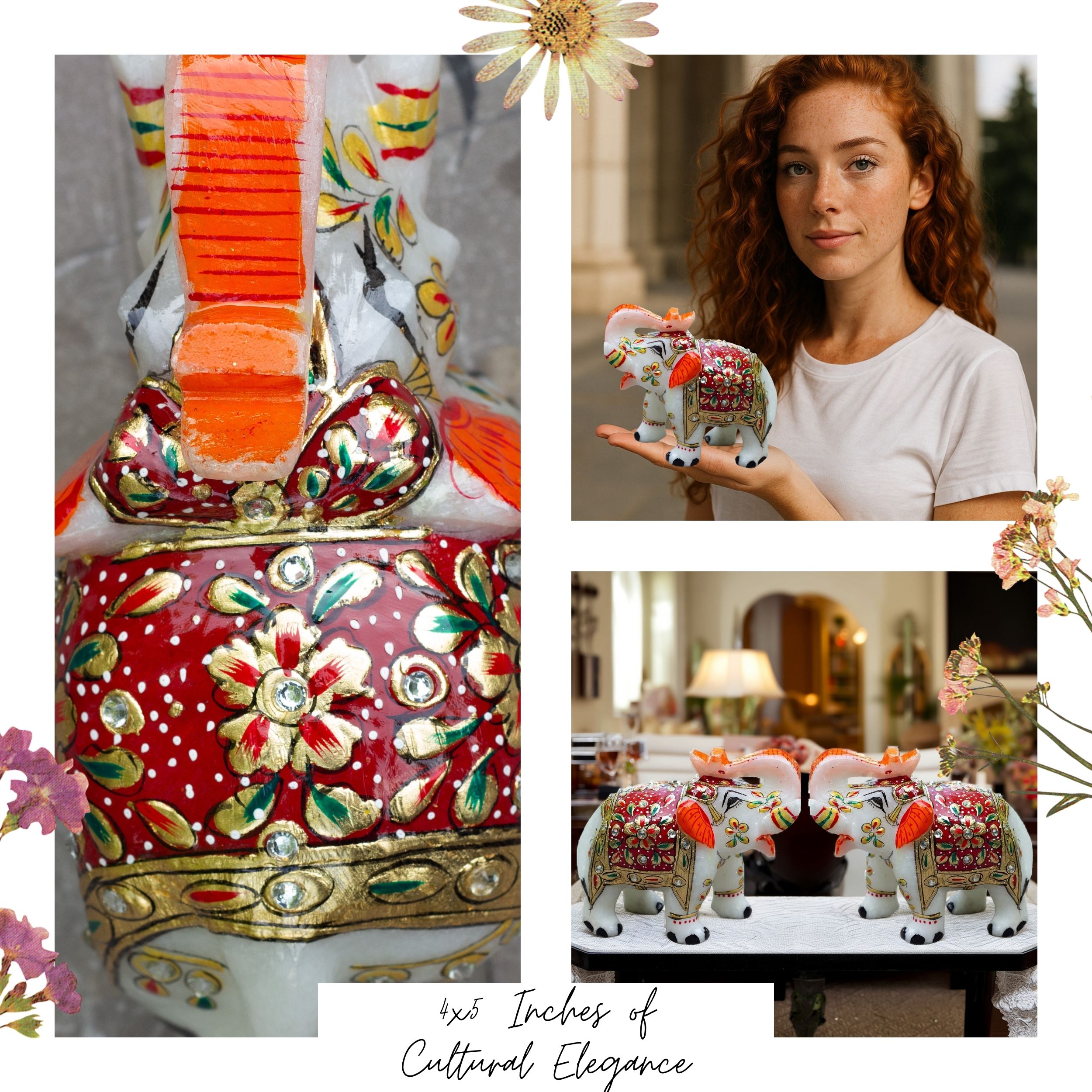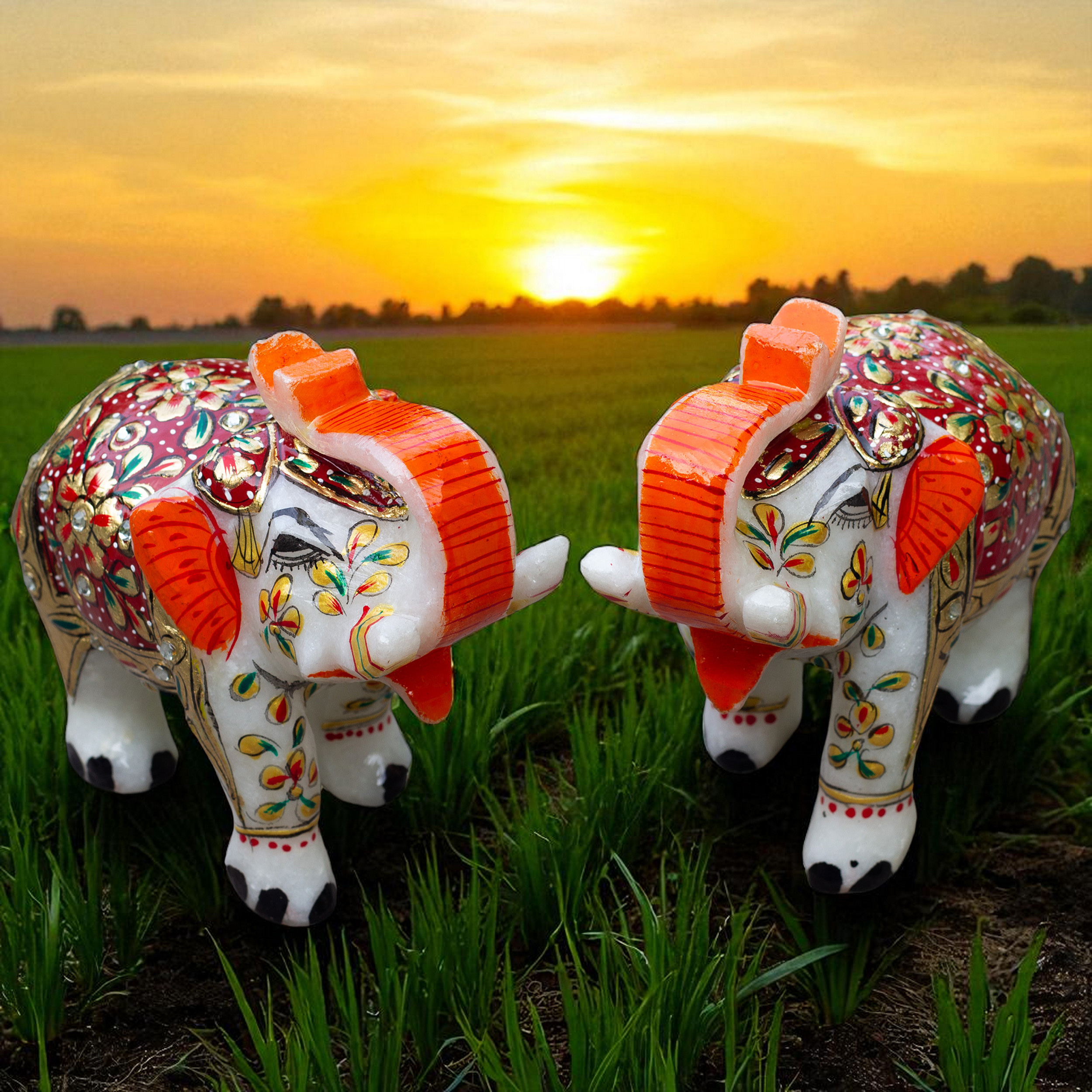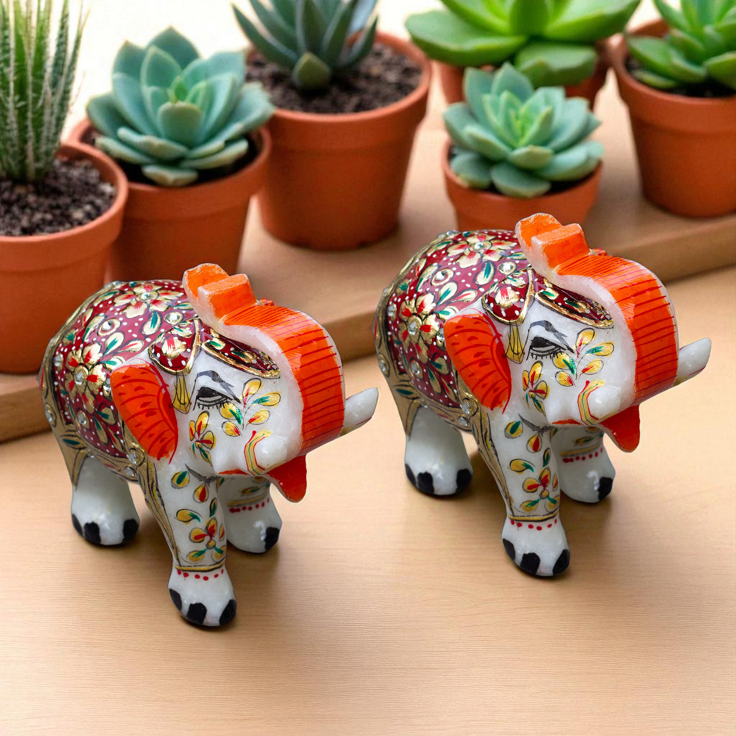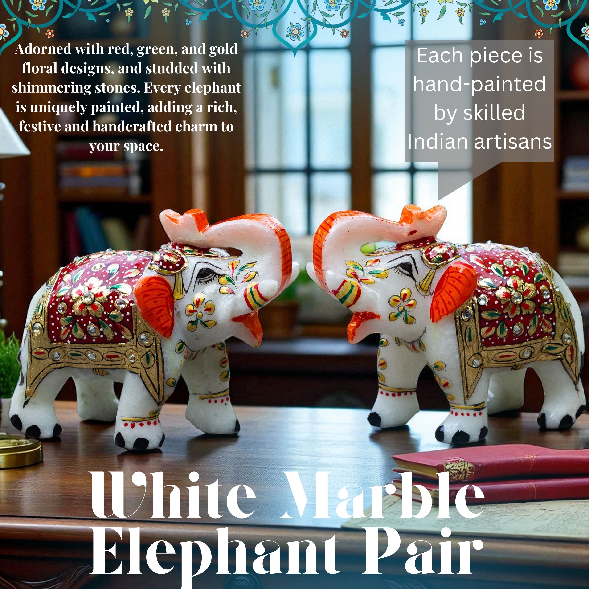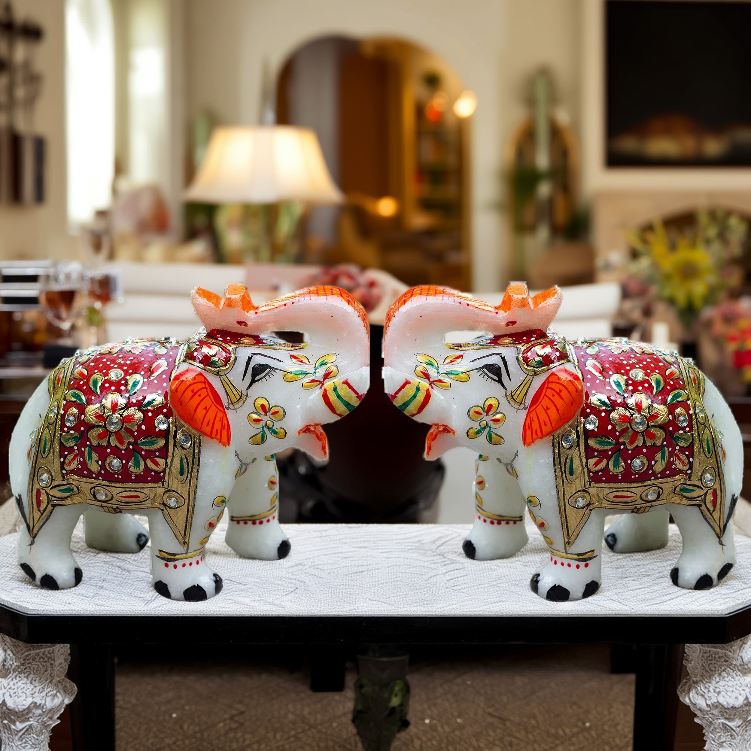 Each elephant is hand-painted by skilled artisans, using vibrant festive colors like red, gold, green, and yellow, and is adorned with decorative crystals for a royal and eye-catching look. Weighing 1 kg, the statue has a solid, durable feel and its natural white shine reflects the purity of marble and traditional craftsmanship.
