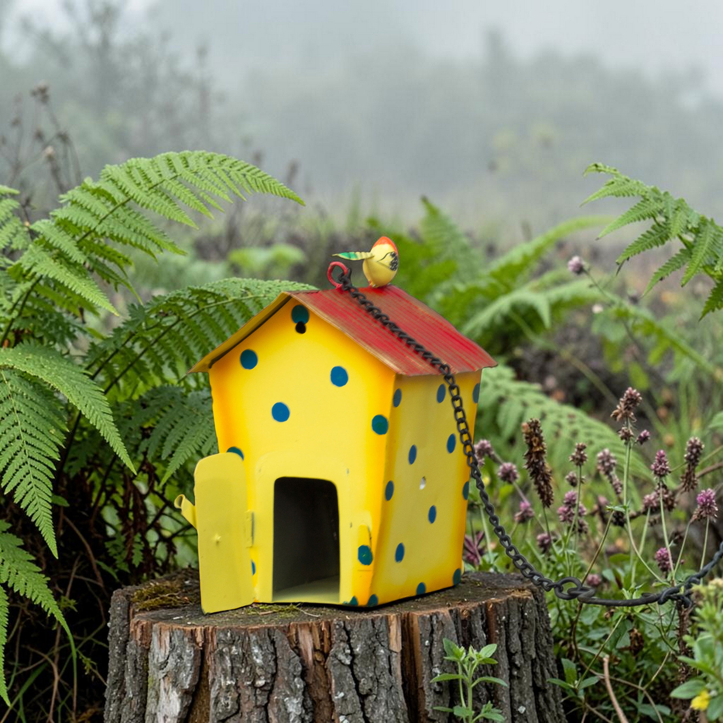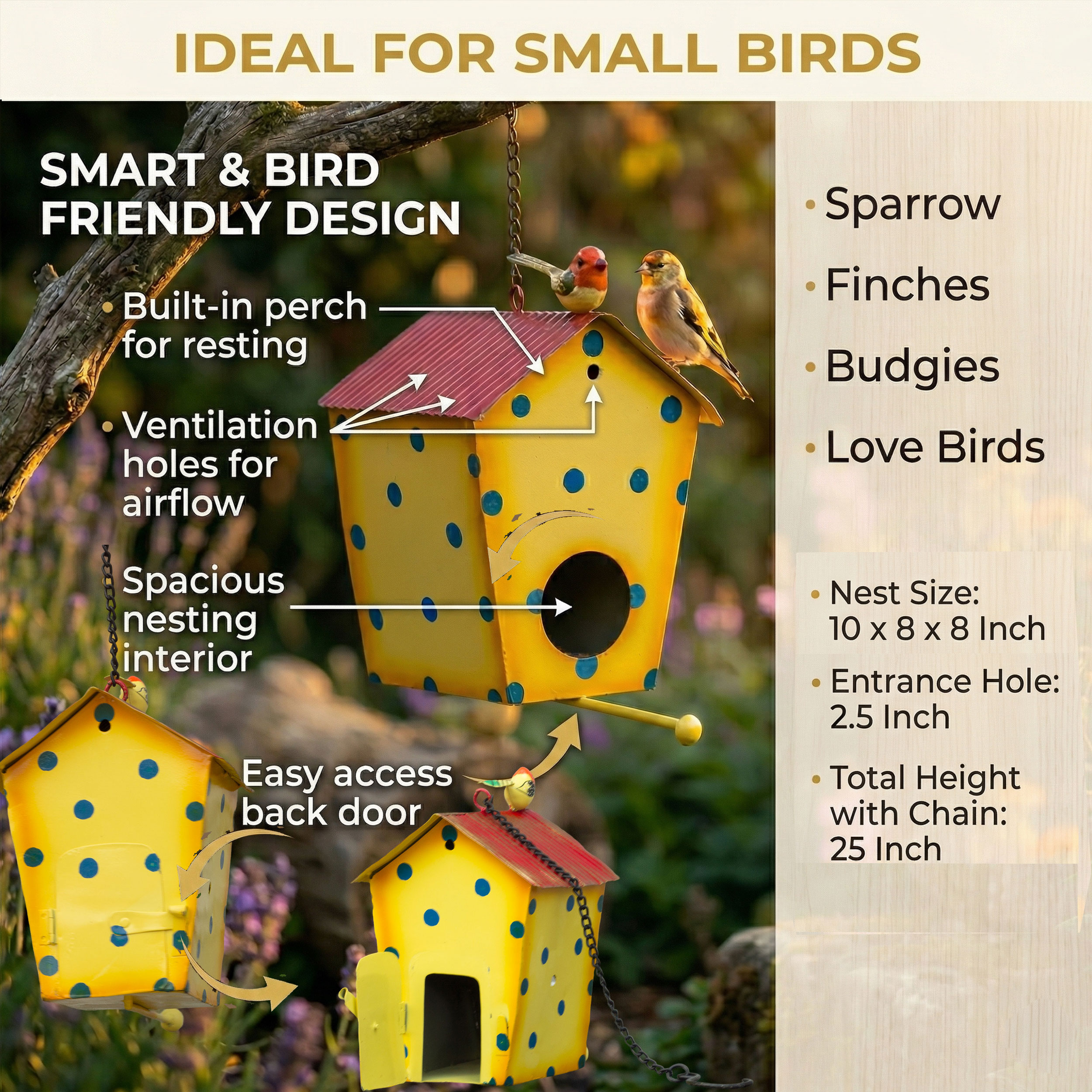 DURABLE METAL BUILD WITH EASY HANGING Constructed from sturdy metal, this bird house is designed for outdoor use. The strong hook and chain allow easy hanging on tree branches, balcony hooks, garden areas, or aviaries, making it a versatile addition to your home decor.