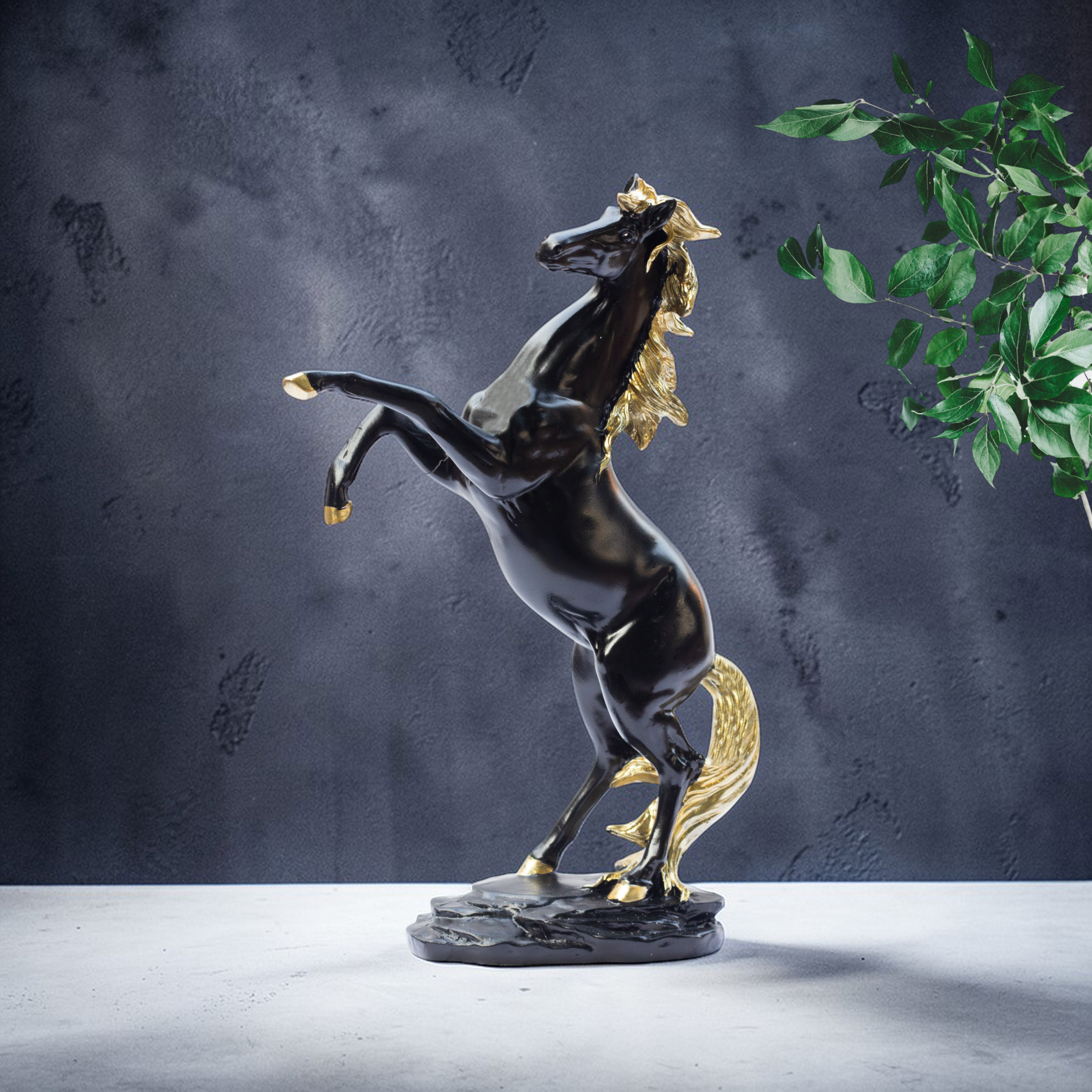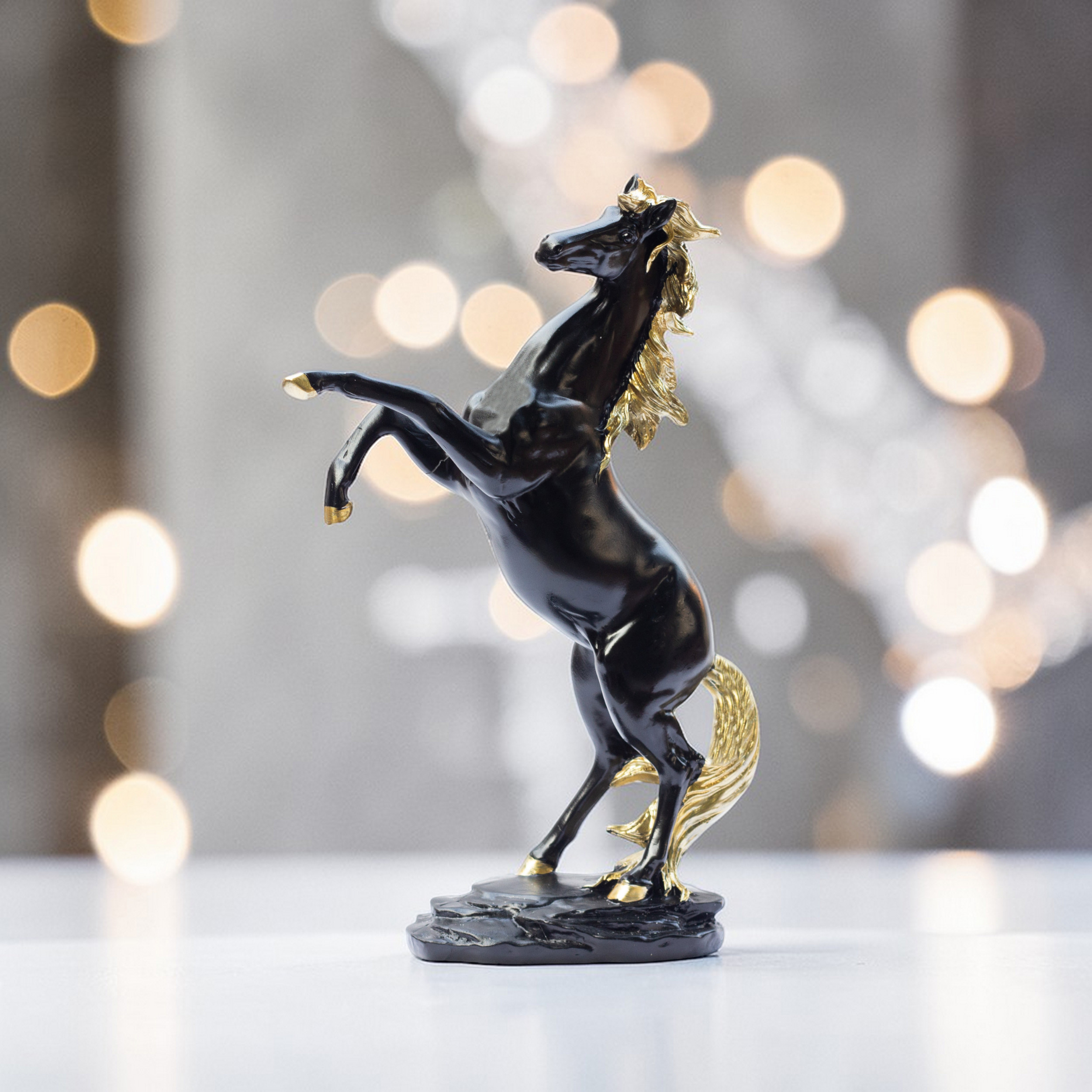 Commanding, majestic, and deeply symbolic, this premium black-gold horse statue is crafted from high-grade polyresin using precision mold-casting techniques. The result is a beautifully detailed sculpture featuring a glossy jet-black body paired with hand-painted gold mane, tail, and hooves — a striking contrast that transforms any space into a gallery of pure luxury and intention. Each curve, each sinew, and each strand of the golden mane is rendered with exceptional artistry.