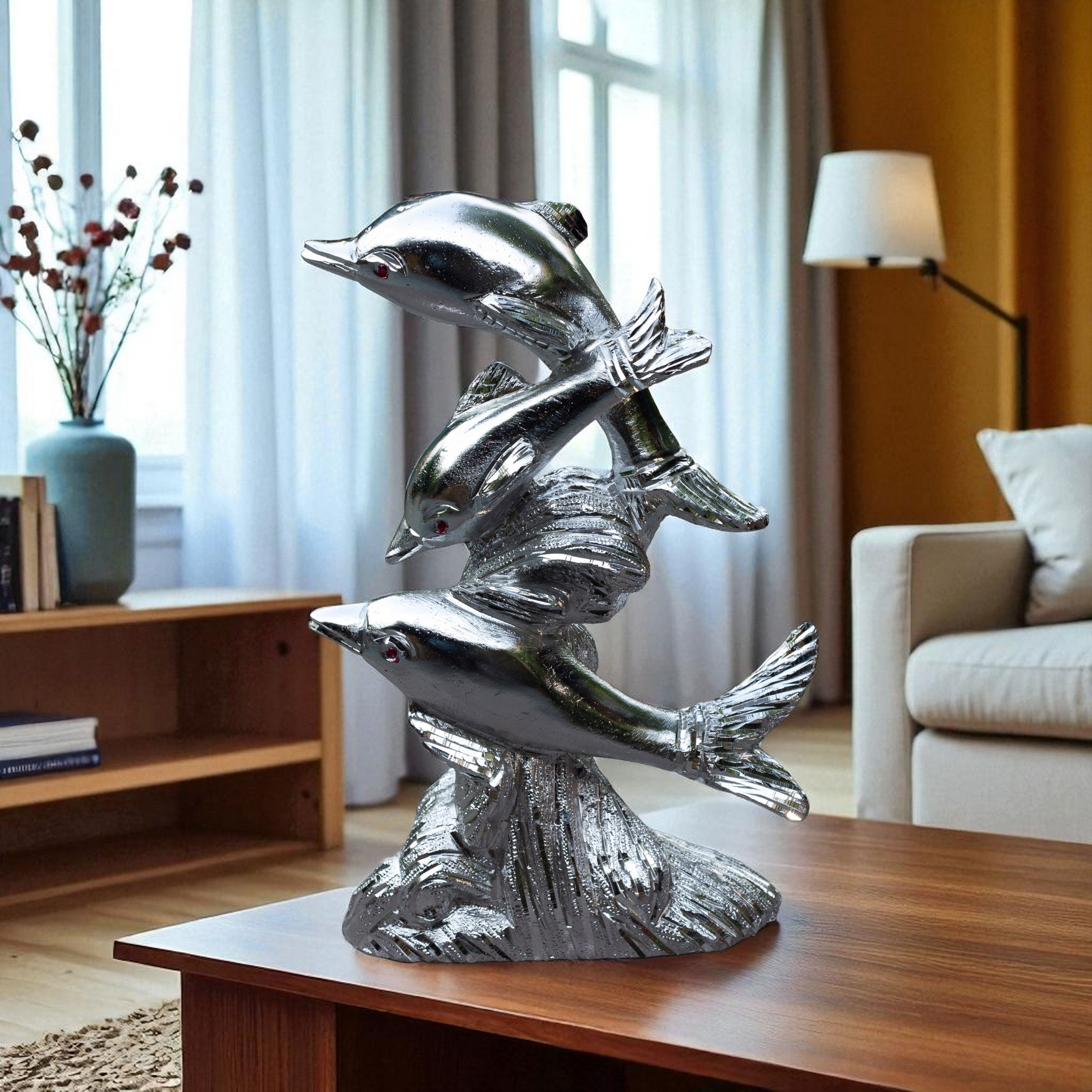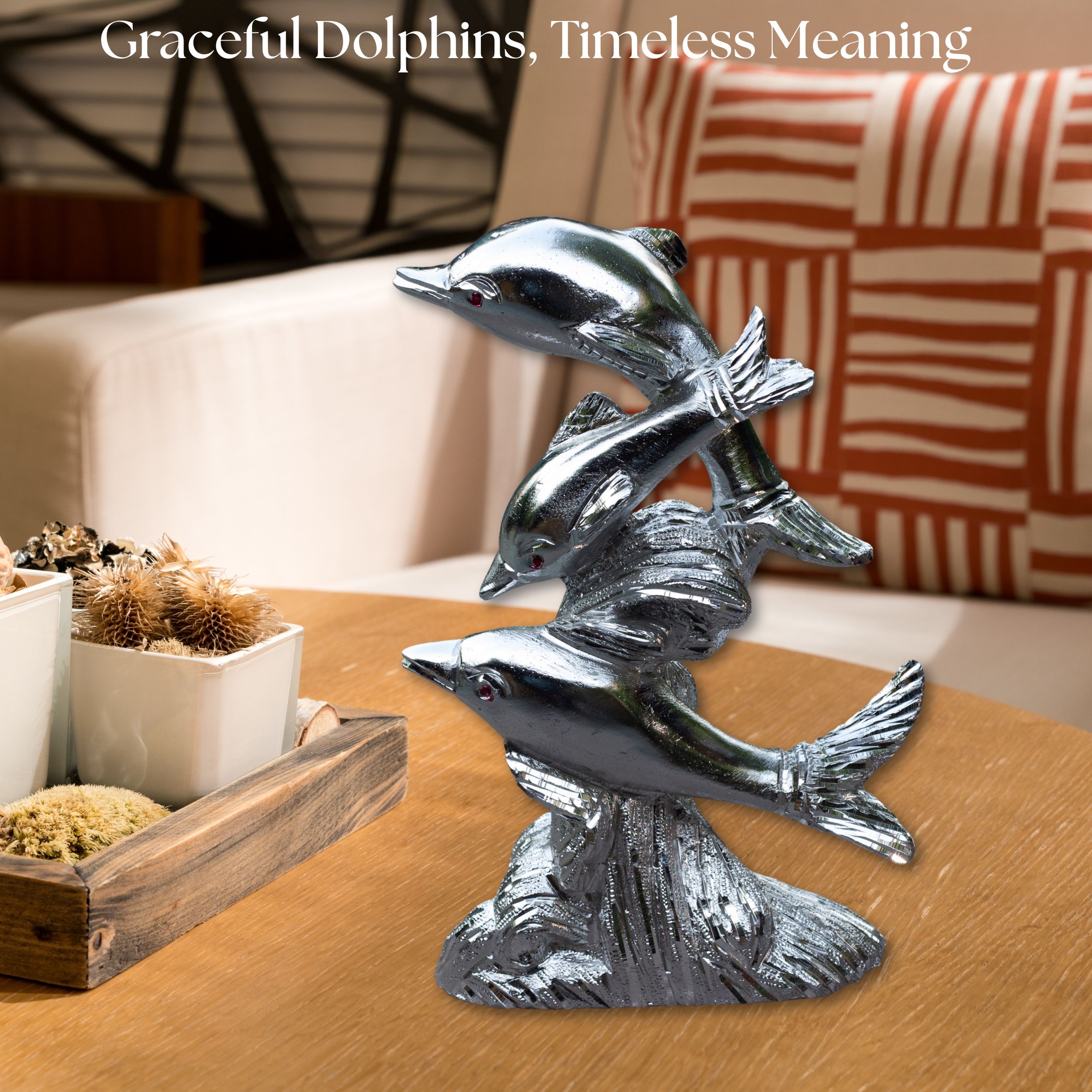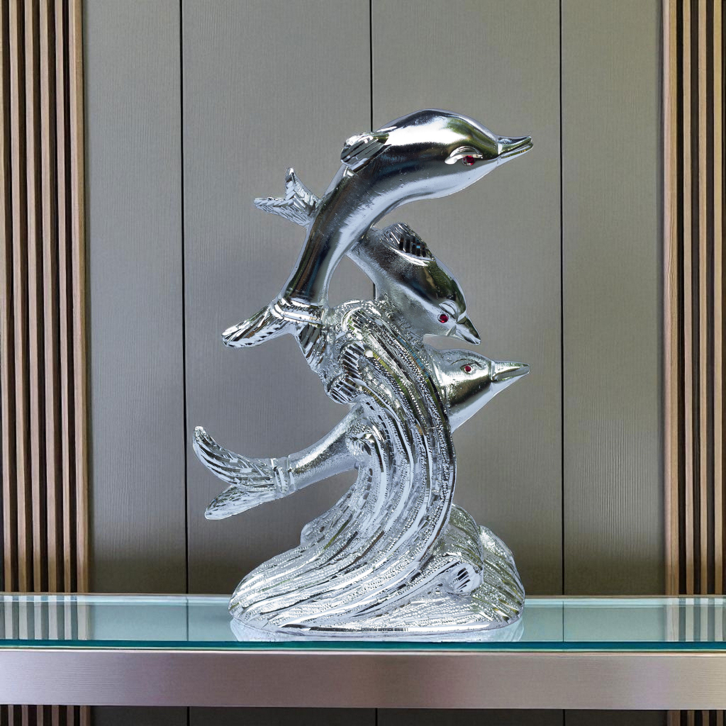 Measuring 9 inches in height, 6 inches in length, and with a 5-inch stable base, this dolphin statue is sturdy yet stylish, weighing approx. 1 kg. The gleaming silver surface enhances its modern aesthetic while retaining the timeless appeal of traditional metal crafts. Whether placed on a living room table, showcase, office desk, or entrance console, it instantly elevates your decor with its elegant design and symbolic meaning.