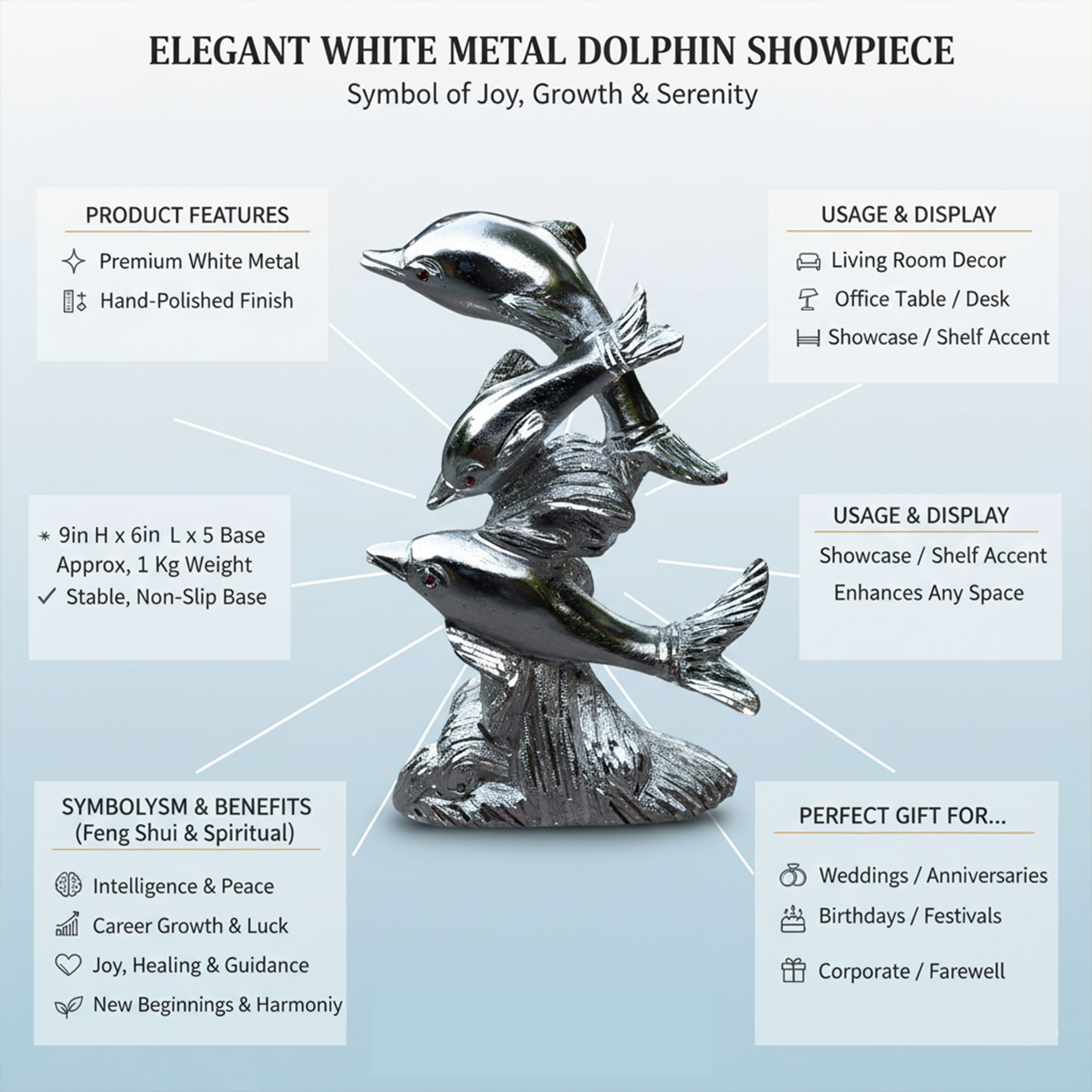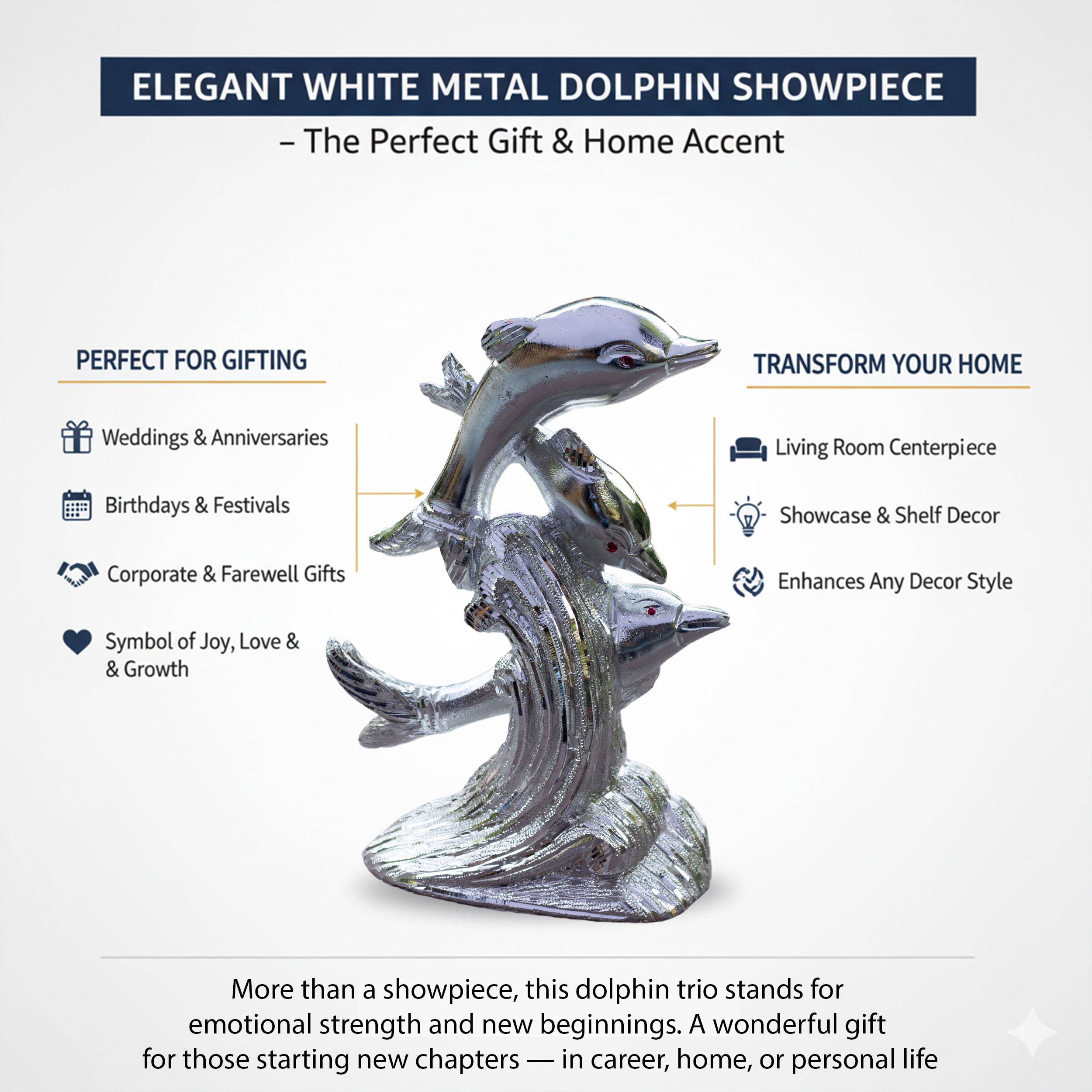Add elegance and positive energy to your home with this Premium White Metal Dolphin Showpiece, crafted with fine artistry and polished to a dazzling silver finish. Designed with three dolphins leaping gracefully above ocean waves, this figurine reflects intelligence, joy, and harmony—qualities long associated with dolphins in both Feng Shui and spiritual symbolism.