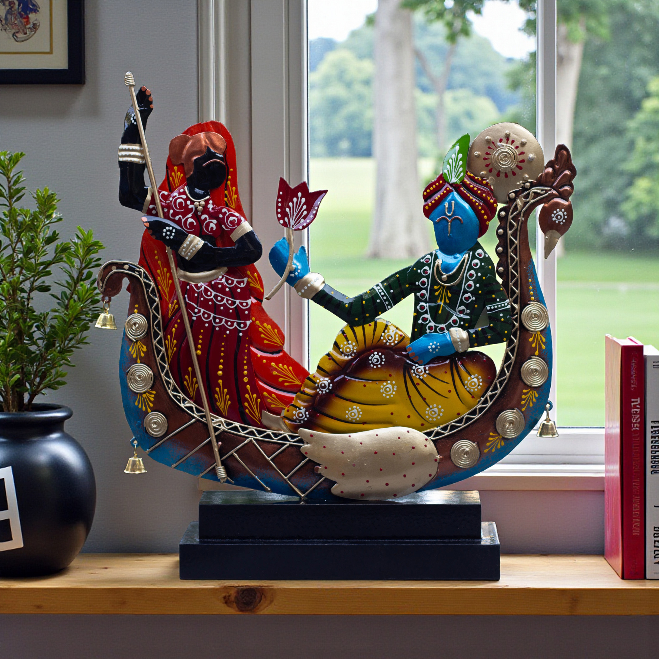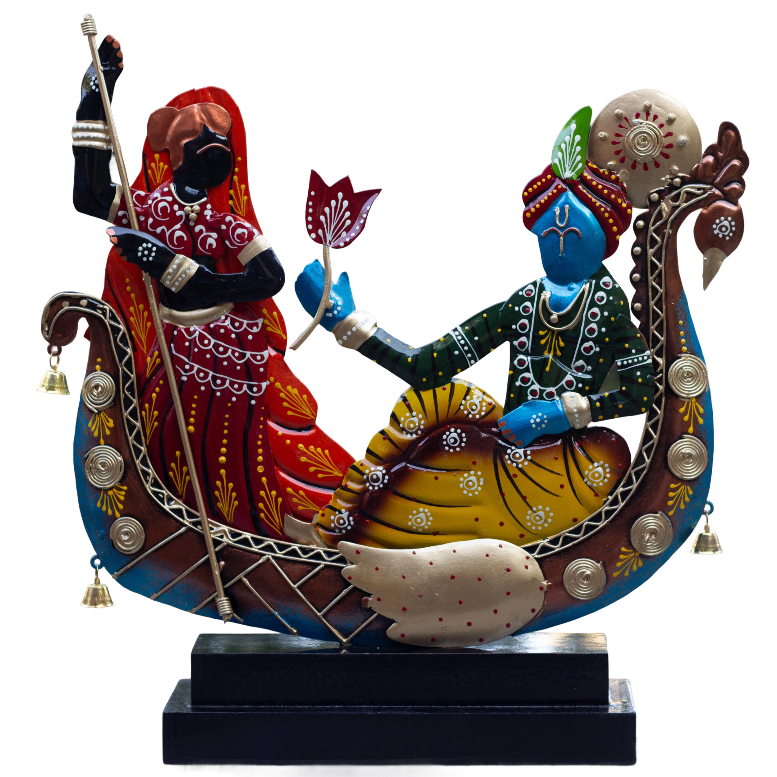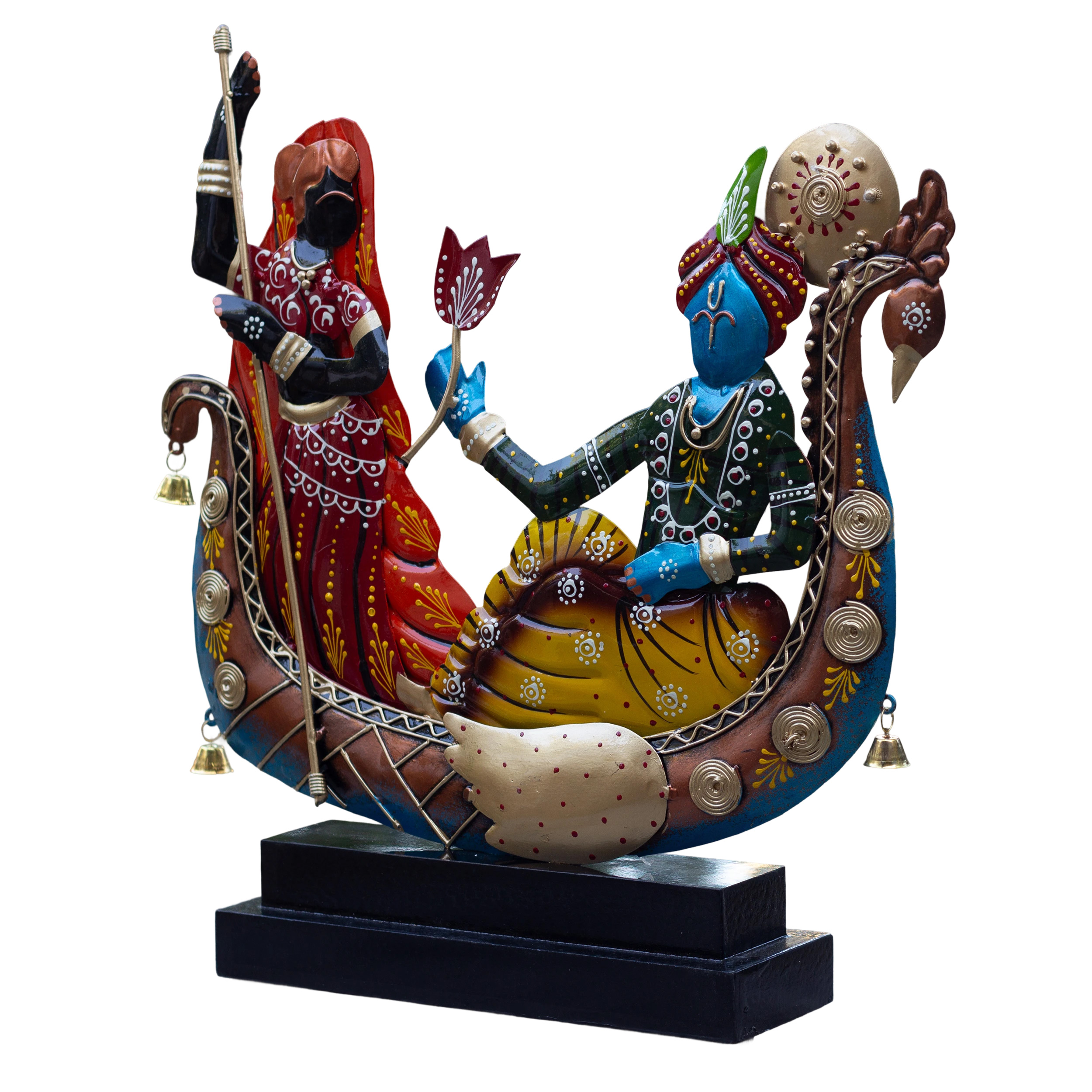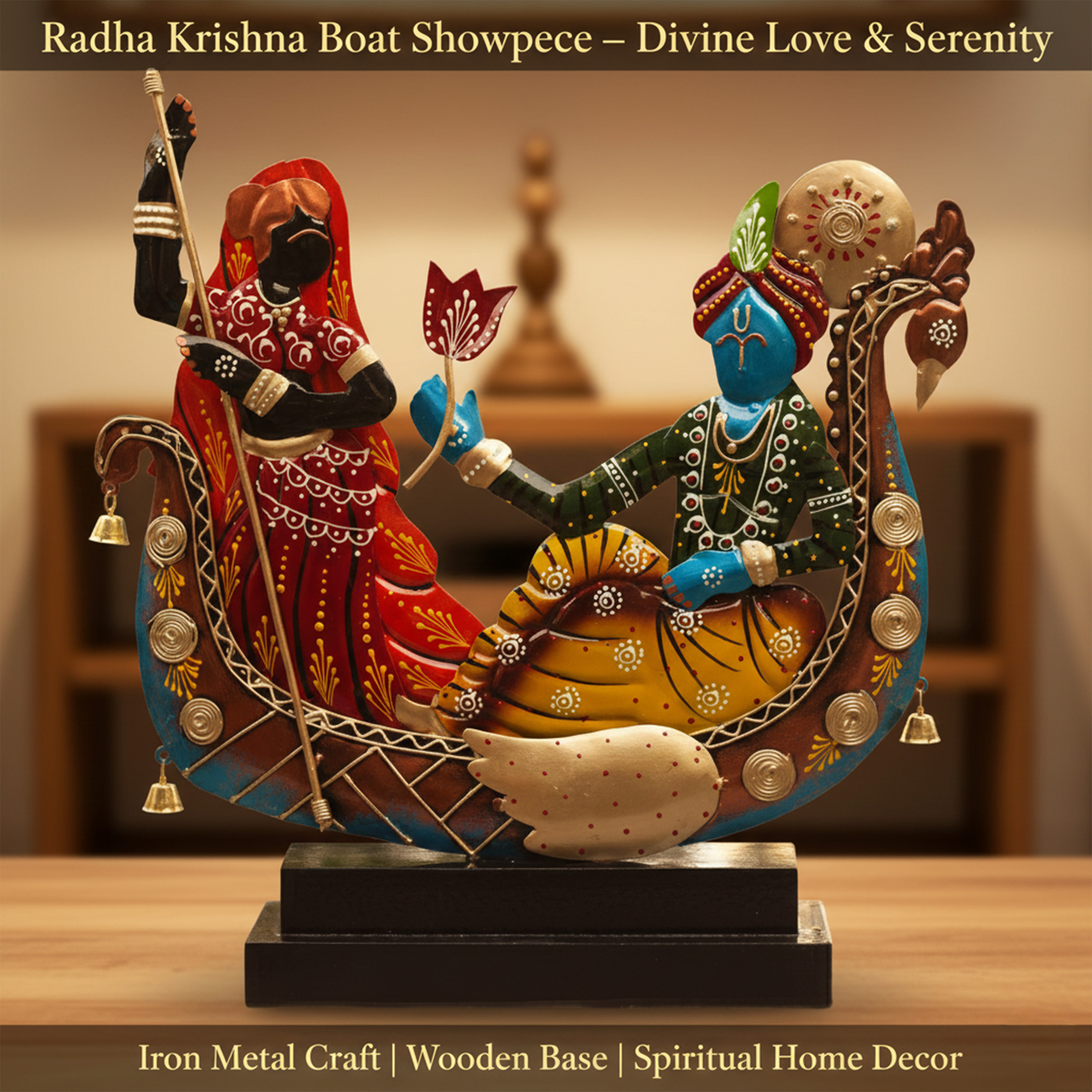 Bring peace, love, and spiritual harmony into your home with this beautifully handcrafted Radha Krishna iron metal showpiece, designed to create a calm and devotional atmosphere. Depicting Lord Krishna and Radha seated together on a boat, this artistic piece represents eternal love, companionship, and the spiritual journey of the soul guided by faith and devotion.