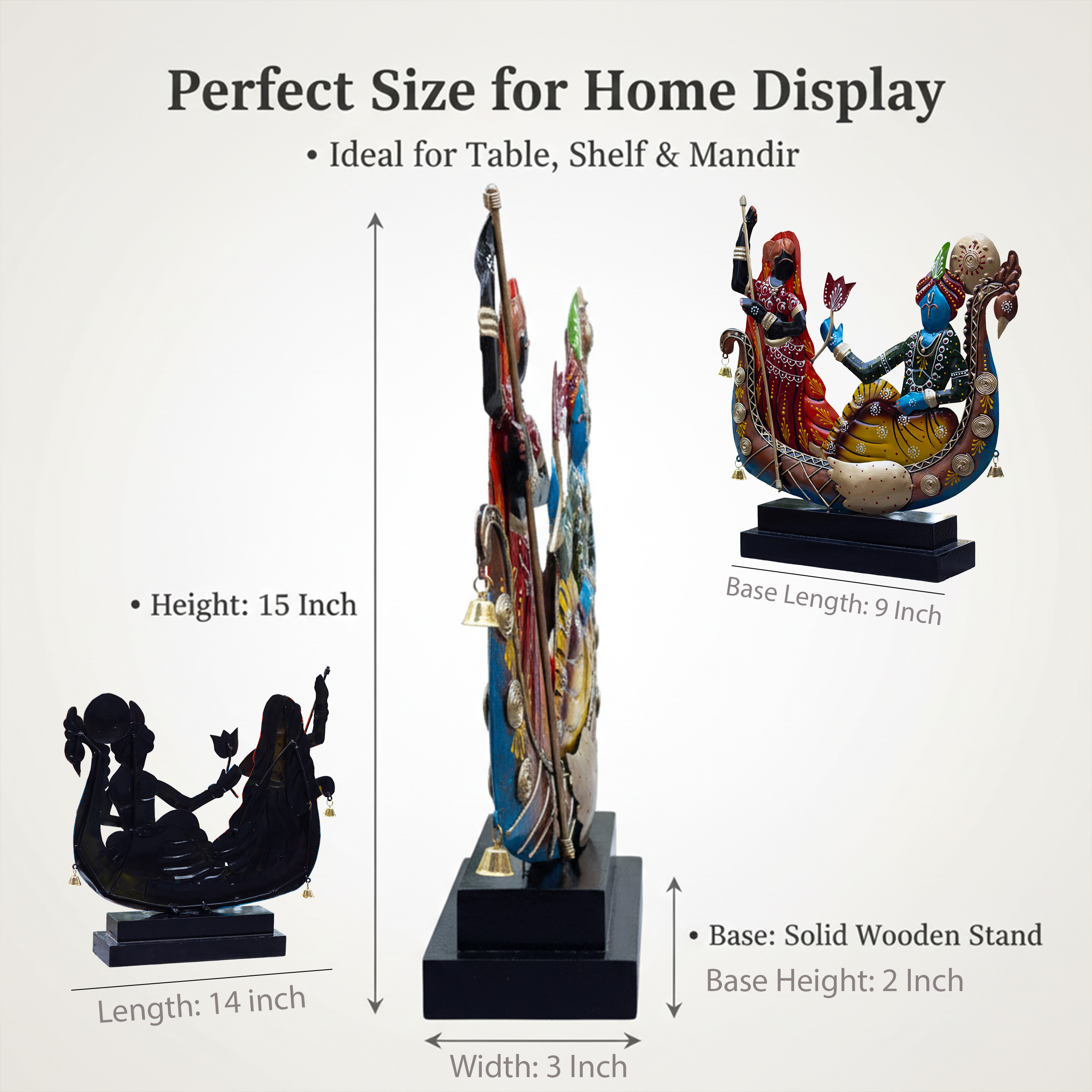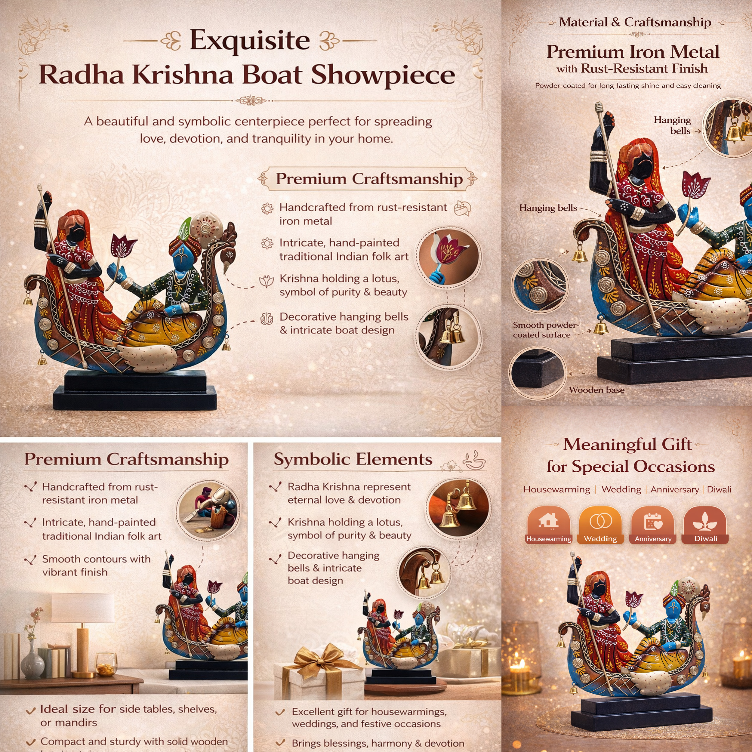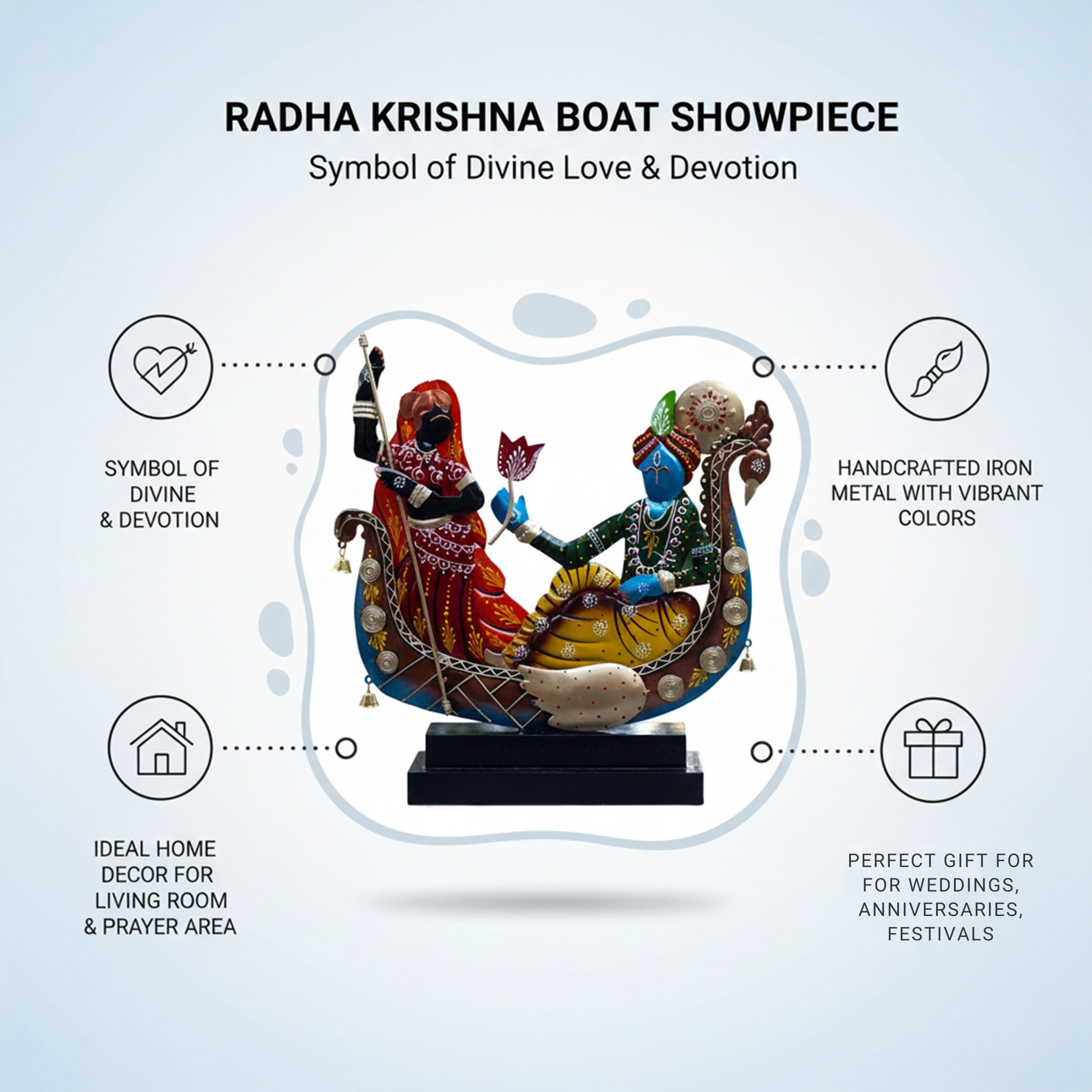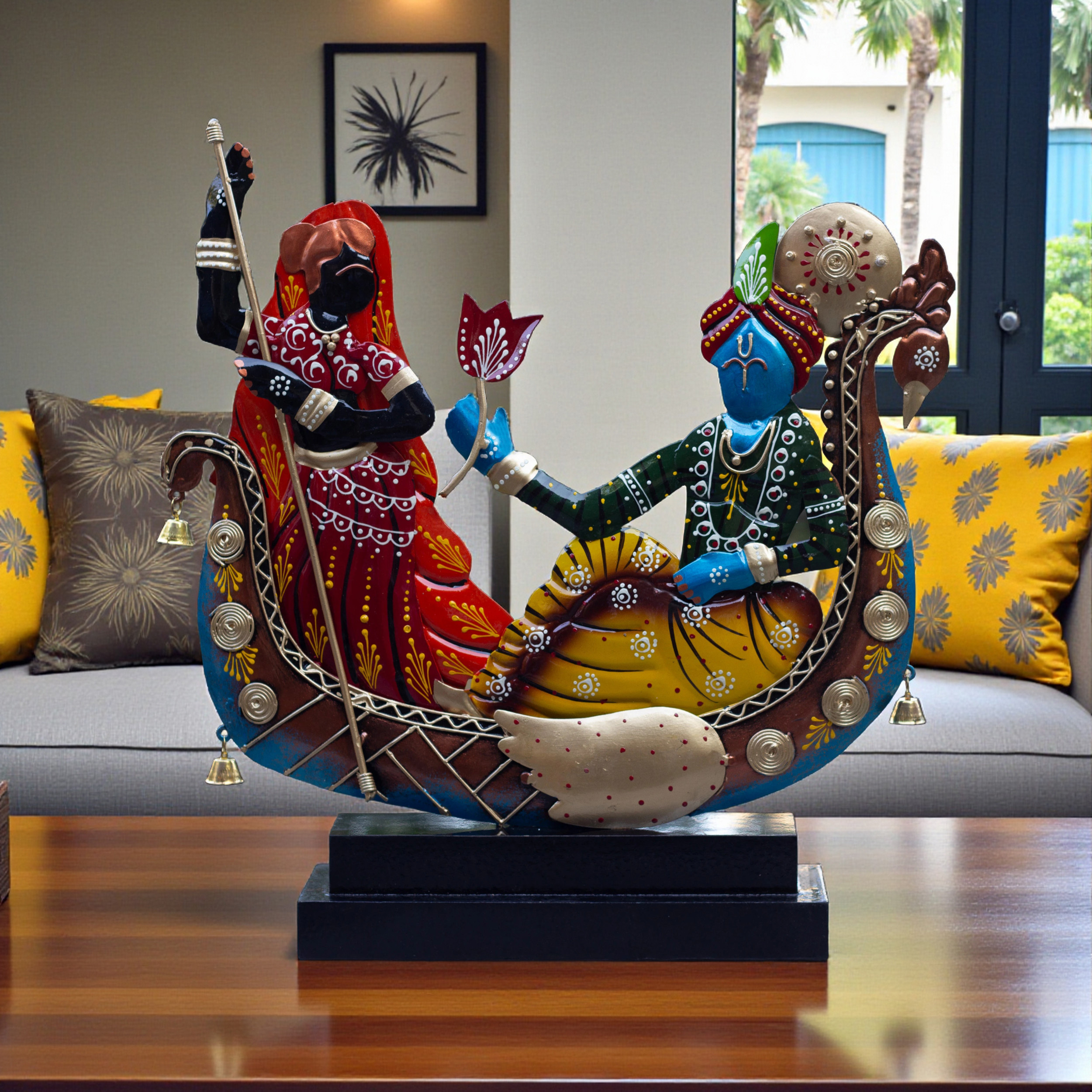Bring peace, love, and spiritual harmony into your home with this beautifully handcrafted Radha Krishna iron metal showpiece, designed to create a calm and devotional atmosphere. Depicting Lord Krishna and Radha seated together on a boat, this artistic piece represents eternal love, companionship, and the spiritual journey of the soul guided by faith and devotion.