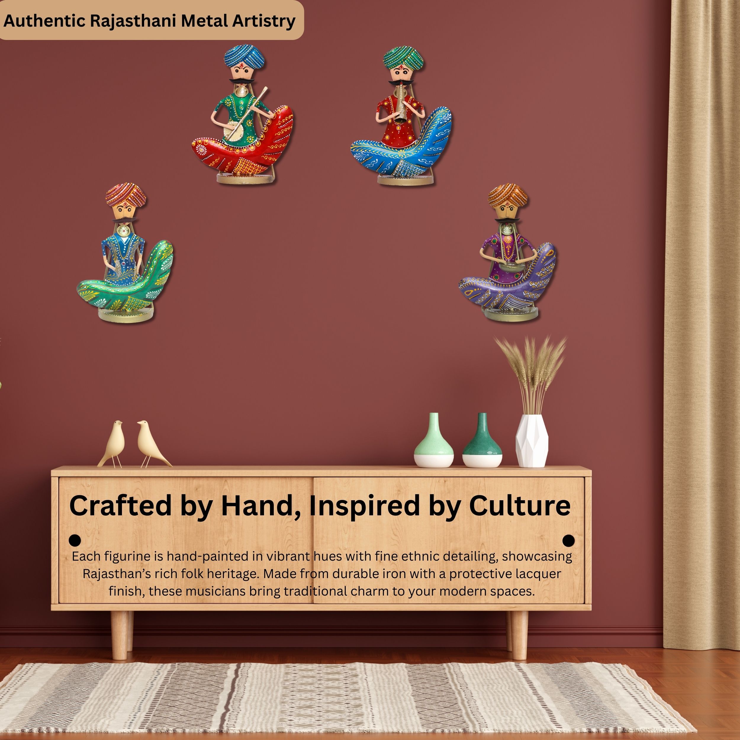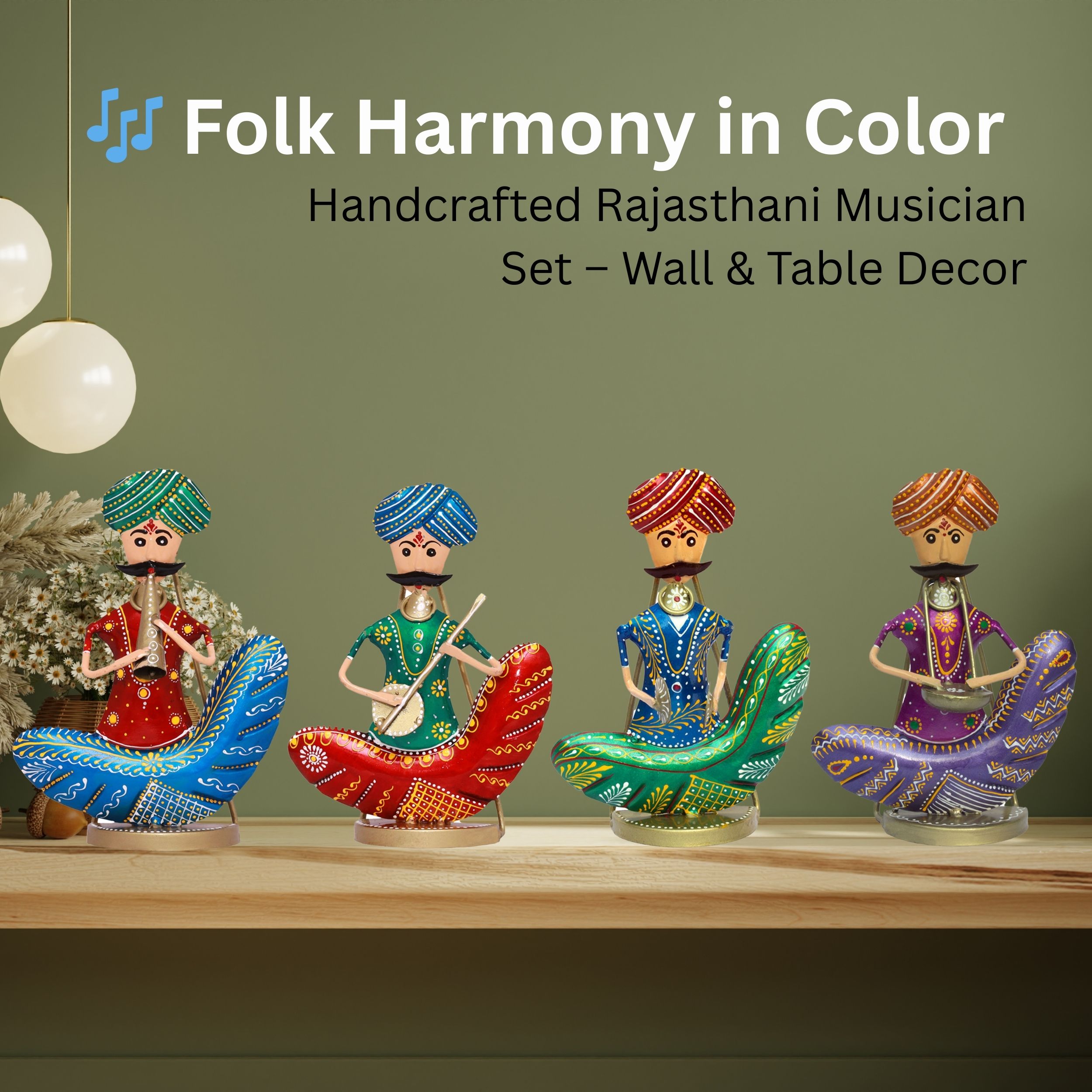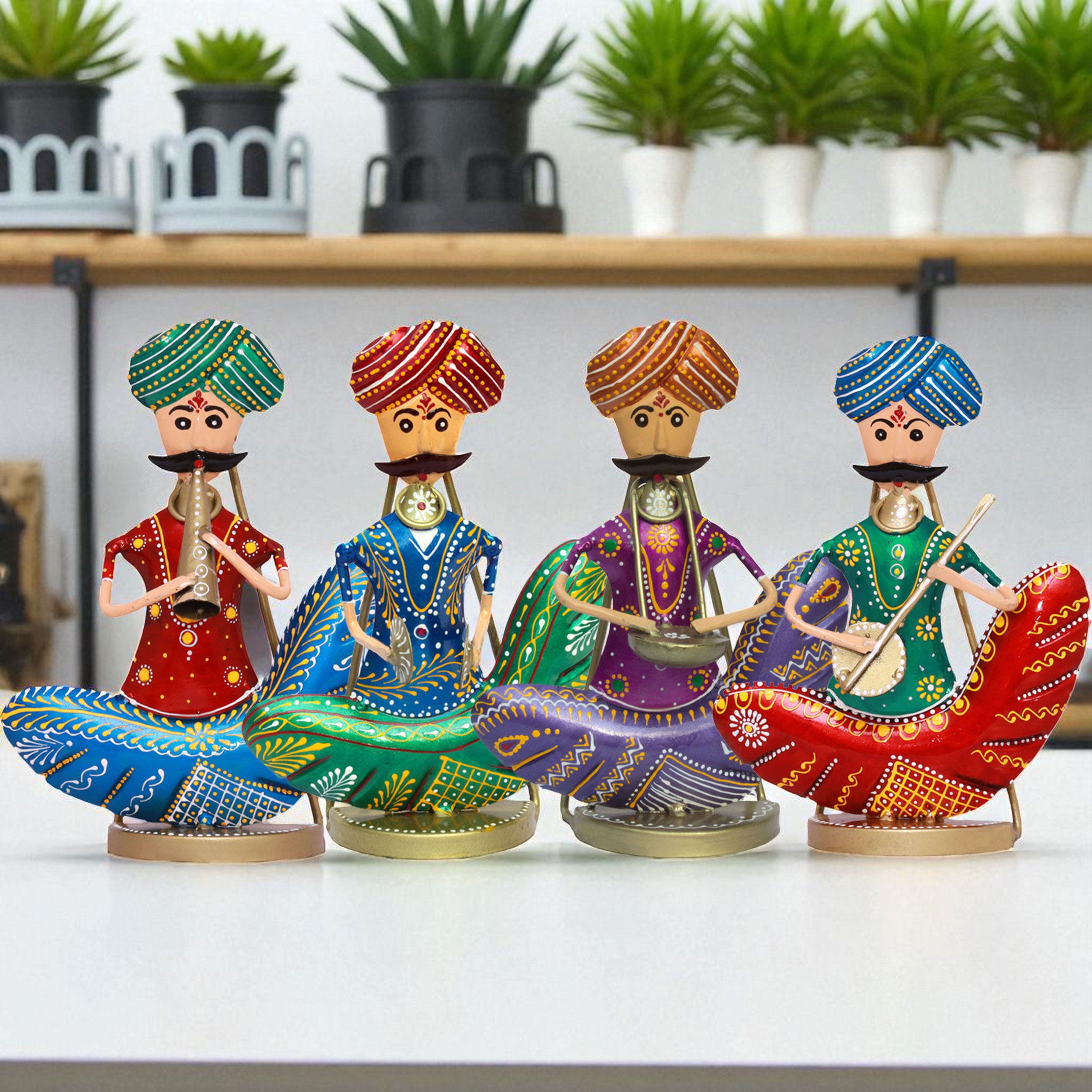 Celebrate India’s rich folk heritage with the Rhythms of Rajasthan Metal Musician Set, a pack of four handcrafted iron figurines that bring the spirit of traditional music into your home. Designed as both wall hangings and tabletop showpieces, each musician is painted in vibrant colors with intricate detailing, showcasing classic Rajasthani attire and folk instruments.