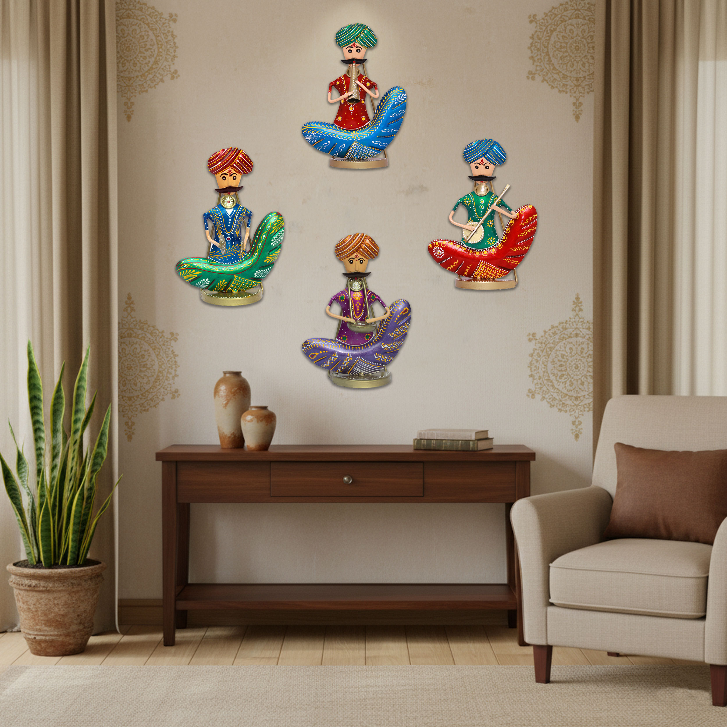 The Maharaja Mehfil Musicians: Set of 4 Metal Musician Showpieces – Rajasthani Wall Hanging & Table Top Home Decoration Items
