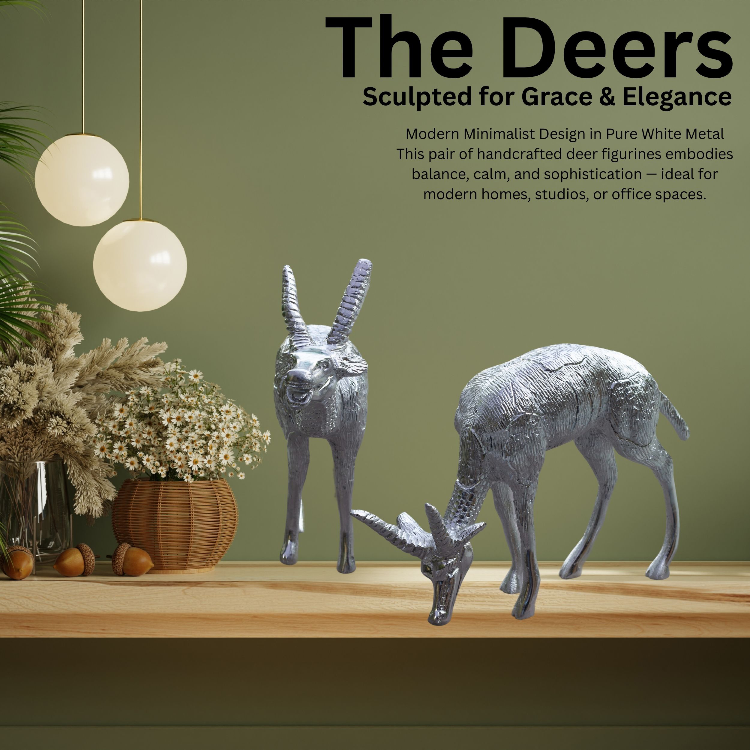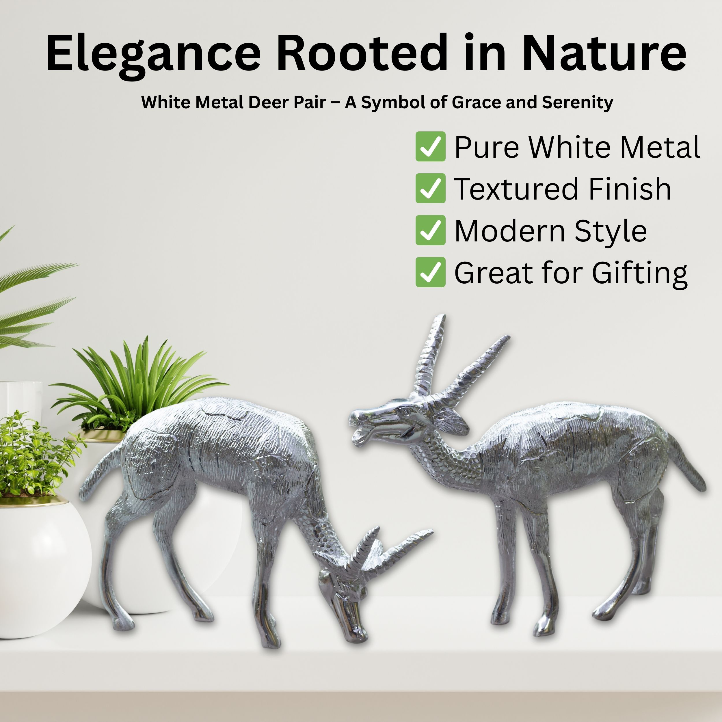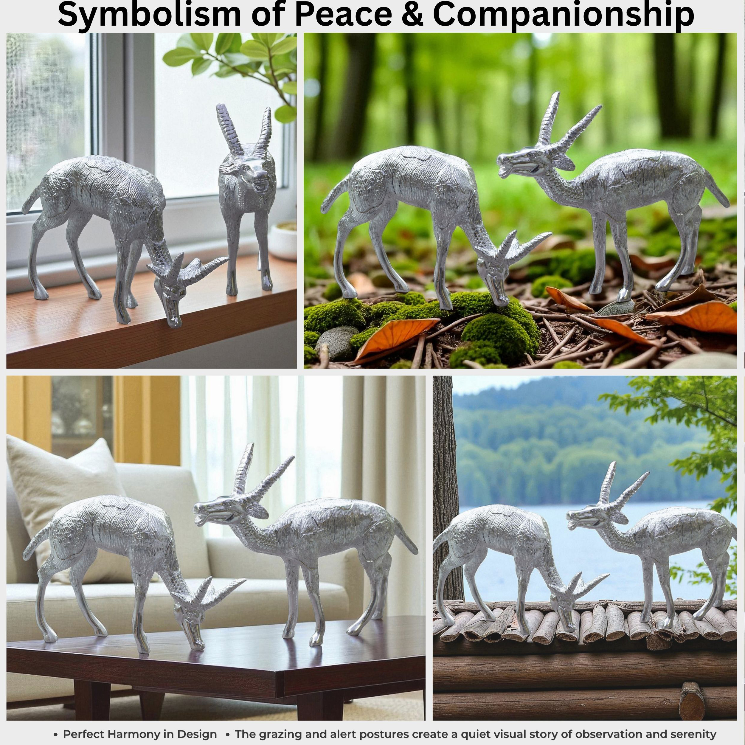 Add a touch of elegance and cultural artistry to your home with this Set of 2 White Metal Deer Figurines, finely handcrafted to embody grace, companionship, and timeless style. Made from pure white metal, these showpieces carry a smooth silver finish with a textured surface that mimics natural fur, enhancing their realistic yet artistic look. The pair includes one deer grazing peacefully and the other standing alert, symbolizing harmony, balance, and quiet strength.
