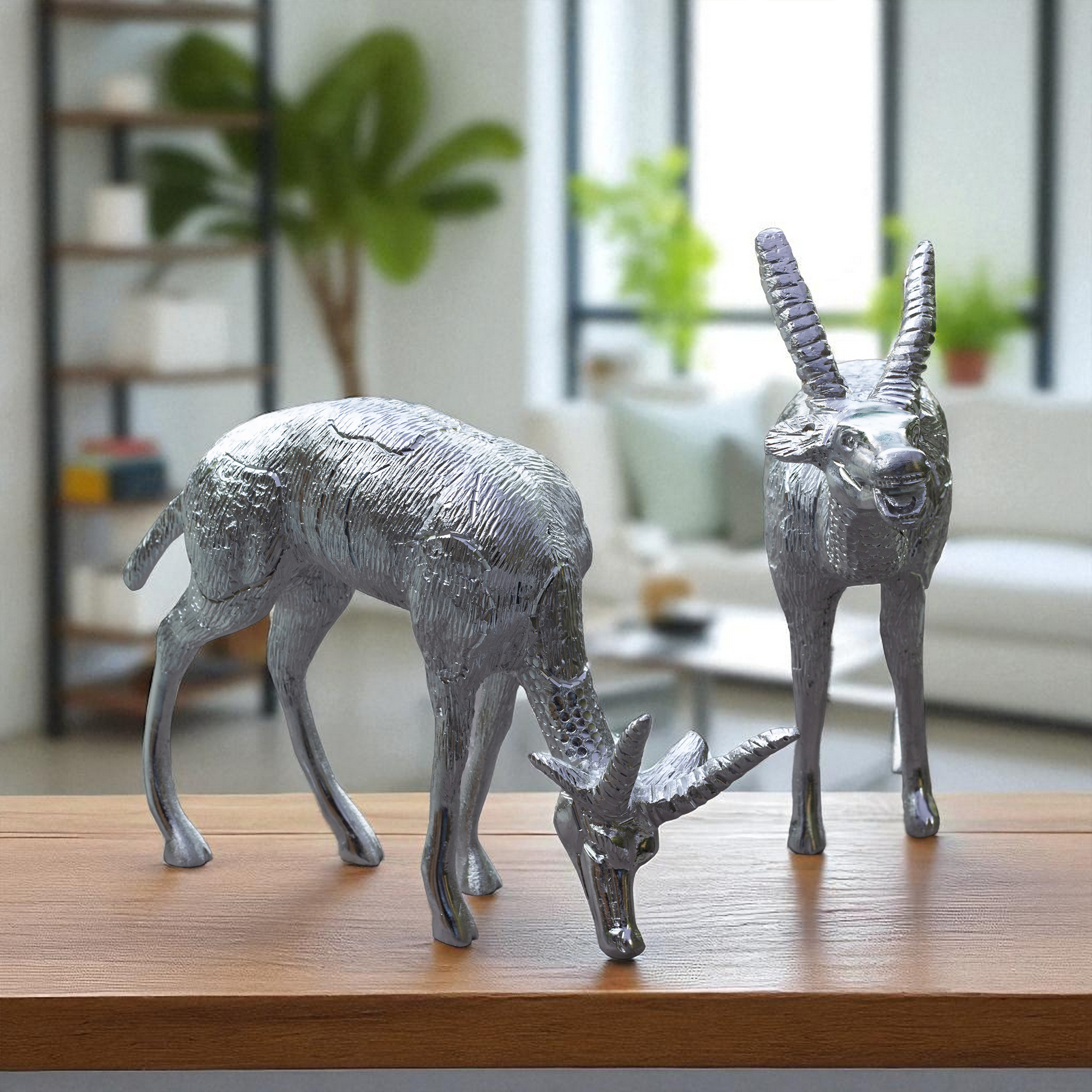 These decorative deer statues are ideal for living room decor, entrance decoration, office interiors, or as a centerpiece for festive arrangements. They are also widely used in Vastu and Feng Shui for attracting peace, prosperity, and good energy into homes and workplaces. Their artistic design makes them suitable for display on coffee tables, sideboards, or as statement pieces in lobbies and reception areas.