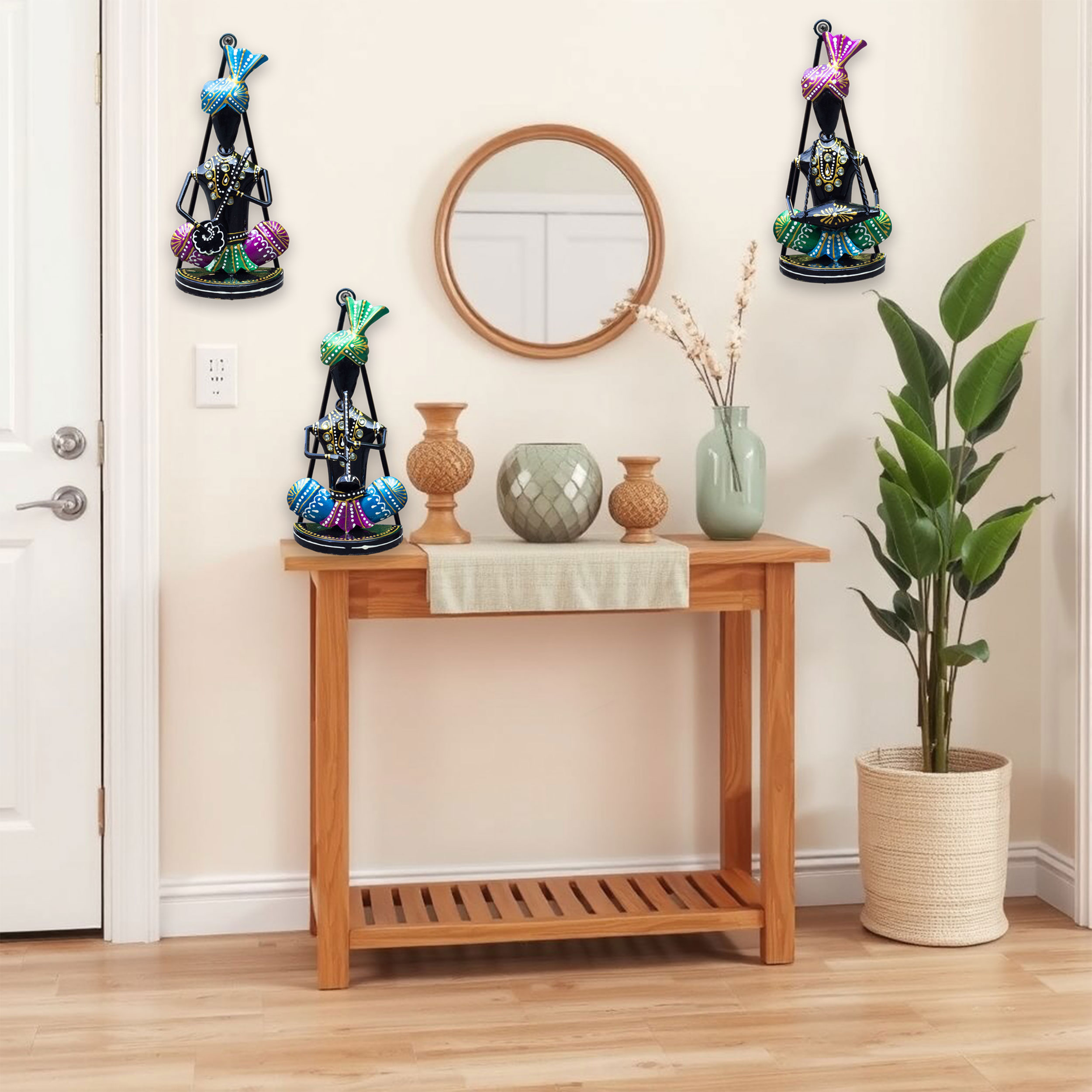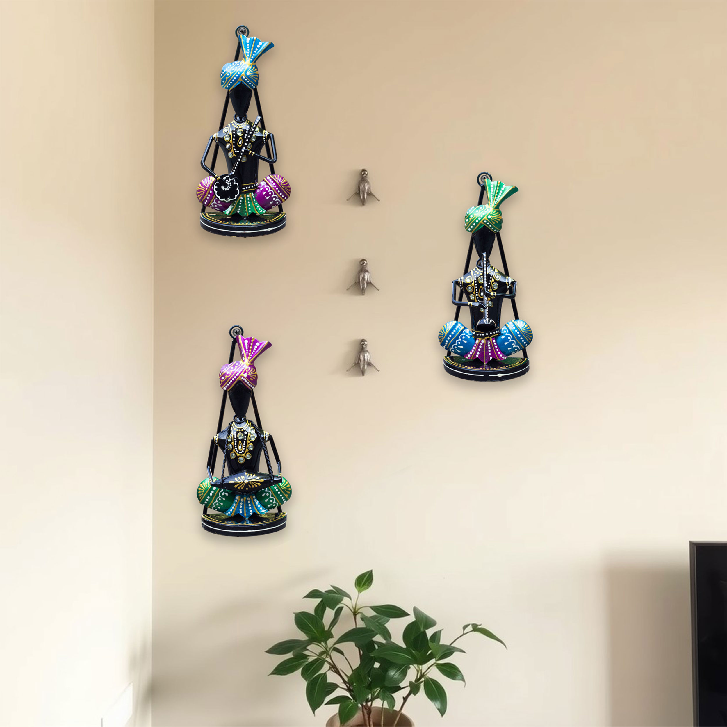 Set of 3 Rajasthani Folk Musician Wall Hanging Showpieces – Hand Painted Metal Figurines for Wall and Traditional Table Decor for Housewarming and Festive Gifting