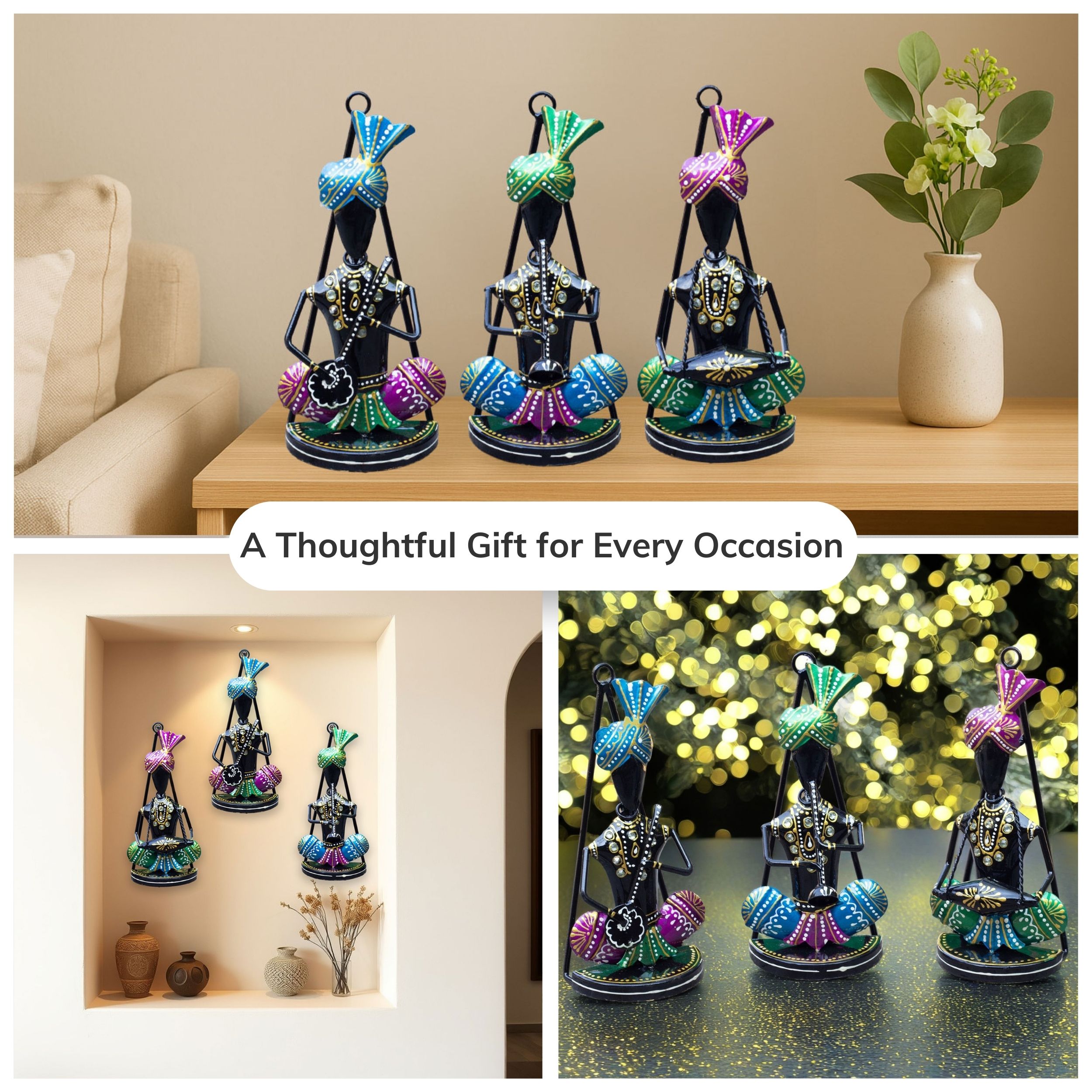 Handcrafted Rajasthani Elegance: Each musician is hand-carved and hand-painted by skilled artisans, reflecting authentic Indian folk art traditions.