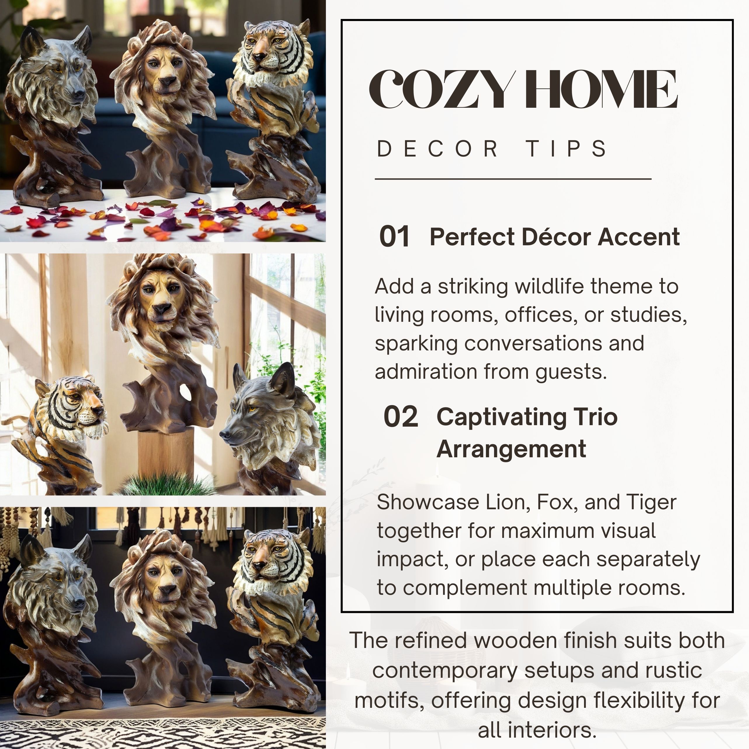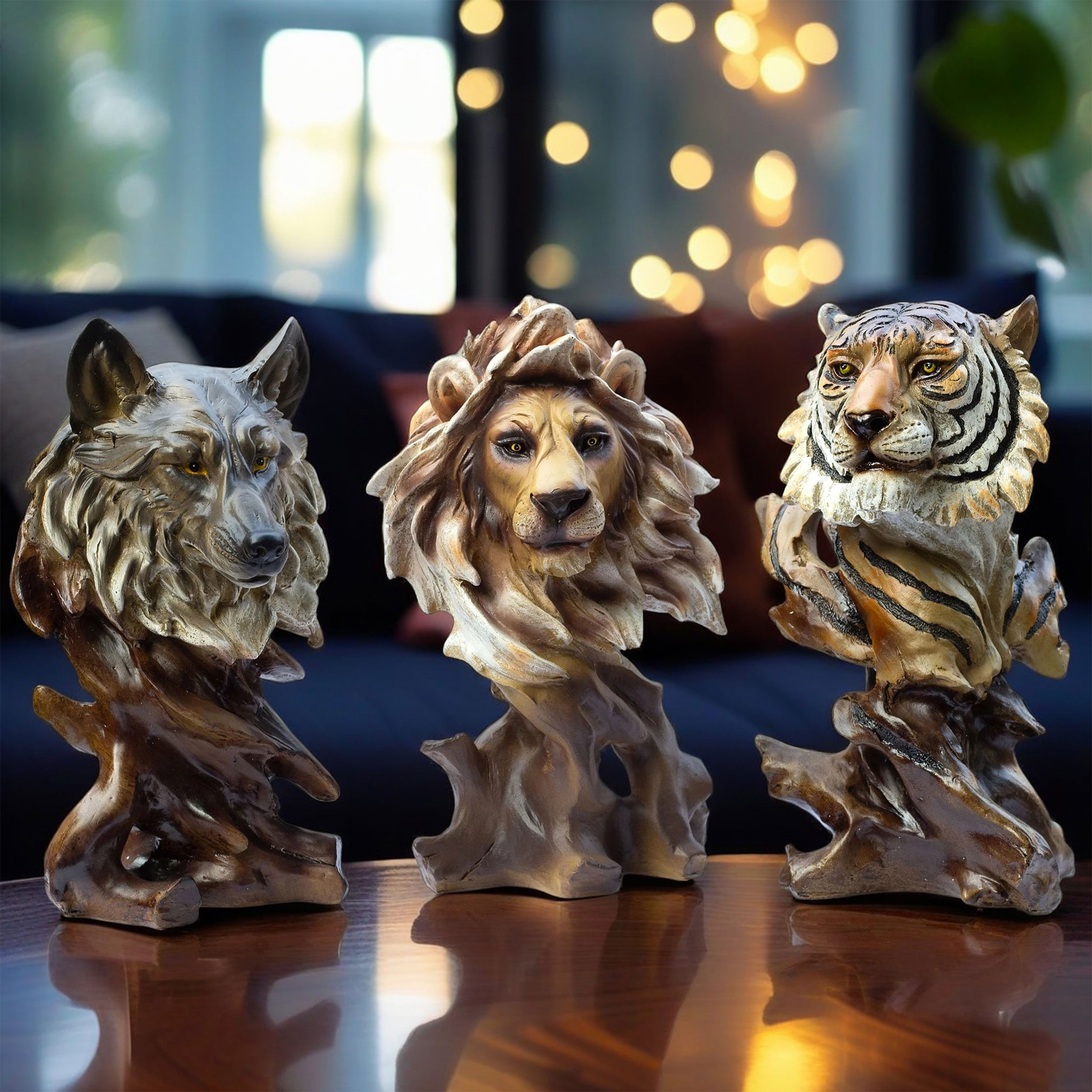 These animal showpieces make a powerful statement in any setting, whether you are decorating a living room, an office, or a cozy study. The Lion brings regal confidence, the Fox embodies sly intelligence, and the Tiger exudes raw strength. Arrange them together for a striking trio that celebrates the beauty of wildlife, or place each figurine separately to create subtle yet elegant accents around your home.