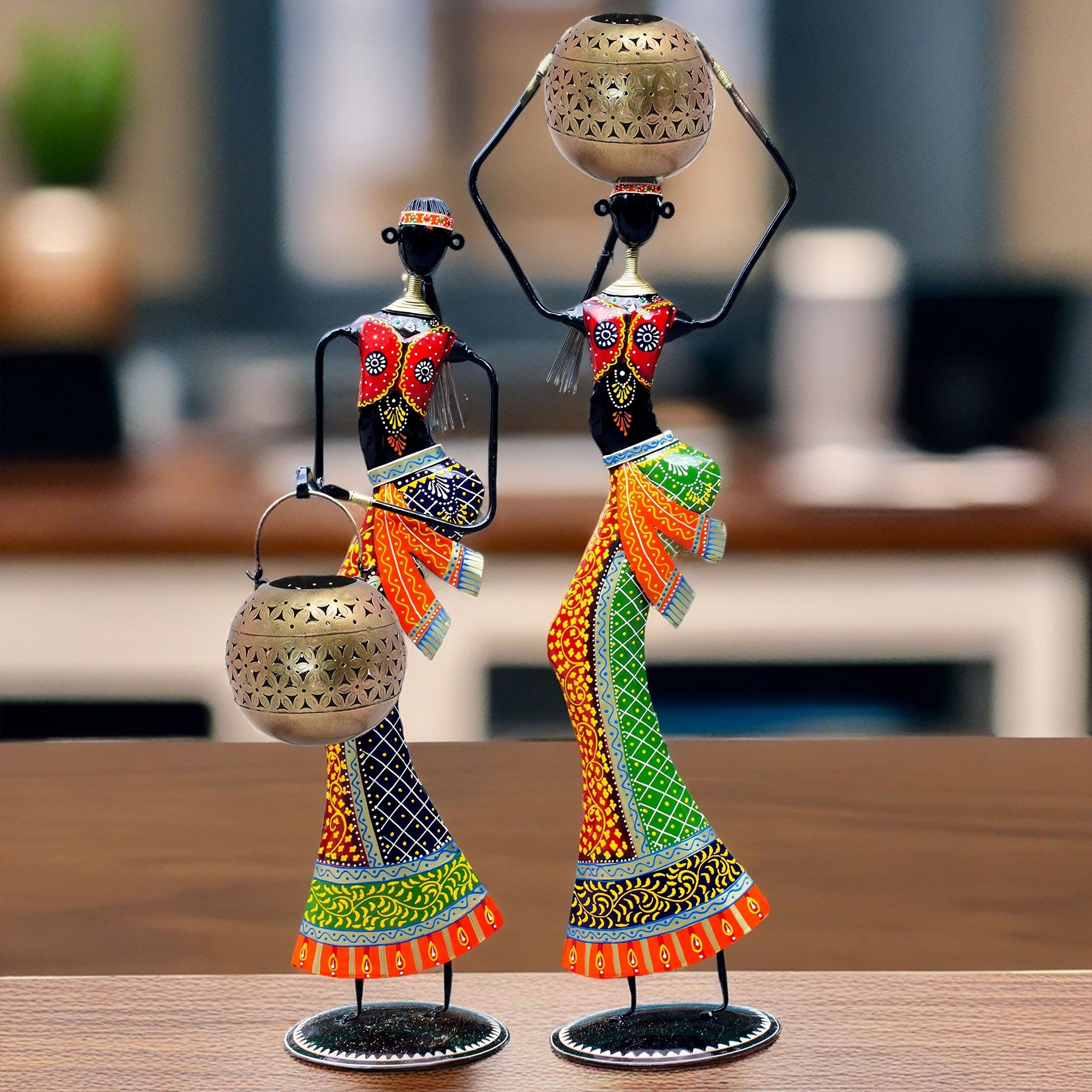 Handcrafted Iron Metal Showpiece Set for Home Décor: Beautifully hand-painted tribal lady figurines made from durable iron metal. A premium Indian handicraft showpiece perfect for living room, tabletop decor, hallway, balcony, or entrance home decoration.