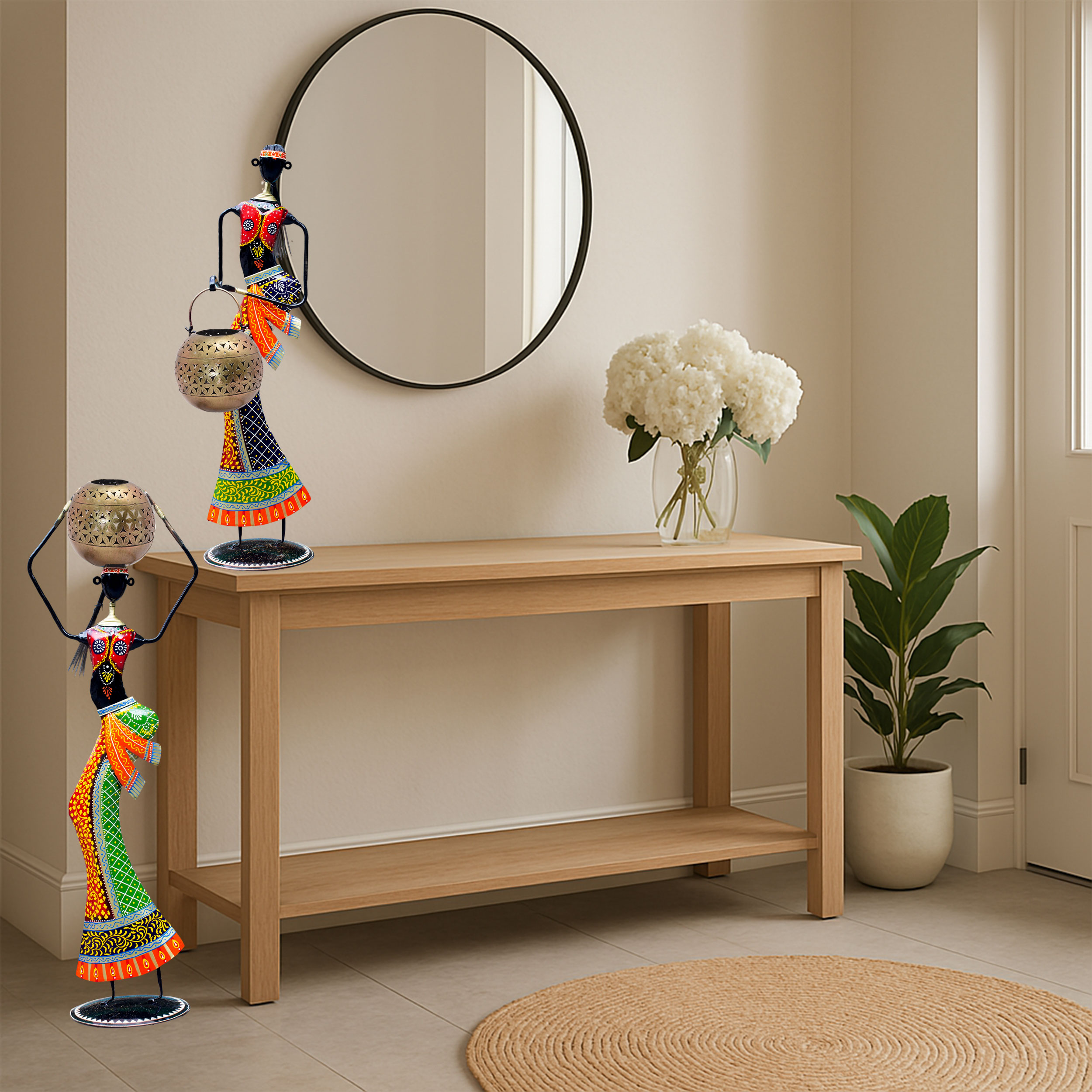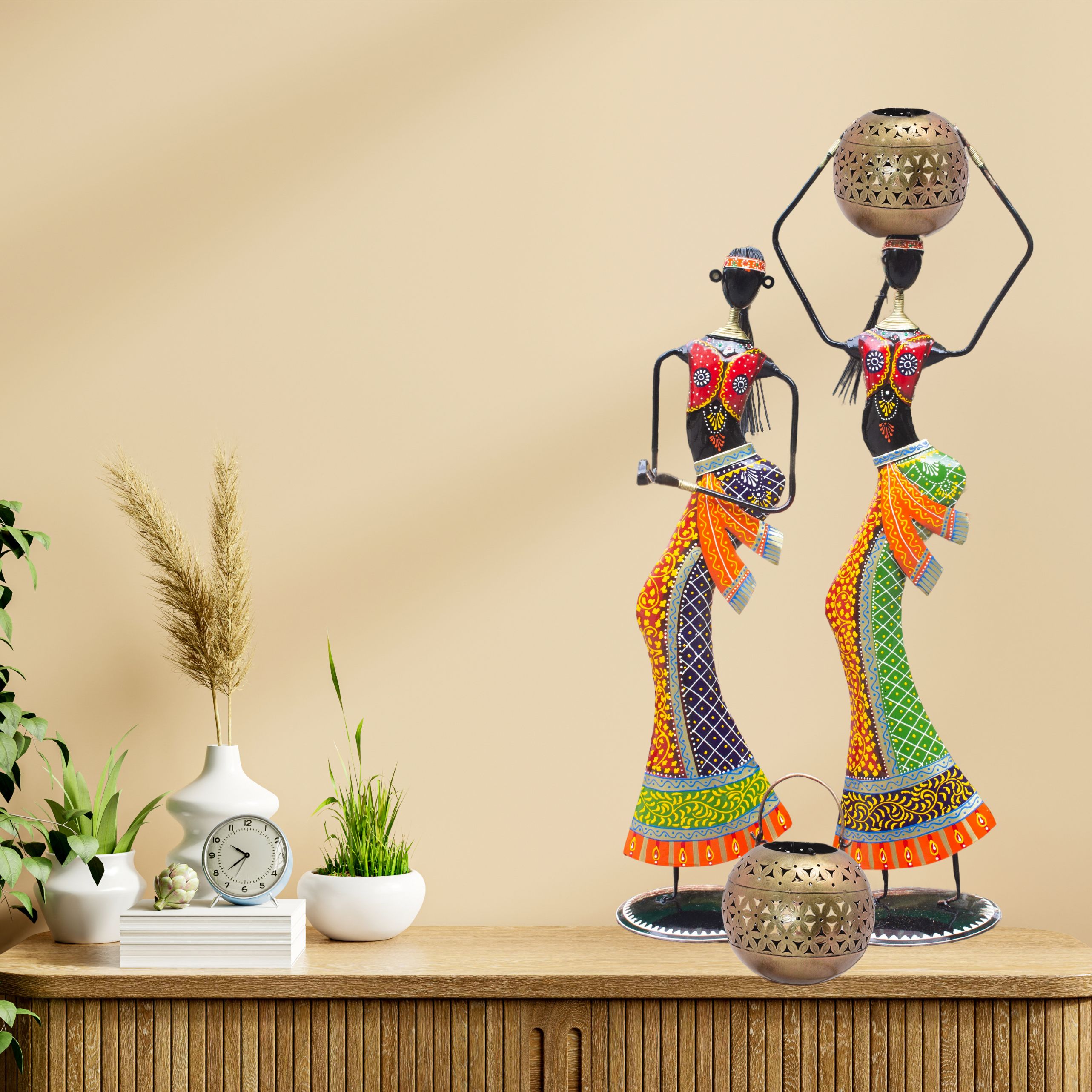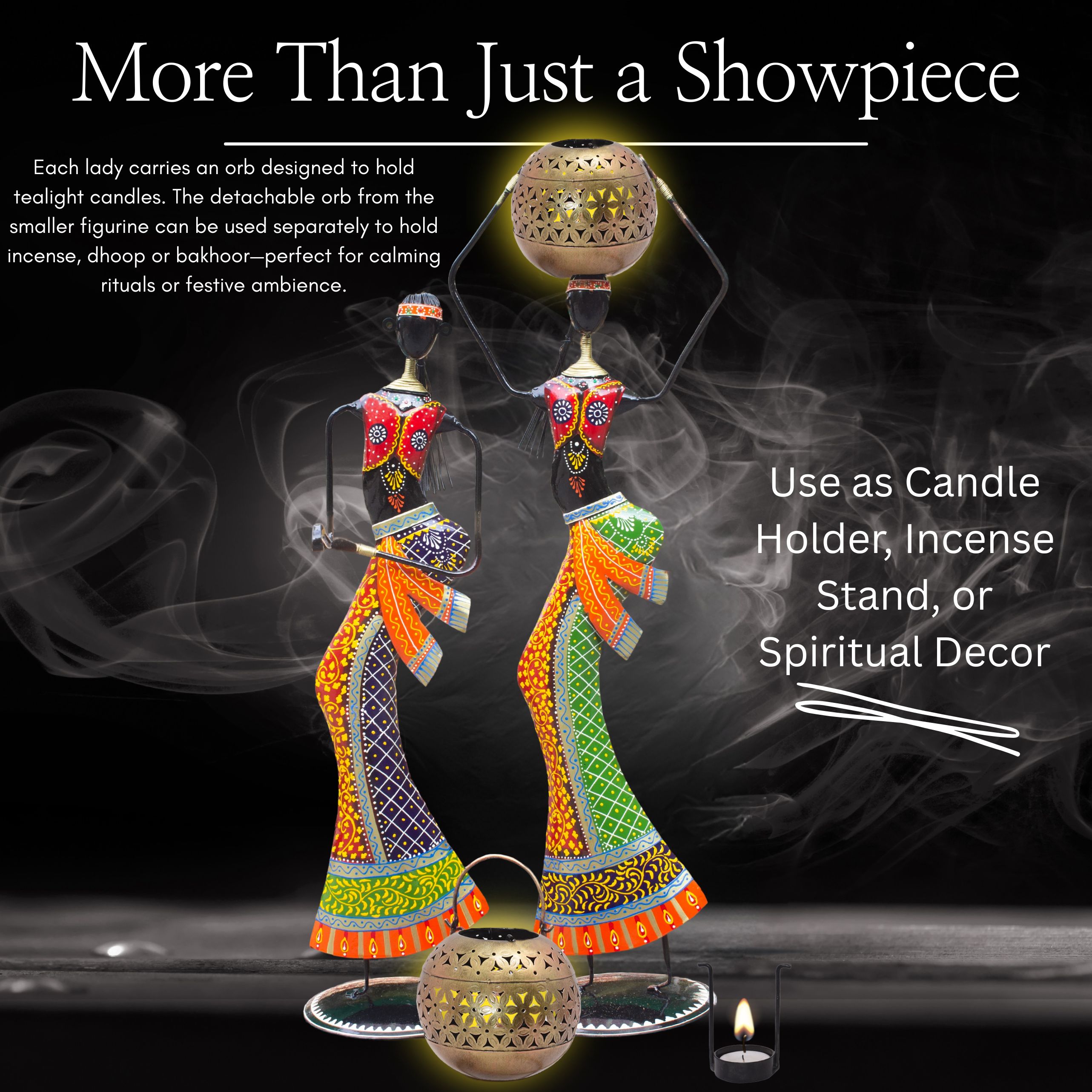 Bring home a touch of traditional Indian artistry with this stunning set of 2 handcrafted iron metal showpieces featuring tribal women carrying intricately designed tealight holder orbs. These tall and graceful figurines, painted in vibrant Rajasthani colors, double up as decorative candle holders and incense burners.
