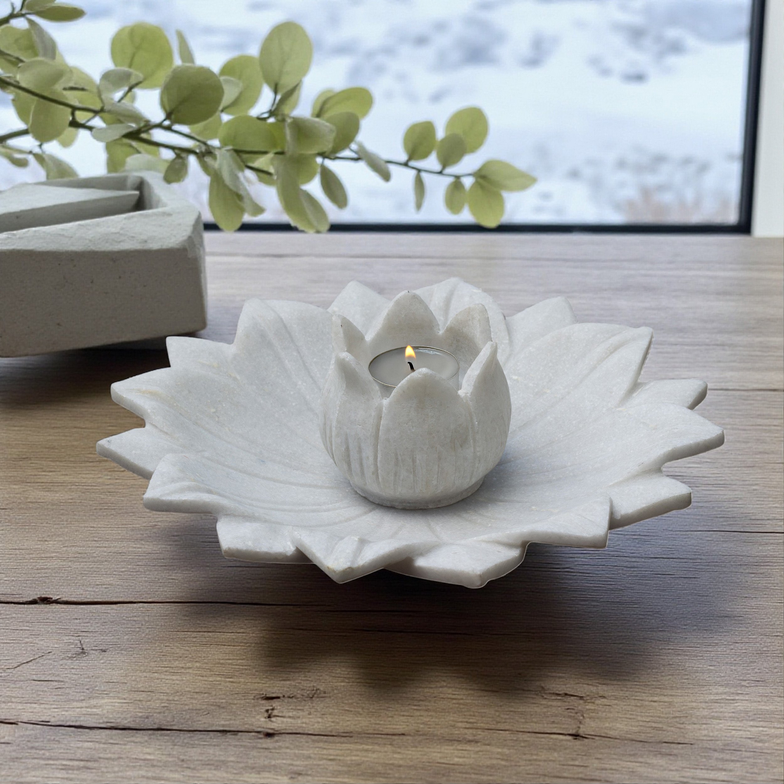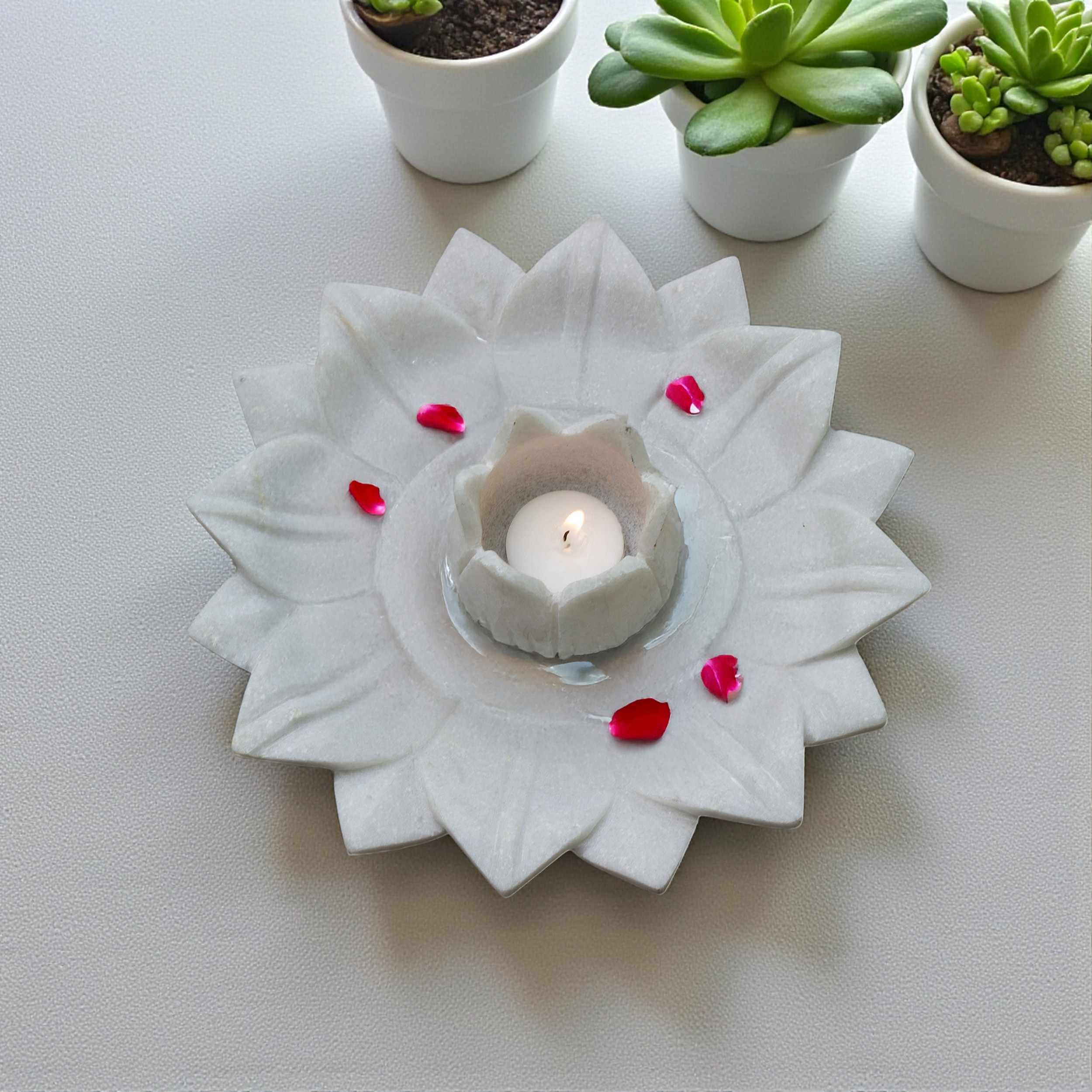 Illuminate your home with the timeless elegance of this 9 inch wide White Marble Lotus Plate with 3 inch Lotus Diya Candle Holder — a handcrafted décor piece that blends artistry, spirituality, and sophistication. Made from pure white marble, this lotus-shaped plate with a matching diya is a stunning centerpiece for your living room, pooja room, or festive display.